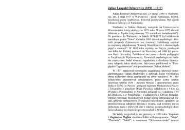 Julian Leopold Ochorowicz (1850 – 1917) Julian Leopold Ochorowicz (ur. 23 lutego 1850 w Radzyminie, zm. 1 maja 1917 w Warszawie) – polski wynalazca, filozof, psycholog, poeta i publicysta. Teoretyk pozytywizmu. Był synem Juliana i Jadwigi z d. Sumińskiej. Studiował w Szkole Głównej, następnie na Uniwersytecie Warszawskim, który ukończył w 1871 roku. W roku 1873 obronił doktorat w Lipsku (zatytułowany "O warunkach świadomości"). Po powrocie do Warszawy, w latach 1874-1875 był redaktorem naczelnym pisma "Niwa". Od roku 1881 docent psychologii i filozofii przyrody (Uniwersytet we Lwowie). Habilitację uzyskał za rozprawę zatytułowaną "Rozwój filozoficznych i chemicznych pojęć o atomach". W 1882 roku wysłany do Paryża, przebywał tam kilka lat. Później powrócił do Warszawy, od 1900 był prezesem Kasy Literackiej. Publikował swe prace z działu pedagogiki w Encyklopedii Wychowawczej. Prowadził psychologiczne badania empiryczne, badał również zagadnienia z dziedziny hipnotyzmu, telepatii, także okultyzmu. Jako poeta publikował w "Przeglądzie Tygodniowym" pod pseudonimem "Julian Mohort". W 1877 opracował teoretyczne zagadnienie telewizji monochromatycznej (ekran zbudowany z żarówek, które wyświetlają obraz nadawany obraz zamieniony na zbiór punktów). W 1885 kilkakrotnie prezentował udoskonalony przez siebie telefon [pierwszy telefon 1834 - Antonio Meucci - opatentowany przez Bella w 1876] (w Paryżu - połączył budynek Ministerstwa Poczty i Telegrafów z gmachem Opery Paryskiej oddalonym o 4 km, na Wystawie Powszechnej w Antwerpii połączył się z oddaloną o 45 km Brukselą, a w Petersburgu - z oddalonym o 320 km Bołgoje). Oprócz rozważań filozoficznych podjął szereg interesujących badań, głównie technicznych (wynalazki mikrofonów, aparatów do przenoszenia na odległość dźwięku i światła, stąd uważany jest za prekursora radia i telewizji) oraz z zakresu parapsychologii (dużo doświadczeń z tej dziedziny przeprowadzał w Wiśle). Do Wisły przyjechał po raz pierwszy w 1899 roku. Wspólnie z Bogdanem Hoffem zbudował kilka willi-pensjonatów: "Maja", "Placówka", "Sokół", a murowana "Ochorowiczówka" istnieje do dnia dzisiejszego na ul. Ochorowicza (na Dzielnicach). Dużo fotografował. Zapraszał znamienitych gości m.in. Bolesława Prusa (to na jego cześć jedną z willi nazwał "Placówką"), Stanisława Reymonta (w Wiśle napisał on pierwszy tom "Chłopów"). W 1905, razem z ks. bp. Bursche i Bogdanem Hoffem był współzałożycielem Towarzystwa Miłośników Wisły. Bibliotece wiślańskiej ofiarował ok. 600 tomów książek. Jego zasługi do rozwoju Wisły jako letniska są bardzo duże. Mieszkając w Wiśle nie przerywał swojej pracy naukowej - w specjalnie wybudowanym laboratorium przeprowadzał szereg doświadczeń z zakresu hipnozy, mediuizmu co nie zawsze podobało się mieszkańcom. Pojawił się także w postaci Juliana Ochockiego w "Lalce" Bolesława Prusa (z którym się przyjaźnił). Twierdził, że pozytywistą można nazwać każdego, czyje doświadczenia oparte są dającymi się sprawdzić faktami - człowieka, który nie dyskutuje nad prawami wątpliwymi bez należytych kwalifikacji i który nigdy nie mówi o rzeczach niedostępnych.