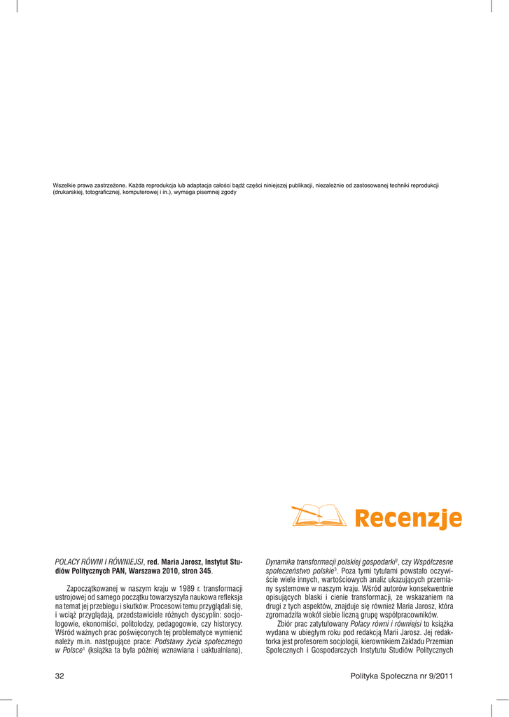 Wszelkie prawa zastrzeżone. Każda reprodukcja lub adaptacja całości bądź części niniejszej publikacji, niezależnie od zastosowanej techniki reprodukcji (drukarskiej, totograficznej, komputerowej i in.), wymaga pisemnej zgody POLACY RÓWNI I RÓWNIEJSI, red. Maria Jarosz, Instytut Studiów Politycznych PAN, Warszawa 2010, stron 345. Zapoczątkowanej w naszym kraju w 1989 r. transformacji ustrojowej od samego początku towarzyszyła naukowa refleksja na temat jej przebiegu i skutków. Procesowi temu przyglądali się, i wciąż przyglądają, przedstawiciele różnych dyscyplin: socjologowie, ekonomiści, politolodzy, pedagogowie, czy historycy. Wśród ważnych prac poświęconych tej problematyce wymienić należy m.in. następujące prace: Podstawy życia społecznego w Polsce1 (książka ta była później wznawiana i uaktualniana), 32 Dynamika transformacji polskiej gospodarki2, czy Współczesne społeczeństwo polskie3. Poza tymi tytułami powstało oczywiście wiele innych, wartościowych analiz ukazujących przemiany systemowe w naszym kraju. Wśród autorów konsekwentnie opisujących blaski i cienie transformacji, ze wskazaniem na drugi z tych aspektów, znajduje się również Maria Jarosz, która zgromadziła wokół siebie liczną grupę współpracowników. Zbiór prac zatytułowany Polacy równi i równiejsi to książka wydana w ubiegłym roku pod redakcją Marii Jarosz. Jej redaktorka jest profesorem socjologii, kierownikiem Zakładu Przemian Społecznych i Gospodarczych Instytutu Studiów Politycznych Polityka Społeczna nr 9/2011 PAN. Jej dorobek naukowy obejmuje blisko 30 książek, których jest autorką lub redaktorem, i około 300 artykułów, wydanych w Polsce i za granicą. Celem recenzowanej pracy jest próba opisu i analizy ważnych problemów, jakie pojawiły się w czasie transformacji ustrojowej w Polsce: zmianom w obrębie struktury społecznej, nierównościom materialnym i edukacyjnym, nieznanym kręgom bogactwa, strategiom podejmowanym przez gospodarstwa domowe, migracjom, związkom zawodowym, populizmowi w polityce, zaufaniu społecznemu i nierównościom związanym z płcią. Cechą wspólną wszystkich tekstów zamieszczonych w zbiorze jest próba obiektywnej i niezależnej analizy socjologicznej. Wyważonemu i w miarę obiektywnemu obrazowi rzeczywistości służą profesjonalne socjologiczne metody analizy. Chodzi tu o (fachowe i rzetelne) posługiwanie się źródłowymi danymi statystycznymi i materiałami analitycznymi (…) napisała Maria Jarosz we Wstępie (s. 14). Recenzowana praca składa się ze wstępu, dziewięciu rozdziałów i zakończenia oraz krótkiego podsumowania w języku angielskim i not o autorach. Ciekawość czytelnika wzbudzi zapewne już sam tytuł książki, wskazujący, że Polacy są „równi i równiejsi”. Daje on do zrozumienia, że nie wszyscy obywatele naszego kraju w równym stopniu skorzystali z owoców przemian ustrojowych po 1989 r. – niektórzy stali się „wygranymi”, a inni „przegranymi” polskiej transformacji. Zresztą ten podział pojawia się często w analizach autorów tomu. Czas przemian systemowych, o czym pisze Maria Jarosz we Wstępie, charakteryzował się wieloma sukcesami – Polska stała się członkiem NATO i Unii Europejskiej, kraj przeszedł od gospodarki nakazowo-rozdzielczej do rynkowej, instytucje społeczne poddano procesom demokratyzacji. Mimo tych pozytywnych zmian zaobserwowano też niekorzystne skutki transformacji: poszerzenie sfery ubóstwa, nasilenie procesów wykluczenia i marginalizacji. W efekcie przemian systemowych jedna trzecia mieszkańców naszego kraju popadła w biedę (najwyższy wskaźnik w Unii Europejskiej), zaobserwowano narastanie nierówności społecznych, a fakt urodzenia w konkretnej rodzinie nadal umożliwia lub ogranicza zdobycie wykształcenia i osiągnięcie pozycji społecznej. Transformacja ustrojowa doprowadziła do pogłębienia dysproporcji materialnych i społecznych pomiędzy osobami zajmującymi wysokie pozycje a tymi, którym się nie powiodło w czasie przemian. W pierwszym rozdziale zatytułowanym Klasy i warstwy we współczesnym społeczeństwie Leszek Gilejko analizuje przemiany zachodzące w obrębie struktury społecznej w naszym kraju: powstawanie i rozwoju nowych klas społecznych, nowe mechanizmy strukturotwórcze, wzrost zróżnicowań społecznych i poszerzenie obszaru ubóstwa. Autor wyraża przekonanie, że w przyszłości będziemy świadkami nasilania się konfliktów klasowych, spowodowanych postępującą pauperyzacją dużej części społeczeństwa. Drugi rozdział, Marka Kozaka, poświęcony jest dysproporcjom materialnym i edukacyjnym w Polsce. Autor zastanawia się nad rolą państwa w procesie wyrównywania wspomnianych dysproporcji. Ukazuje ich skalę między różnymi regionami, wewnątrz nich oraz nierówności w układzie miasto-wieś. Wskazuje także na potrzebę podjęcia przez władze państwowe polityki nadrabiania zaległości cywilizacyjnych i inwestowania w kapitał ludzki, szczególnie na terenach najuboższych, o najniższym kapitale społecznym. Podaje też wskaźnik upowszechnienia wychowania przedszkolnego na wsi i w mieście. Niestety, nie zamieszcza informacji na temat tego, jak on się kształtuje w układzie wojewódzkim, podczas gdy dane GUS ukazują duże zróżnicowania terytorialne pod tym względem. Niewątpliwie przyczyniają się one do dysproporcji cywilizacyjnych w Polsce. Kolejny rozdział nosi tytuł O nieznanych, z reguły nie badanych kręgach bogactwa. Autor Krzysztof Jasiecki analizuje mało Polityka Społeczna nr 9/2011 rozpoznany i niewątpliwie ważny problem tworzenia się w naszym kraju klasy ludzi bogatych. Zauważa, że badania tego typu są tematem rzadko podejmowanym, trudnym, ale też konfliktogennym. Dodatkowo prowadzenie analiz na ten temat utrudnia brak danych statystycznych na temat struktury dochodów osób najbogatszych czy odpowiedniej reprezentacji tych os