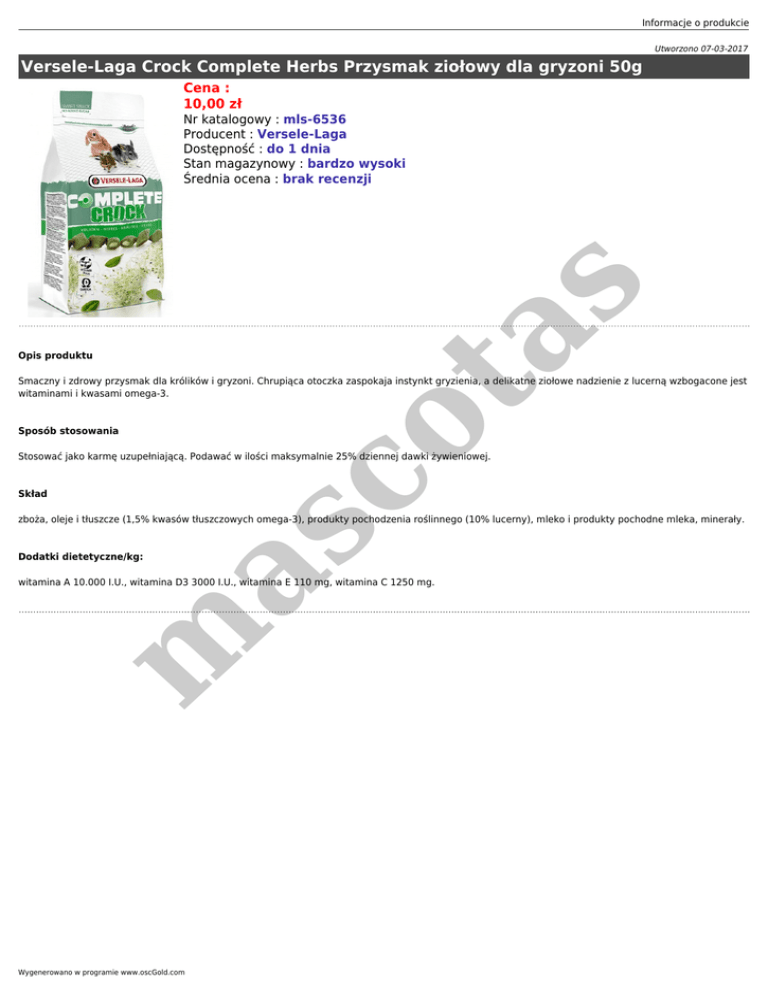Informacje o produkcie Utworzono 07-03-2017 Versele-Laga Crock Complete Herbs Przysmak ziołowy dla gryzoni 50g Cena : 10,00 zł Opis produktu co ta s Nr katalogowy : mls-6536 Producent : Versele-Laga Dostępność : do 1 dnia Stan magazynowy : bardzo wysoki Średnia ocena : brak recenzji Smaczny i zdrowy przysmak dla królików i gryzoni. Chrupiąca otoczka zaspokaja instynkt gryzienia, a delikatne ziołowe nadzienie z lucerną wzbogacone jest witaminami i kwasami omega-3. Sposób stosowania Stosować jako karmę uzupełniającą. Podawać w ilości maksymalnie 25% dziennej dawki żywieniowej. Skład m as zboża, oleje i tłuszcze (1,5% kwasów tłuszczowych omega-3), produkty pochodzenia roślinnego (10% lucerny), mleko i produkty pochodne mleka, minerały. Dodatki dietetyczne/kg: witamina A 10.000 I.U., witamina D3 3000 I.U., witamina E 110 mg, witamina C 1250 mg. Wygenerowano w programie www.oscGold.com