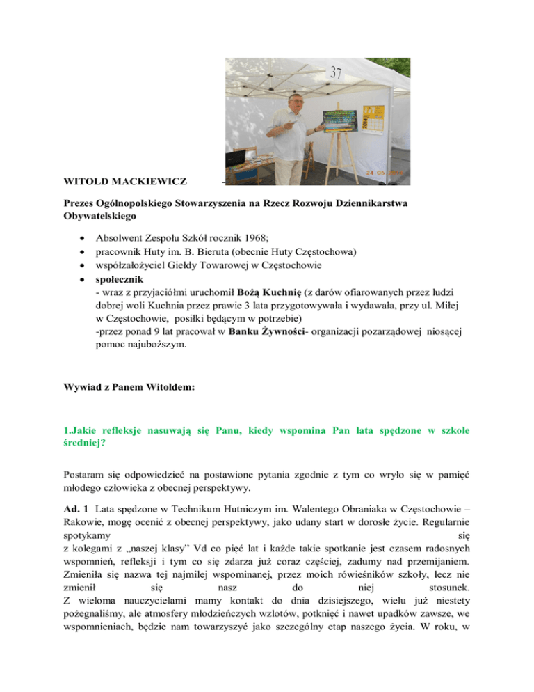 WITOLD MACKIEWICZ - Prezes Ogólnopolskiego Stowarzyszenia na Rzecz Rozwoju Dziennikarstwa Obywatelskiego Absolwent Zespołu Szkół rocznik 1968; pracownik Huty im. B. Bieruta (obecnie Huty Częstochowa) współzałożyciel Giełdy Towarowej w Częstochowie społecznik - wraz z przyjaciółmi uruchomił Bożą Kuchnię (z darów ofiarowanych przez ludzi dobrej woli Kuchnia przez prawie 3 lata przygotowywała i wydawała, przy ul. Miłej w Częstochowie, posiłki będącym w potrzebie) -przez ponad 9 lat pracował w Banku Żywności- organizacji pozarządowej niosącej pomoc najuboższym. Wywiad z Panem Witoldem: 1.Jakie refleksje nasuwają się Panu, kiedy wspomina Pan lata spędzone w szkole średniej? Postaram się odpowiedzieć na postawione pytania zgodnie z tym co wryło się w pamięć młodego człowieka z obecnej perspektywy. Ad. 1 Lata spędzone w Technikum Hutniczym im. Walentego Obraniaka w Częstochowie – Rakowie, mogę ocenić z obecnej perspektywy, jako udany start w dorosłe życie. Regularnie spotykamy się z kolegami z „naszej klasy” Vd co pięć lat i każde takie spotkanie jest czasem radosnych wspomnień, refleksji i tym co się zdarza już coraz częściej, zadumy nad przemijaniem. Zmieniła się nazwa tej najmilej wspominanej, przez moich rówieśników szkoły, lecz nie zmienił się nasz do niej stosunek. Z wieloma nauczycielami mamy kontakt do dnia dzisiejszego, wielu już niestety pożegnaliśmy, ale atmosfery młodzieńczych wzlotów, potknięć i nawet upadków zawsze, we wspomnieniach, będzie nam towarzyszyć jako szczególny etap naszego życia. W roku, w którym rozpoczynałem naukę w TH uruchomiono nowy kierunek tj: aparatura kontrolno pomiarowa i automatyka przemysłowo - mechaniczna. Obowiązywały wówczas egzaminy wstępne, a o jedno miejsce na ten wydział ubiegało się siedmiu kandydatów. Dla porównania na wydział mechaniczny pięciu, na walcownictwo i metalurgię po czterech. Dzień ogłoszenia wyników był dla mnie – i mówię to szczerze – najbardziej traumatycznym dniem w moim dotychczasowym życiu. Pragnienie nauki w tej szkole i na tym wydziale zderzała się z wysokim stopniem samooceny mojej niedoskonałości. Wyniki ogłaszał ówczesny dyrektor Pan Stefan Strojny. Wystraszona dziatwa ze swoimi rodzicami, lub samotnie oczekiwała na werdykt jak na wyrok. Pan Dyrektor umiał stopniować napięcie. Wyczytał kilka nazwisk wśród których nie było mojego i obwieścił: Ci, których nazwiska wyczytałem mogą już iść do domu. Zawiesił na chwilę głos. Dla nas zgromadzonych przed schodami wejścia głównego, była to wieczność. Jeżeli są to ci, którzy odpadli to zwiększona szansa dla pozostałych. Jeżeli odwrotnie to dalej drżyjcie narody. Wtedy Pan Dyrektor w specyficznym dla niego (jak później mieliśmy się okazję niejednokrotnie przekonać) tonie, obwieścił: Mogą iść do domów i podziękować swoim rodzicom i nauczycielom za bardzo dobre przygotowanie do egzaminu. Jesteście PRZYJĘCI! Pozostali, których teraz wyczytam będą za dwa dni mieli egzamin ustny, z przedmiotów, których ocena z egzaminu pisemnego była niższa niż pięć. Lista była długa. Na „mój” wydział na 40 miejsc do egzaminu ustnego przystąpiło jeszcze 120 kandydatów. Naukę w 1963 roku na wydziale aparatura kontrolno – hjbpomiarowa i automatyka przemysłowo – mechaniczna rozpoczęło 42 uczniów. W tym dwoje tzw. „wolnych słuchaczy”. Już wtedy uświadomiono nam, że zaczynamy drogę do dorosłego życia i to na własną odpowiedzialność. Na apelu (takie wtedy obowiązywały) Pan Dyrektor uświadomił nam, młodym, ciężko wystraszonym czternastolatkom, że w tej szkole nikt nas na siłę nie będzie trzymał. Jest to szkoła, jak to często podkreślał, elitarna, do której uczęszczać i ją ukończyć to jest ogromny zaszczyt. Obowiązywało wówczas noszenie tarcz szkolnych i specjalnych, stylowych czapek w barwach szarozielonych. Każda szkoła średnia miała inne kolory i podobne fasony. Rok szkolny podzielony był na cztery okresy i po pierwszym półroczu „odpadło” sześciu uczniów. W tym jeden „wolny słuchacz”. Drugi, a właściwie druga, gdyż była to koleżanka, pozostała na normalnych warunkach. Różne były nasze drogi do upragnionej matury. Jedni bardzo pracowicie, inni „po łebkach” jeszcze inni falowo (wzloty i upadki), nie mniej jednak do matury dotrwało nas 27. Po latach, gdy wspominam ten najwspanialszy czas w moim życiu, czas wspaniałych relacji, bardziej lub mniej wytężonej nauki, często przetacza się obraz tych, którzy nas wtedy kształtowali. Wpajając zarówno wiedzę, postawę moralną i patriotyczną jak i tak zdawałoby się prozaiczne ale jakże pragmatyczne umiejętności jak savoir vivre. A my wkraczaliśmy w dorosłość i nie obyło się też bez nieopacznego zrozumienia tej dorosłości. Szczególnie w używaniu powszechnie wtedy panującego przyzwolenia społecznego na spożywanie alkoholu. Zazgrzytało wówczas zarówno w moim życiu jak i całej naszej klasy, lecz dzięki mądrości i wyrozumiałości naszej wychowawczyni skończyło się to srogą burą i upamiętaniem się na długie lata. Co do mnie, to miałem do szkoły nieco ponad 100 m i w związku z tym do klasy „wpadałem” równo z dzwonkiem lub minuta po. Na lekcjach fizyki, które prowadził mile przez nas wspominany profesor Kałuża, było to nagminne. W końcu profesor nie wytrzymał i zapytał wprost. Skąd ty chłopcze dojeżdżasz, że się zawsze spóźniasz? Gdy powiedziałem, że mieszkam 100 m od szkoły to usłyszałem: no, teraz to ja ciebie przynajmniej rozumiem. I nigdy już nie wypomniał mi mojego spóźnialstwa, a ja nie za bardzo chciałem już nadużywać jego wyrozumiałości. Gdy wspominam tych pedagogów, którzy uczestniczyli w procesie naszej edukacji robię to z rozrzewnieniem i wielką wdzięcznością. Nie zawsze wówczas w okresie trwania nauki potrafil