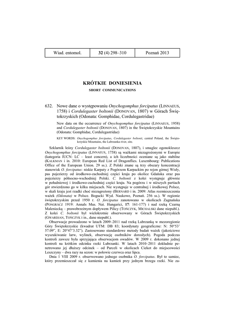 Wiad. entomol. 32 (4) 298–310 Poznań 2013 KRÓTKIE DONIESIENIA SHORT COMMUNICATIONS 632. Nowe dane o występowaniu Onychogomphus forcipatus (LINNAEUS, 1758) i Cordulegaster boltonii (DONOVAN, 1807) w Górach Świętokrzyskich (Odonata: Gomphidae, Cordulegastridae) New data on the occurrence of Onychogomphus forcipatus (LINNAEUS, 1958) and Cordulegaster boltonii (DONOVAN, 1807) in the Świętokrzyskie Mountains (Odonata: Gomphidae, Cordulegastridae) KEY WORDS: Onychogomphus forcipatus, Cordulegaster boltonii, central Poland, the Świętokrzyskie Mountains, the Lubrzanka river, site. Szklarnik leśny Cordulegaster boltonii (DONOVAN, 1807), i smaglec ogonokleszcz Onychogomphus forcipatus (LINNAEUS, 1758) są ważkami niezagrożonymi w Europie (kategoria IUCN: LC – least concern), a ich liczebności oceniane są jako stabilne (KALKMAN i in. 2010: European Red List of Dragonflies. Luxembourg: Publications Office of the European Union. 29 ss.). Z Polski znane są trzy obszary koncentracji stanowisk O. forcipatus: niskie Karpaty z Pogórzem Karpackim po rejon górnej Wisły, pas pojezierzy od środkowo-zachodniej części kraju po okolice Gdańska oraz pas pojezierzy północno-wschodniej Polski. C. boltonii z kolei występuje głównie w południowej i środkowo-zachodniej części kraju. Na pogórzu i w niższych partiach gór stwierdzono go w kilku miejscach. Nie występuje w centralnej i środkowej Polsce, w skali kraju jest rzadki choć niezagrożony (BERNARD i in. 2009: Atlas rozmieszczenia ważek (Odonata) w Polsce. Bogucki Wyd. Naukowe, Poznań. 256 ss.). W regionie świętokrzyskim przed 1950 r. O. forcipatus zanotowano w okolicach Zagnańska (PONGRÁCZ 1919: Annals Mus. Nat. Hungarici, 17: 161-177) i nad rzeką Czarną Maleniecką – prawobrzeżnym dopływem Pilicy (TOŃCZYK, MICHALSKI dane niepubl.). Z kolei C. boltonii był wielokrotnie obserwowany w Górach Świętokrzyskich (GWARDJAN, TOŃCZYK i in., dane niepubl.). Obserwacje prowadzono w latach 2009–2011 nad rzeką Lubrzanką w mezoregionie Góry Świętokrzyskie (kwadrat UTM: DB 83; koordynaty geograficzne: N: 50°53’ 57.09”, E: 20°47’3.32”). Zastosowano standardowe metody badań ważek (jakościowe wyszukiwanie larw, wylinek, obserwację osobników dorosłych). Pogoda podczas kontroli zawsze była sprzyjająca obserwacjom owadów. W 2009 r. dokonano jednej kontroli na krótkim odcinku rzeki Lubrzanki. W latach 2010–2011 dokładnie penetrowano jej dłuższy odcinek – od Parceli w okolicach Ciekot do miejscowości Leszczyny – dwa razy na sezon: w połowie czerwca oraz lipca. Dnia 1 VIII 2009 r. obserwowano jednego osobnika O. forcipatus. Był to samiec, który przemieszczał się z kamienia na kamień przy jednym brzegu rzeki. Nie za- WIAD. ENTOMOL., 32 (4): POZNAŃ 2013 – KRÓTKIE DONIESIENIA 299 obserwowano więcej tego gatunku, natomiast 12 VII 2011 r., bardzo blisko wspomnianego stanowiska, widziano patrolującego osobnika C. boltonii – ważki nie potwierdzonej do tego czasu na rzece Lubrzance (BERNARD i in. 2009: ibid.). Środowisko, w jakim obserwowano gatunek O. forcipatus, to niewielka nasłoneczniona rzeka o charakterze górskim, a według literatury był już stwierdzany w podobnych siedliskach (WENDZONKA 2005: Odonatrix, Supl. 1: 1-32; BELLMANN 2010: Ważki. Przewodnik Entomologa. Multico, Warszawa. 280 ss.). Monitorowany fragment Lubrzanki to środowisko potencjalnego występowania C. boltonii, który jest stenobiontem zasiedlającym czyste, zacienione i szybko płynące rzeki (BERNARD i in. 2009: ibid.) – w terenie osobnik patrolował tylko odcinek otoczony gęstymi zadrzewieniami. Wyniki obserwacji wskazują na potrzebę sprawdzania potencjalnych stanowisk występowania ważek przez więcej niż jeden sezon oraz kilkakrotnie w ciągu roku. W wypadku monitoringu rzek pod kątem występowania ważek, warto najpierw wykonać rozeznanie siedliska wzdłuż koryta, a następnie regularnie obserwować punkty lub odcinki o warunkach sprzyjających występowaniu danych gatunków, ocenionych na podstawie dostępnej literatury. Bardzo dziękuję panom: Mariuszowi GWARDJANOWI i dr. Grzegorzowi TOŃCZYKOWI za informacje dotyczące wybranych ważek w regionie świętokrzyskim oraz recenzentowi za cenne uwagi do poprzednich wersji tekstu. Emilia GRZĘDZICKA, Inst. Ochr. Przyr. PAN 633. Potwierdzenie występowania Chlaenius (Chlaenites) spoliatus (P. ROSSI, 1792) (Coleoptera: Carabidae) w Polsce Confirmation of the occurrence of Chlaenius (Chlaenites) spoliatus (P. ROSSI, 1792) (Coleoptera: Carabidae) in Poland KEY WORDS: ground beetles, Coleoptera, Carabidae, Chlaeniini, Chlaenius spoliatus, Poland, new records, new locality. Chlaenius (Chlaenites) spoliatus (P. ROSSI, 1972) rozsiedlony jest w południowej części Palearktyki od Wysp Kanaryjskich, Półwyspu Iberyjskiego i Maroka na zachodzie do północnowschodniej części Chin, Kraju Przymorskiego, Półwyspu Koreańskiego i wysp japońskich na wschodzie, przy czym na Dalekim Wschodzie występuje w podgatunku Ch. s. motschulskyi Andr. (pozostałą część areału zajmuje podgatunek nominatywny) (LAFER 1989: II. Podotriad Adephaga, pp. 67-257 [W:] Ler (ed.), Opredelitel nasekomyh Dalnego Vostoka SSSR, T. III, Zhestkokrylyie, ili zhuki, ch. 1, Nauka: Leningrad, 576 p.; KIRSCHENHOFER 2003: tribe Chlaeniini Brullé, 1834, pp. 347-356 [W:] Löbl & Smetana (eds.), Catalogue of Palaearctic Coleoptera, Vol. 1, Archostemata – Myxophaga – Adephaga, Apollo Books: Stenstrup, 819 p.). W Europie północna granica zasięgu gatunku przebiega przez południową część Francji, Niemiec, Polski i Ukrainę (BURAKOWSKI, MROCZKOWSKI, STEFAŃSKA 1974: Kat. fauny Polski, XXIII, 3, PWN: Warszawa, 430 p.; HARTMANN 2004: 21. Chlaeniini, 93. Chlaenius, pp. 421-425 [W:] FREUDE, HARDE, LOHSE & KLAUSNITZER (eds.), Die Käfer Mitteleuropas, Bd. 2 Adephaga 1: Carabidae (Laufkäfer), Spektrum-Verlag: Heidelberg/Berlin, 521 p.). 300 WIAD. ENTOMOL., 32 (4): POZNAŃ 2013 – 