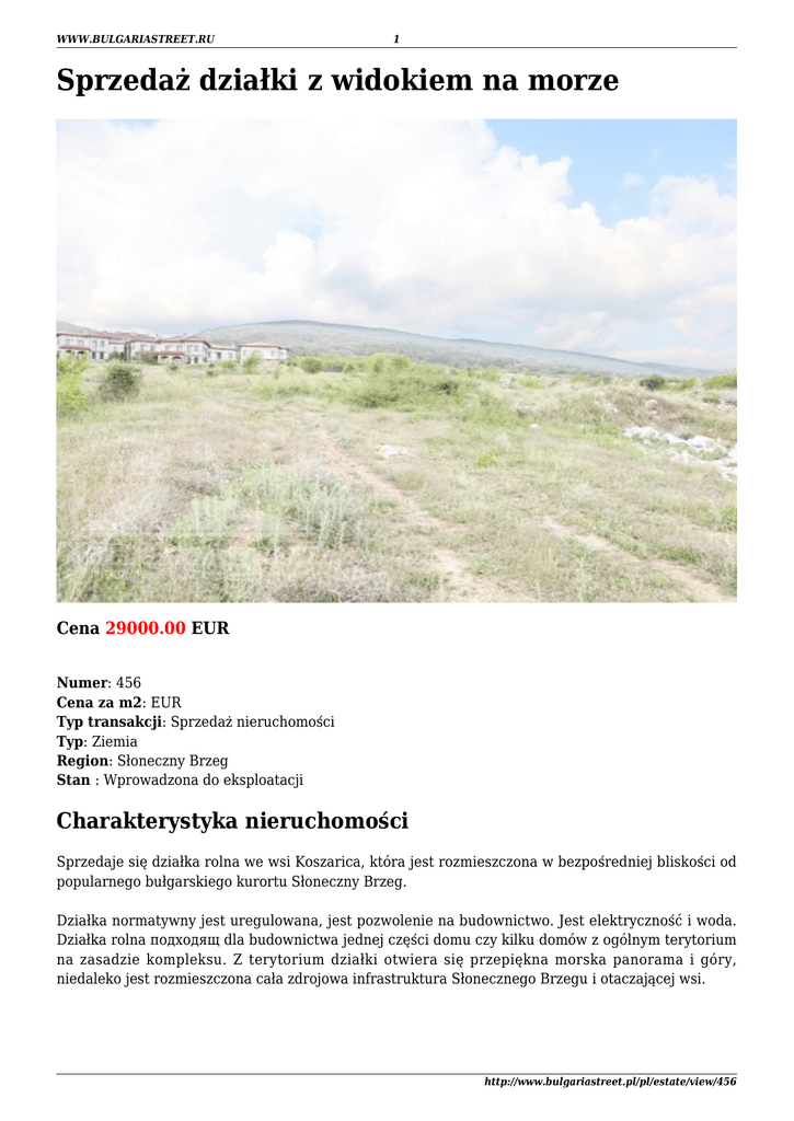 WWW.BULGARIASTREET.RU 1 Sprzedaż działki z widokiem na morze Cena 29000.00 EUR Numer: 456 Cena za m2: EUR Typ transakcji: Sprzedaż nieruchomości Typ: Ziemia Region: Słoneczny Brzeg Stan : Wprowadzona do eksploatacji Charakterystyka nieruchomości Sprzedaje się działka rolna we wsi Koszarica, która jest rozmieszczona w bezpośredniej bliskości od popularnego bułgarskiego kurortu Słoneczny Brzeg. Działka normatywny jest uregulowana, jest pozwolenie na budownictwo. Jest elektryczność i woda. Działka rolna подходящ dla budownictwa jednej części domu czy kilku domów z ogólnym terytorium na zasadzie kompleksu. Z terytorium działki otwiera się przepiękna morska panorama i góry, niedaleko jest rozmieszczona cała zdrojowa infrastruktura Słonecznego Brzegu i otaczającej wsi. http://www.bulgariastreet.pl/pl/estate/view/456 WWW.BULGARIASTREET.RU 2 Informacje o regionie Największy kurort bułgarskiego czarnomorskiego nadbrzeża - Słoneczny Brzeg, rozmieszczony w zatoce między prastarym miastem Nesebar a Świętym Własem. Międzynarodowy port lotniczy m. Burgas znajduje się na odległości 35 km, a port lotniczy Warny - 95 km Klimat Słoneczny brzeg różni się sprzyjającym śródziemnomorskim klimatem. Lato jest słoneczne i gorące, średnia temperatura w lipcu składa 22-23 stopni Celsjusza. Średnia temperatura morskiej wody - 2026 stopni Celsjusza. W okres z maja miesiąca po października włącznie ilość słonecznych godzin istnieje więcej 1700. Słonecznemu brzegowi jest nadany Błękitny sztandar - międzynarodowa nagroda, która potwierdza, że woda i plaże odpowiadają najwyższym standardom i przydatne dla bezpiecznej kąpieli i odpoczynku. Plaże Słoneczny Brzeg ma w rozporządzeniu naprawdę zbytkowną plażę z drobnym złocistym piaskiem i bezpiecznym pochyłym zachodem w morze. Czysty, współcześnie wyposażony i taki, że ochrania się plaża jest prawdziwą chlubą kurortu. Na plaży są możliwości dla surfingu, przejażdżka na ślizgaczach i wodnych rowerach. Tu są zbudowane współczesne tenisowe korty. Skoki z spadochronem i wierzchowa jazda - dla Waszego zadowolenia! Infrastruktura Słoneczny brzeg ma doskonale opracowaną infrastrukturę. W tym kurorcie są wszystkie warunki dla rodzinnego, dziecięcego i młodzieżowego odpoczynku. Duża ilość parkowych terytoriów, co zadrzewia, ze strefami odpoczynku i dziecięcymi placykami jest bezsprzeczną przewagą kurortu. W kompleksie są trenażery sale, sauny, pływalnie dla dorosłych i dzieci, masażowe gabinety, salony piękności i medyczne centra. Duża ilość rozmaitych restauracji i kawiarń, co proponuje internacjonalną i bułgarską kuchnię, poza wątpliwością, ucieszy smakoszy. Młodzież we właściwy sposób oceni nocne kluby, modne dyskoteki, bary z żywą muzyką. Dla amatorów aktywnego odpoczynek i sportu są stworzone liczne warunki. Kontakty Agencja "Ulica Bułgarska" (Bulgaria Street Ltd) http://www.bulgariastreet.pl/pl/estate/view/456 WWW.BULGARIASTREET.RU 3 Bułgaria m. Burgas, 8000 ul. Mitropolit Simeon 3 Strona: www.bulgariastreet.ru Tel: + 359 894 51 50 51 Tel: + 48 223 906 334 Mail: [email protected] Mail: [email protected] Skype: bulstreet http://www.bulgariastreet.pl/pl/estate/view/456