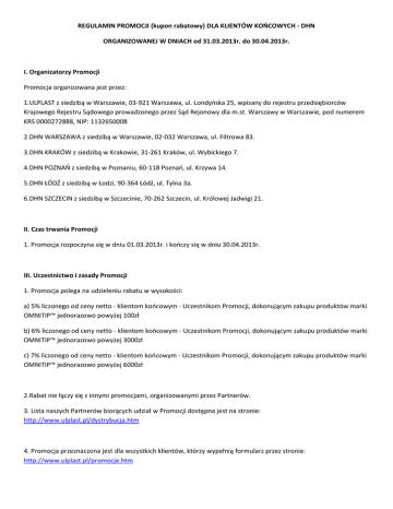 REGULAMIN PROMOCJI (kupon rabatowy) DLA KLIENTÓW KOŃCOWYCH - DHN ORGANIZOWANEJ W DNIACH od 31.03.2013r. do 30.04.2013r. I. Organizatorzy Promocji Promocja organizowana jest przez: 1.ULPLAST z siedzibą w Warszawie, 03-921 Warszawa, ul. Londyńska 25, wpisany do rejestru przedsiębiorców Krajowego Rejestru Sądowego prowadzonego przez Sąd Rejonowy dla m.st. Warszawy w Warszawie, pod numerem KRS 0000272888, NIP: 1132650008 2.DHN WARSZAWA z siedzibą w Warszawie, 02-032 Warszawa, ul. Filtrowa 83. 3.DHN KRAKÓW z siedzibą w Krakowie, 31-261 Kraków, ul. Wybickiego 7. 4.DHN POZNAŃ z siedzibą w Poznaniu, 60-118 Poznań, ul. Krzywa 14. 5.DHN ŁÓDŹ z siedzibą w Łodzi, 90-364 Łódź, ul. Tylna 3a. 6.DHN SZCZECIN z siedzibą w Szczecinie, 70-262 Szczecin, ul. Królowej Jadwigi 21. II. Czas trwania Promocji 1. Promocja rozpoczyna się w dniu 01.03.2013r. i kończy się w dniu 30.04.2013r. III. Uczestnictwo i zasady Promocji 1. Promocja polega na udzieleniu rabatu w wysokości: a) 5% liczonego od ceny netto - klientom końcowym - Uczestnikom Promocji, dokonującym zakupu produktów marki OMNITIP™ jednorazowo powyżej 100zł b) 6% liczonego od ceny netto - klientom końcowym - Uczestnikom Promocji, dokonującym zakupu produktów marki OMNITIP™ jednorazowo powyżej 3000zł c) 7% liczonego od ceny netto - klientom końcowym - Uczestnikom Promocji, dokonującym zakupu produktów marki OMNITIP™ jednorazowo powyżej 6000zł 2.Rabat nie łączy się z innymi promocjami, organizowanymi przez Partnerów. 3. Lista naszych Partnerów biorących udział w Promocji dostępna jest na stronie: http://www.ulplast.pl/dystrybucja.htm 4. Promocja przeznaczona jest dla wszystkich klientów, którzy wypełnią formularz przez stronie: http://www.ulplast.pl/promocje.htm 3. Aby wziąć udział w Promocji, Uczestnik Promocji musi w trakcie jej trwania tj. w dniach 01.03.2013r –31.04.2013r. dokonać zakupu w oddziałach Partnerów DHN po wcześniejszym wypełnieniu formularza na stronie: http://www.ulplast.pl/promocje.htm Po otrzymaniu wygenerowanego kuponu przez organizatora z indywidualnym kodem kreskowym, otrzymanego drogą mailową , należy go okazać u dystrybutora przed wystawieniem faktury. IV. Reklamacje 1. Wszelkie reklamacje dotyczące zasad realizacji niniejszej Promocji, w tym w szczególności nieudzielania rabatu lub udzielenia go w nieprawidłowej wysokości, mogą być składane przez Klientów w terminie 30 dni od daty wystawienia dokumentu sprzedaży, na adres: ULPLAST SP. Z O.O , 03-921 Warszawa,ul. Londyńska 25 2. Reklamacja, o której mowa w pkt. 1 powinna zawierać nazwę firmy imię, nazwisko, adres do korespondencji Uczestnika Promocji jak również kserokopię dowodu sprzedaży oraz opis podstaw reklamacji. 3. Reklamacje, o których mowa w pkt. 1 rozpatrywane będą przez Komisję d/s Promocji w terminie 30 dni od dnia otrzymania. W razie negatywnego dla Uczestnika rozstrzygnięcia reklamacji o wyniku tego postępowania Uczestnik zostanie powiadomiony listem poleconym. Stanowisko Komisji zajęte po rozpatrzeniu Reklamacji będzie ostateczne. 4. W przypadku nieuzasadnionego nie naliczenia rabatu bądź nieprawidłowego naliczenia rabatu powstałego z winy Partnera, za przyjęcie, rozstrzygnięcie i pokrycie kosztów reklamacji klientów z tego tytułu oraz zwrotu Klientowi różnicy pomiędzy zapłaconą ceną a ceną pomniejszoną o wysokość przysługującego klientowi rabatu odpowiadać będzie Partner. V. Postanowienia końcowe 1. Organizatorzy nie ponoszą odpowiedzialności w razie wyłączenia z Promocji któregoś z oddziałów: DHN - WARSZAWA DHN- KRAKÓW DHN- POZNAŃ DHN – ŁODŹ DHN – SZCZECIN jeśli nastąpi to w wyniku siły wyższej. 2. Treść niniejszego Regulaminu znajduje się: a. w siedzibie ULPLAST SP. Z O.O. , 03-921 Warszawa, ul.Londyńska 25 b. w serwisie internetowym www.ulplast.pl 3. Wszelką korespondencję do Organizatorów należy kierować na adres: ULPLAST SP. Z O.O. , 03-921 Warszaw, ul. Londyńska 25