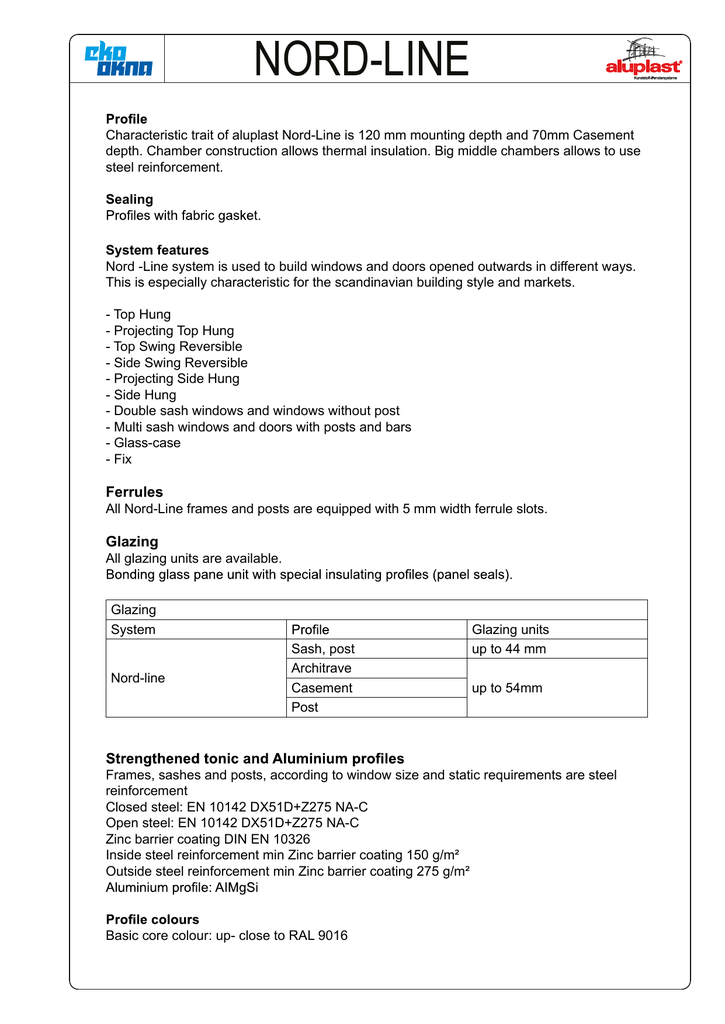 NORD-LINE Characteristic trait of aluplast Nord-Line is 120 mm mounting depth and 70mm Casement depth. Chamber construction allows thermal insulation. Big middle chambers allows to use steel reinforcement. Sealing System features Nord -Line system is used to build windows and doors opened outwards in different ways. This is especially characteristic for the scandinavian building style and markets. - Top Hung - Projecting Top Hung - Top Swing Reversible - Side Swing Reversible - Projecting Side Hung - Side Hung - Double sash windows and windows without post - Multi sash windows and doors with posts and bars - Glass-case - Fix Ferrules All Nord-Line frames and posts are equipped with 5 mm width ferrule slots. Glazing All glazing units are available. Glazing System Nord-line Sash, post Architrave Casement Post Glazing units up to 44 mm up to 54mm Frames, sashes and posts, according to window size and static requirements are steel reinforcement Closed steel: EN 10142 DX51D+Z275 NA-C Open steel: EN 10142 DX51D+Z275 NA-C Zinc barrier coating DIN EN 10326 Inside steel reinforcement min Zinc barrier coating 150 g/m² Outside steel reinforcement min Zinc barrier coating 275 g/m² Basic core colour: up- close to RAL 9016 NORD-LINE Inside view Outside view Top Hung Inside view Outside view Projecting Top Hung Inside view Outside view Top Swing Reversible Inside view Projecting Side Hung Outside view Inside view Outside view Side Hung Nord-line NORD-LINE 140x90 Frame 42mm 5 17 140295 646193 120 65 26 13 42 16 ** 40 60 60 12 12 48 249190 s=1.5mm 3,5* 11.5 8.5 20 15 120101 *Ix-value in cm4 ** Factory-mounted seal Scale:1:1 659932 -> 120101 690922 -> 120101 Nord-line Frame, 42mm: 140x90 NORD-LINE 140x93 Sash 60mm 642300 70 55 3 18 ** 249192 s=1.5mm 2,4* 35 30 20 61 3 12.5 42 26.5 36 19 60 21.5 30 35 249193 s=1.5mm 2,6* Extra seal available 449102 * Ix-value in cm4 ** Factory-mounted seal Scale:1:1 Nord-line Sash, 60mm: 140x93 NORD-LINE 140x95 Sash 85mm 642300 70 55 3 18 ** 35 51.5 85 67 45 46.5 19 36 10 61 3 12.5 249195 s=2.0mm 5,5* Extra seal available 449102 * Ix-value in cm4 ** Factory-mounted seal Scale:1:1 Nord-line Sash, 85mm: 140x95 NORD-LINE 140x99 Transom bar / Transom bar 61mm x 114mm 5 17 640199 140295 640191 114 65 16 61 25.5 29 13 16 ** 25.5 ** 98 13 23 48 249198 s=1.5mm 4,8* * Ix-value in cm4 ** Factory-mounted seal Scale:1:1 Nord-line Transom bar / Small mullion, 61mm x 114mm: 140x99 NORD-LINE 140x98 Transom bar 61mm x 101mm 5 17 140295 640191 101 65 16 61 25.5 29 13 16 ** 25.5 ** 85 13 23 48 15 20 11.5 8.5 249198 s=1.5mm 4,8* 120101 * Ix-value in cm4 ** Factory-mounted seal Scale:1:1 659932 -> 120101 690922 -> 120101 Nord-line Transom bar, 61mm x 101mm: 140x98 NORD-LINE 140x48 Mullion 84mm 640301 647132 647102 640900 Bohrlehre -> 647132 / 102 -> 647131 / 101 -> 647105 640311 70 640940 55 ** 35 20 647131 647101 44 84 20 19 35 20 229101 s=2.0mm 2,8* * Ix-value in cm4 ** Factory-mounted seal Scale:1:1 Nord-line Mullion, 84mm: 140x48 NORD-LINE 120 70 50 78* 91* 4 26.5 4.5* 60 5 120846 120876 26 42 5* (*) 140295 60 *Top Swing: horizontal + 4mm (449343 or 447343) Scale:1:1 Nord-line: Frame-Sash Glazing bead 120846/120876 60 Frame 140x90 Sash 140x93 NORD-LINE 120 70 50 4 103* 4.5* 116* 85 51.5 5 120846 sw 120876 pw 26 42 5* (*) 140295 60 *Top Swing: horizontal + 4mm (449343 or 447343) Scale:1:1 Nord-line: Frame-Sash Glazing bead 120846/120876 60 Frame 140x90 Sash 140x95 NORD-LINE 114 70 44 66.5* 26.5 4 79.5* 30.5 14.5 5* (*) 30.5 133** 140295 5* 14.5 66.5* 79.5* (*) 5 60 4.5* 4 26.5 159** 4.5* 60 5 120846 120876 *Top Swing: horizontal + 4mm (449343 or 447343) **Top Swing: horizontal + 8mm Scale:1:1 Nord-line: Sash-Mullion-Sash Glazing bead 120846/120876 Mullion 140x99 Sash 140x93 NORD-LINE 4 30.5 14.5 5* (*) 30.5 183** 140295 5* 14.5 209** 44 91.5* 70 51.5 114 4.5* 104.5* 85 5 120846 120876 (*) 5 85 51.5 104.5* 4.5* 91.5* 4 *Top Swing: horizontal + 4mm (449343 or 4473430) **Top Swing: horizontal + 8mm Scale:1:1 Nord-line: Sash-Mullion-Sash Glazing bead 120846/120876 Mullion 140x99 Sash 140x95 NORD-LINE 101 70 31 26.5 133 140295 66.5 30.5 5 14.5 159 14.5 5 30.5 66.5 79.5 4 4.5 60 5 120846 sw 120876 pw 26.5 5 60 4.5 79.5 4 Scale:1:1 Nord-line: Sash-Transom bar-Sash Glazing bead 120846/120876 Transom bar 140x98 Sash 140x93 NORD-LINE 31 183 140295 30.5 5 14.5 209 14.5 5 30.5 4 91.5 70 51.5 101 4.5 104.5 85 5 120846 120876 5 85 51.5 104.5 4.5 91.5 4 Scale:1:1 Nord-line: Sash-Transom bar-Sash Glazing bead 120846/120876 Transom bar 140x98 Sash 140x95 NORD-LINE 114 70 44 66.5 4.5 79.5 4 26.5 60 5 120846 120876 30.5 133 140295 66.5 30.5 5 14.5 159 14.5 5 3 8x45mm 26.5 5 60 4.5 79.5 4 Scale:1:1 Nord-line: Sash-Small mullion-Sash Glazing bead 120846/120876 Small mullion 140x99 Sash 140x93 NORD-LINE 5 120846 120876 44 4.5 4 3 8x45mm 183 140295 30.5 5 14.5 209 14.5 5 91.5 51.5 104.5 70 30.5 85 114 5 85 51.5 104.5 4.5 91.5 4 Scale:1:1 Nord-line: Sash-Small mullion-Sash Glazing bead 120846/120876 Small mullion 140x99 Sash 140x95