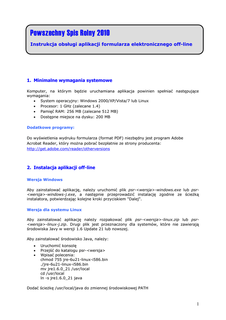 Powszechny Spis Rolny 2010 Instrukcja obsługi aplikacji formularza elektronicznego off-line 1. Minimalne wymagania systemowe Komputer, na którym będzie uruchamiana aplikacja powinien spełniać następujące wymagania: System operacyjny: Windows 2000/XP/Vista/7 lub Linux Procesor: 1 GHz (zalecane 1.4) Pamięć RAM: 256 MB (zalecane 512 MB) Dostępne miejsce na dysku: 200 MB Dodatkowe programy: Do wyświetlenia wydruku formularza (format PDF) niezbędny jest program Adobe Acrobat Reader, który można pobrać bezpłatnie ze strony producenta: http://get.adobe.com/reader/otherversions 2. Instalacja aplikacji off-line Wersja Windows Aby zainstalować aplikację, należy uruchomić plik psr-<wersja>-windows.exe lub psr<wersja>-windows-j.exe, a następnie przeprowadzić instalację zgodnie ze ścieżką instalatora, potwierdzając kolejne kroki przyciskiem "Dalej". Wersja dla systemu Linux Aby zainstalować aplikację należy rozpakować plik psr-<wersja>-linux.zip lub psr<wersja>-linux-j.zip. Drugi plik jest przeznaczony dla systemów, które nie zawierają środowiska Javy w wersji 1.6 Update 21 lub nowszej. Aby zainstalować środowisko Java, należy: Uruchomić konsolę Przejść do katalogu psr-<wersja> Wpisać polecenia: chmod 755 jre-6u21-linux-i586.bin ./jre-6u21-linux-i586.bin mv jre1.6.0_21 /usr/local cd /usr/local ln -s jre1.6.0_21 java Dodać ścieżkę /usr/local/java do zmiennej środowiskowej PATH 1 3. Uruchomienie aplikacji System Windows Należy wybrać z menu Start -> Programy -> PSR -> PSR, lub kliknąć ikonę programu znajdującą się na pulpicie. System Linux Aby uruchomić aplikację, należy wejść do katalogu psr-<wersja> i wpisać polecenie java -jar psr.jar 4. Zasady pracy z aplikacją Aby dokonać samospisu należy uruchomić aplikację oraz udzielić odpowiedzi na wszystkie pytania, które zostaną wyświetlone na formularzu. Informacje powinny być podane wg stanu w dniu 30 czerwca 2010 r., chyba, że na formularzu zaznaczono inaczej. Informacje powinien podać użytkownik gospodarstwa rolnego lub inna pełnoletnia osoba w tym samym gospodarstwie domowym (w dalszej części dokumentu jako respondent). Formularz musi być wypełniony w kolejności wyświetlanych pytań, nie ma możliwości pracy z dowolnie wybranym działem tematycznym. Przejście do kolejnej strony formularza możliwe jest tylko wówczas, gdy na aktualnej stronie wprowadzono wszystkie wymagane informacje i są one poprawne z punktu widzenia zastosowanych reguł kontroli danych (jeśli zidentyfikowano błędy aplikacja wyświetli ich opis u dołu ekranu i zablokuje możliwość przejścia do kolejnej strony). Dane, które na aktualnej stronie przywoływane są z innych stron formularza mogą być modyfikowane tylko na stronie, na której zostały wprowadzone (aplikacja udostępnia funkcjonalność umożliwiającą przejście na stronę z pytaniem, gdzie taką wartość wprowadzono). Formularz zapamiętuje ścieżkę pytań dotyczącą danego respondenta i umożliwia cofnięcie się do dowolnej strony, z którą pracował wcześniej (przycisk „Cofnij do”). Uwaga! Po takim cofnięciu przejście wprzód możliwe będzie tylko do następnej strony (nie ma możliwości powrotu do ostatnio wypełnianej strony z pominięciem stron, które ją poprzedzają). Aby sprawdzić jakie dane zostały wprowadzane na innych stronach formularza (bez użycia funkcji „Cofnij do”) można wywołać wydruk formularza, co skutkuje pobraniem podglądu wydruku wszystkich stron formularza w formacie PDF. W przypadku przerwania pracy z aplikacją dane zostają zapamiętane i po jej ponownym uruchomieniu zostaną udostępnione do edycji. Jeżeli formularz został poprawnie wypełniony należy wysłać go drogą internetową do GUS (bezpośrednio z aplikacji lub ze strony internetowej) albo dostarczyć w postaci pliku do urzędu statystycznego lub gminnego biura spisowego przy urzędzie miasta lub gminy 2 5. Interfejs aplikacji Interfejs aplikacji jest podzielony na 3 strefy: a) strefa danych – gdzie wyświetlane są pytania oraz pola edycyjne dla udzielenia odpowiedzi b) strefa nawigacyjna – zestaw przycisków służących do przemieszczania się w obrębie formularza: Pomoc – pobranie instrukcji obsługi aplikacji w formacie PDF Cofnij do – powrót do wybranej strony formularza (wyświetlana jest lista stron, z którymi pracował respondent, kliknięcie myszką na wiersz reprezentujący daną stronę spowoduje przejście do tej strony) Wstecz – przejście do poprzedniej strony formularza Sprawdź stronę – sprawdzenie poprawności danych wprowadzonych na aktualnej stronie Dalej – przejście do następnej strony formularza (wraz z wywołaniem tej funkcji sprawdzana jest poprawności danych wprowadzonych na aktualnej stronie i jeżeli zidentyfikowane zostaną błędy przejście do następnej strony nie będzie możliwe, jednocześnie wyświetlony zostanie panel błędów) Wyślij – wywołuje okno umożliwiające transfer danych z formularza do serwera GUS lub zapis danych do pliku na dysku lokalnym Drukuj – pobranie wydruku formularza w formacie PDF (wywołanie tej funkcji nie powoduje zainicjowania wydruku formularza na drukarce, a jedynie wyświetlenie dokumentu PDF) Zakończ – wyjście z aplikacji c) panel błędów – wyświetla informacje o błędach zidentyfikowanych na danej stronie formularza (po dokonaniu korekty danych panel jest ukrywany) Strefa danych Strefa nawigacyjna Panel błędów 3 Elementy funkcjonalne i ergonomiczne W aplikacji stosowane są następujące elementy funkcjonalne i ergonomiczne, których celem jest ułatwienie pracy z formularzem: (popraw wartość) Powrót do pola, z którego pobrana została wyświetlana wartość (w polu tym można wówczas dokonać korekty tej wartości) (oblicz wartość domyślną pola) Funkcja obliczająca poprawną wartość danego pola zgodnie z regułami kontroli danych w danym pytaniu (funkcja ta ma charakter pomocniczy, w każdym te