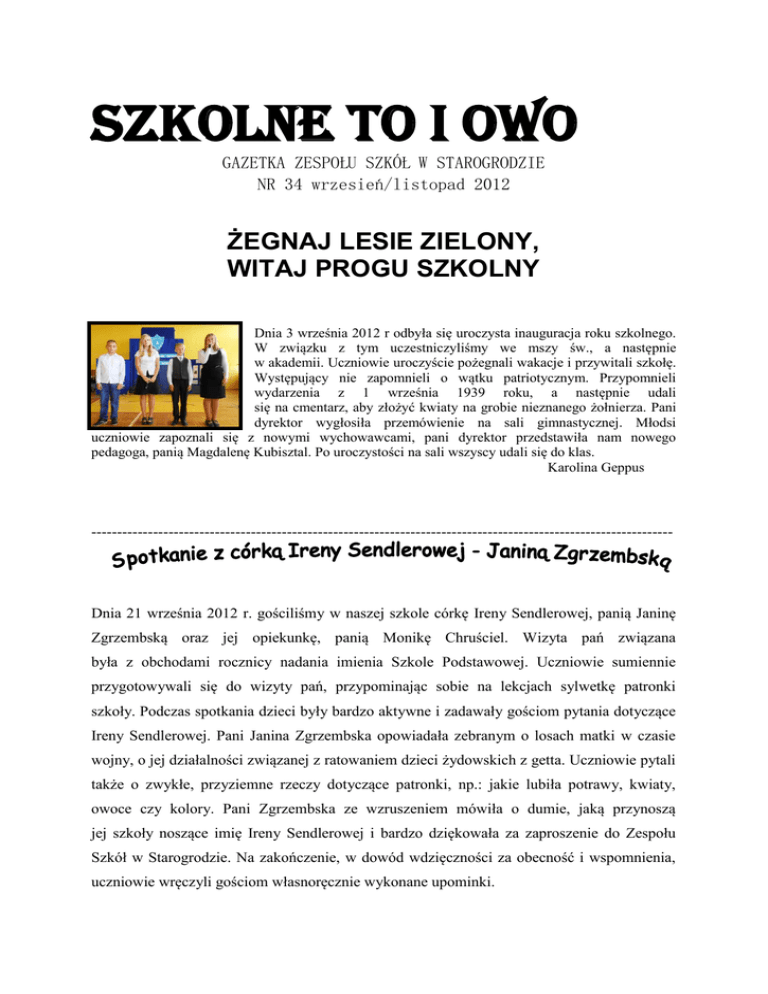 SZKOLNE TO I OWO GAZETKA ZESPOŁU SZKÓŁ W STAROGRODZIE NR 34 wrzesień/listopad 2012 ŻEGNAJ LESIE ZIELONY, WITAJ PROGU SZKOLNY Dnia 3 września 2012 r odbyła się uroczysta inauguracja roku szkolnego. W związku z tym uczestniczyliśmy we mszy św., a następnie w akademii. Uczniowie uroczyście pożegnali wakacje i przywitali szkołę. Występujący nie zapomnieli o wątku patriotycznym. Przypomnieli wydarzenia z 1 września 1939 roku, a następnie udali się na cmentarz, aby złożyć kwiaty na grobie nieznanego żołnierza. Pani dyrektor wygłosiła przemówienie na sali gimnastycznej. Młodsi uczniowie zapoznali się z nowymi wychowawcami, pani dyrektor przedstawiła nam nowego pedagoga, panią Magdalenę Kubisztal. Po uroczystości na sali wszyscy udali się do klas. Karolina Geppus ----------------------------------------------------------------------------------------------------------------- Dnia 21 września 2012 r. gościliśmy w naszej szkole córkę Ireny Sendlerowej, panią Janinę Zgrzembską oraz jej opiekunkę, panią Monikę Chruściel. Wizyta pań związana była z obchodami rocznicy nadania imienia Szkole Podstawowej. Uczniowie sumiennie przygotowywali się do wizyty pań, przypominając sobie na lekcjach sylwetkę patronki szkoły. Podczas spotkania dzieci były bardzo aktywne i zadawały gościom pytania dotyczące Ireny Sendlerowej. Pani Janina Zgrzembska opowiadała zebranym o losach matki w czasie wojny, o jej działalności związanej z ratowaniem dzieci żydowskich z getta. Uczniowie pytali także o zwykłe, przyziemne rzeczy dotyczące patronki, np.: jakie lubiła potrawy, kwiaty, owoce czy kolory. Pani Zgrzembska ze wzruszeniem mówiła o dumie, jaką przynoszą jej szkoły noszące imię Ireny Sendlerowej i bardzo dziękowała za zaproszenie do Zespołu Szkół w Starogrodzie. Na zakończenie, w dowód wdzięczności za obecność i wspomnienia, uczniowie wręczyli gościom własnoręcznie wykonane upominki. ~~~~~~~~~~~~~~~ ~~~~~~~~~~~~~~~ ~1~~~~~~~~~~~~~~ ~~~~~~~~~~~~~~~ Dnia 28 września 2012 roku w naszej szkole odbył się po raz pierwszy dzień Patrona Szkoły. W związku z tym wydarzeniem uczniowie wykonywali różne zadania tematycznie związane z patronami szkół. Uczniowie klas 0-III sp pisali list do Ireny Sendlerowej oraz wykonywali bukiety kwiatów dla swojej patronki. Klasy IV-VI oglądały projekcję filmu z nadania imienia szkołom, a następnie wykonywały portrety Ireny Sendlerowej. Gimnazjaliści, wraz z paniami Renatą Piękoś i Grażyną Bukowską, wybrali się na Klamry, aby uczcić pamięć poległych żołnierzy. Posprzątali miejsce poległych w II wojnie światowej, zapalili znicze oraz złożyli kwiaty na pomniku. Pamięć poległych została uczczona minutą ciszy Ważnym i wzruszającym punktem tego dnia było spotkanie gimnazjalistów z panem Lechem Rutkowskim. Pani dyrektor zaprosiła go, ponieważ jego ojciec wraz z przyjaciółmi brał udział w kampanii wrześniowej. Celem wizyty było przybliżenie uczniom losów ojca pana Rutkowskiego oraz realiów tamtych czasów. Gość ze wzruszeniem opowiadał, a uczniowie z zainteresowaniem słuchali. Na zakończenie pan Rutkowski otrzymał podziękowanie oraz upominek wykonany przez uczniów. Po spotkaniu odbyła się akademia, podczas której wspominaliśmy bardzo ważny moment dla szkoły – nadanie imienia. Występujący uczniowie przypomnieli zebranym sylwetkę Ireny Sendlerowej oraz recytowali wiersze związane z wrześniem 1939 roku. Ten dzień był bardzo ważny dla uczniów klasy I sp, którzy zostali pasowani przez panią dyrektor na uczniów Szkoły Podstawowej im. Ireny Sendlerowej w Starogrodzie oraz dla uczniów I klasy Gimnazjum im. Bohaterów Września 1939 Roku, którzy złożyli uroczyste ślubowanie. Karolina Geppus, Ewa Lewandowska ~~~~~~~~~~~~~~~~~~~~~~~~~~~~~~~~2~~~~~~~~~~~~~~~~~~~~~~~~~~~~~ POZNAJMY SIĘ Nazywam się Katarzyna Zaremba i chodzę do klasy 2 gimnazjum. Uwielbiam się śmiać. Lubię jeździć na rowerze i spotykać się z przyjaciółmi. Moją pasją jest czytanie książek. Bardzo lubię słuchać muzyki. Będę redagowała kącik „Czy wiesz, że..?” Nazywam się Natalia Raniszewska. Chodzę do klasy pierwszej gimnazjum. Moje zainteresowania to malarstwo. W wolnym czasie słucham muzyki. Lubię grać w siatkówkę. Będę przedstawiała Wam przysłowia dotyczące pór roku, miesięcy, świąt. Nazywam się Joanna Raniszewska. Chodzę do drugiej klasy gimnazjum. Interesuję się fotografią. W gazetce szkolnej będę pisać o zwierzętach. Nazywam się Karolina Geppus. Mam 13 lat. Jestem uczennicą klasy 1 gimnazjum. Interesuję się sportem. W szkolnej gazetce będę pisała o wydarzeniach z życia szkoły. Nazywam się Oliwia Bruś. Jestem uczennicą klasy I gimnazjum. Interesuje się muzyką. W wolnym czasie gram na komputerze i spotykam się z przyjaciółmi. Będę pisać o nowościach filmowych, które warto obejrzeć. Nazywam się Patryk Pliszczyński. Mam 12 lat. Mieszkam w Starogrodzie i chodzę do klasy I gimnazjum. W wolnym czasie gram w piłkę nożną. W gazetce będę pisał o sporcie. Nazywam się Zofia Zaremba. Chodzę do I klasy gimnazjum. Gdy mam czas wolny słucham muzyki lub pomagam mamie. Będę pisać o miejscach, które warto zwiedzić. Nazywam się Elżbieta Głowacka. Interesuję się głównie muzyką. W gazetce szkolnej będę redagować kącik z humorem i plotki o gwiazdach. Mam na imię Emila i chodzę do klasy II gimnazjum. Interesuję się dziennikarstwem. W wolnym czasie lubię słuchać muzyki, a moim ulubionym wykonawcą jest Eminem ;D . W szkolnej gazetce będę pisać o ciekawych książkach. Nazywam się Ewa Lewandowska i chodzę do klasy I gimnazjum. Interesuję się muzyką. W gazetce będę pisała o wydarzeniach z życia szkoły. Mam na imię Andżelika. Mam 14 lat. Chodzę do klasy II gimnazjum. Interesuję się muzyką. Będę w gazetce szkolnej podsuwała Wam przepisy na różne pyszne potrawy. N