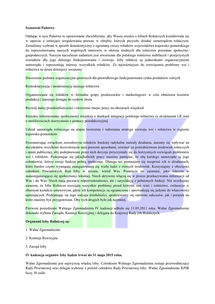 Szanowni Państwo Oddając w ręce Państwa to opracowanie chcielibyśmy, aby Wasza wiedza o Izbach Rolniczych kształtowała się w oparciu o istniejące uregulowania prawne w obrębie, których przyszło działać samorządom rolniczym. Zostaliśmy wybrani w sposób demokratyczny z ogromnej rzeszy rolników województwa kujawsko-pomorskiego do reprezentowania naszych wspólnych interesów w okresie trudnych dla rolnictwa przemian społecznogospodarczych. Naszym naczelnym zadaniem jest stworzenie dla polskiego rolnictwa stabilnych i przejrzystych warunków dla jego dalszego funkcjonowania i rozwoju. Izby rolnicze są jednostkami organizacyjnymi samorządu i reprezentują interesy wszystkich rolników. Za najważniejsze do rozwiązania problemy wsi i rolnictwa na dzień dzisiejszy uważamy: Stworzenie podstaw organizacyjno-prawnych dla prawidłowego funkcjonowania rynku produktów rolnych Restrukturyzację i modernizację naszego rolnictwa Organizowanie się rolników w formalne grupy producenckie i marketingowe w celu obniżenia kosztów produkcji i lepszego dostępu do rynków zbytu Rozwój małej przedsiębiorczości i tworzenie miejsc pracy na obszarach wiejskich Szerokie informowanie społeczności wiejskiej o skutkach integracji polskiego rolnictwa ze strukturami UE oraz o możliwościach skorzystania z pomocy przedakcesyjnej Udział samorządu rolniczego na etapie tworzenia i wdrażania strategii rozwoju wsi i rolnictwa w regionie kujawsko-pomorskim Pozostawiając związkom zawodowym rolników bardziej radykalne metody działania, staramy się wpływać na decydentów wszelkimi dozwolonymi nam prawem sposobami, również za pośrednictwem środowisk rolniczych i opinii publicznej, aby podejmowane przez nich decyzje przyczyniały się do korzystnych rozwiązań problemów wsi i rolników. Podejmując się jakiejkolwiek pracy musimy pamiętać, że siłą każdego samorządu są jego członkowie, którzy swoje funkcje pełnią społecznie. Dlatego też postarajmy się wesprzeć ich w działaniach, które bardzo często wymagają zaangażowania się wielu ludzi z różnych środowisk. Korzystajmy z obecności członków Powiatowych Rad Izby w terenie, wśród Was. Pomóżcie im zaistnieć, jako liderom w samoorganizującej się społeczności lokalnej. Niech aktywnie włączą się w proces przekazywania informacji od Was i do Was. Niech mają poczucie odpowiedzialności, ale i satysfakcję z pełnionych funkcji. Nie oczekujmy zarazem, że Izby Rolnicze rozwiążą wszystkie problemy przed którymi stoi wieś i rolnictwo, zwłaszcza w obecnym kształcie ustawowym, gdzie ich kompetencje są ograniczone i sprowadzają się jedynie do właściwości opiniujących. Podejmując się tego rodzaju działalności, spodziewamy się zarówno sukcesów, jak i porażek na które musimy być przygotowani. Oby tych drugich było jak najmniej. Pierwsze posiedzenie Walnego Zgromadzenia IV kadencji odbyło się 11.05.2011 roku. Walne Zgromadzenie dokonało wyboru Zarządu, Komisji Rewizyjnej i delegata do Krajowej Rady Izb Rolniczych. Organami Izby Rolniczej są: 1. Walne Zgromadzenie 2. Komisja Rewizyjna 3. Zarząd Izby IV kadencja organów Izby będzie trwać do 31 maja 2015 roku. Walne Zgromadzenie jest najwyższą władzą Izby. Członkiem Walnego Zgromadzenia zostaje przewodniczący Rady Powiatowej oraz delegat wybrany z pośród członków Rady Powiatowej Izby. Walne Zgromadzenie KPIR liczy 38 osób. Komisja Rewizyjna składa się z 5 osób wybranych z pośród członków Walnego Zgromadzenia. Przewodniczącym Komisji Rewizyjnej jest Pan Roman Ciesielski z gminy Bądkowo. Członkami Komisji wybrani zostali: Regina Ostrowska z gminy Koronowo Jan Skrzeszewski z gminy Kijewo Królewskie Mirosław Smaruj z gminy Dąbrowa Tomasz Zakrzewski z gminy Obrowo Skład osobowy Zarządu Kujawsko-Pomorskiej Izby Rolniczej wybranego na pierwszym Walnym Zgromadzeniu przedstawia się następująco: Prezes – Ryszard Kierzek – z gminy Janowiec Wielkopolski Wiceprezes – Tadeusz Ziółkowski – z gminy Czernikowo Członek Zarządu – Ryszard Błaszkiewicz z gminy Rypin Członek Zarządu – Sławomir Kowalewski – z gminy Dobrzyń n/Wisłą Członek zarządu – Radosław Mrugowski – z gminy Mrocza Swoje zadania Zarząd realizuje przy pomocy Biura Izby. Biuro Kujawsko-Pomorskiej Izby Rolniczej wykonuje zadania w siedzibie Izby w Przysieku, w dwóch oddziałach we Włocławku i w Bydgoszczy oraz w biurach powiatowych, które działają w Aleksandrowie Kujawskim, Brodnicy, Chełmnie, Golubiu-Dobrzyniu, Grudziądzu, Inowrocławiu, Lipnie, Mogilnie, Nakle, Radziejowie, Rypinie, Sępólnie Krajeńskim, Świeciu, Tucholi, Wąbrzeźnie i Żninie. Biuro udziela porad prawnych, świadczy usługi doradcze z zakresu analiz ekonomicznych, sporządzania projektów urządzeniowych, marketingu, podejmowania działalności poza rolniczej na wsi. Specjaliści oferują swoją pomoc przy organizowaniu grup producenckich i marketingowych oraz w promowaniu działalności gospodarczej na obszarach wiejskich. Z poważaniem Ryszard Kierzek