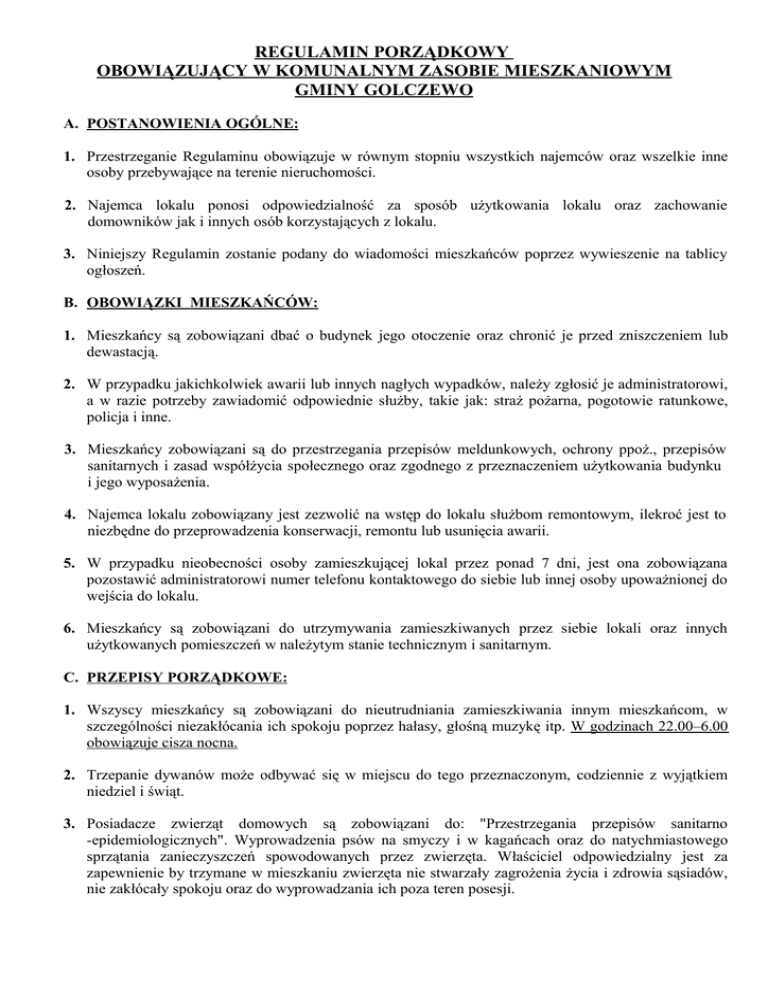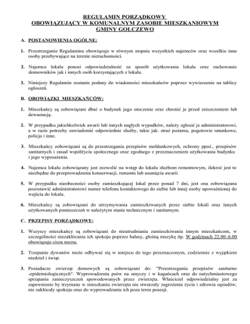 REGULAMIN PORZĄDKOWY OBOWIĄZUJĄCY W KOMUNALNYM ZASOBIE MIESZKANIOWYM GMINY GOLCZEWO A. POSTANOWIENIA OGÓLNE: 1. Przestrzeganie Regulaminu obowiązuje w równym stopniu wszystkich najemców oraz wszelkie inne osoby przebywające na terenie nieruchomości. 2. Najemca lokalu ponosi odpowiedzialność za sposób użytkowania lokalu oraz zachowanie domowników jak i innych osób korzystających z lokalu. 3. Niniejszy Regulamin zostanie podany do wiadomości mieszkańców poprzez wywieszenie na tablicy ogłoszeń. B. OBOWIĄZKI MIESZKAŃCÓW: 1. Mieszkańcy są zobowiązani dbać o budynek jego otoczenie oraz chronić je przed zniszczeniem lub dewastacją. 2. W przypadku jakichkolwiek awarii lub innych nagłych wypadków, należy zgłosić je administratorowi, a w razie potrzeby zawiadomić odpowiednie służby, takie jak: straż pożarna, pogotowie ratunkowe, policja i inne. 3. Mieszkańcy zobowiązani są do przestrzegania przepisów meldunkowych, ochrony ppoż., przepisów sanitarnych i zasad współżycia społecznego oraz zgodnego z przeznaczeniem użytkowania budynku i jego wyposażenia. 4. Najemca lokalu zobowiązany jest zezwolić na wstęp do lokalu służbom remontowym, ilekroć jest to niezbędne do przeprowadzenia konserwacji, remontu lub usunięcia awarii. 5. W przypadku nieobecności osoby zamieszkującej lokal przez ponad 7 dni, jest ona zobowiązana pozostawić administratorowi numer telefonu kontaktowego do siebie lub innej osoby upoważnionej do wejścia do lokalu. 6. Mieszkańcy są zobowiązani do utrzymywania zamieszkiwanych przez siebie lokali oraz innych użytkowanych pomieszczeń w należytym stanie technicznym i sanitarnym. C. PRZEPISY PORZĄDKOWE: 1. Wszyscy mieszkańcy są zobowiązani do nieutrudniania zamieszkiwania innym mieszkańcom, w szczególności niezakłócania ich spokoju poprzez hałasy, głośną muzykę itp. W godzinach 22.00–6.00 obowiązuje cisza nocna. 2. Trzepanie dywanów może odbywać się w miejscu do tego przeznaczonym, codziennie z wyjątkiem niedziel i świąt. 3. Posiadacze zwierząt domowych są zobowiązani do: "Przestrzegania przepisów sanitarno -epidemiologicznych". Wyprowadzenia psów na smyczy i w kagańcach oraz do natychmiastowego sprzątania zanieczyszczeń spowodowanych przez zwierzęta. Właściciel odpowiedzialny jest za zapewnienie by trzymane w mieszkaniu zwierzęta nie stwarzały zagrożenia życia i zdrowia sąsiadów, nie zakłócały spokoju oraz do wyprowadzania ich poza teren posesji. 4. Niedopuszczalne jest dokonywanie – bez pisemnej zgody administratora - zmian wystroju zewnętrznego budynku poprzez zmiany fragmentów elewacji, okien. Wszelkie montowane elementy typu – anteny TV, jak również skrzynki na kwiaty i donice powinny być umieszczane w sposób gwarantujący bezpieczeństwo osób trzecich. 5. Na korytarzach nie wolno przechowywać rowerów, motorowerów, motocykli, materiałów łatwopalnych, żrących i cuchnących środków chemicznych, gazu w butlach ani innych materiałów grożących wybuchem lub zapłonem. 6. Nie wolno zastawiać wewnętrznych ciągów komunikacyjnych, tj. korytarzy i klatek schodowych, żadnymi przedmiotami, chyba że jest to chwilowo uzasadnione z uwagi na przeprowadzkę lub prowadzenie prac remontowych w lokalu. W każdym wypadku przedmioty te należy bezzwłocznie usunąć na ustne wezwanie administratora. Niezastosowanie się do tego wezwania może spowodować usunięcie tych przedmiotów na koszt osoby, która je umieściła. 7. Parkowanie samochodów na terenie posesji jest możliwe tylko na wyznaczonych miejscach. Zabronione jest parkowanie niezgodnie z przepisami, wzdłuż drogi pożarowej, ciągów dla pieszych. 8. Zabrania się palenia tytoniu oraz spożywania alkoholu na korytarzach oraz w pomieszczeniach garażowych i gospodarczych. 9. Śmieci należy wyrzucać wyłącznie do pojemników na ten cel przeznaczonych. Zabrania się wystawiania śmieci na korytarze. 10. Usuwanie gruzu i innych pozostałości po robotach budowlano-remontowych w lokalu, jak również wszelkich odpadów gabarytowych odbywa się na koszt danego właściciela i w sposób uzgodniony z administratorem. 11. Zabrania się pisania i drapania na ścianach budynku, uszkadzania koszy na śmieci oraz niszczenia zieleni. 12. W trosce o dobro i bezpieczeństwo dzieci, wskazane jest zapewnienie przez rodziców należytej nad nimi opieki. 13. Za szkody wyrządzone na terenie posesji przez dzieci - materialnie odpowiadają rodzice lub opiekunowie. TELEFONY ALARMOWE: Pogotowie Ratunkowe: 999 Policja: 997 Straż Pożarna: 998 Pogotowie Energetyczne: 991 Pogotowie Gazowe: 992 Numer alarmowy z telefonu komórkowego: 112