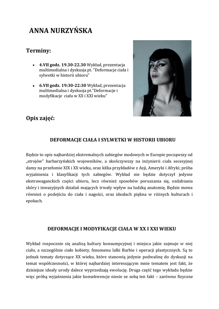 ANNA NURZYŃSKA Terminy: 4.VII godz. 19.30-22.30 Wykład, prezentacja multimedialna i dyskusja pt. ”Deformacje ciała i sylwetki w historii ubioru” 6.VII godz. 19:30-22:30 Wykład, prezentacja multimedialna i dyskusja pt.”Deformacje i modyfikacje ciała w XX i XXI wieku” Opis zajęć: DEFORMACJE CIAŁA I SYLWETKI W HISTORII UBIORU Będzie to opis najbardziej ekstremalnych zabiegów modowych w Europie począwszy od „strojów” barbarzyńskich wojowników, a skończywszy na inżynierii ciała secesyjnej damy na przełomie XIX i XX wieku, oraz kilka przykładów z Azji, Ameryki i Afryki; próba wyjaśnienia i klasyfikacji tych zabiegów. Wykład nie będzie dotyczył jedynie ekstrawaganckich części ubioru, lecz również sposobów poruszania się, ozdabiania skóry i inwazyjnych działań mających trwały wpływ na ludzką anatomię. Będzie mowa również o podejściu do ciała i nagości, oraz ideałach piękna w różnych kulturach i epokach. DEFORMACJE I MODYFIKACJE CIAŁA W XX I XXI WIEKU Wykład rozpocznie się analizą kultury konsumpcyjnej i miejsca jakie zajmuje w niej ciało, a szczególnie ciało kobiety, fenomenu lalki Barbie i operacji plastycznych. Są to jednak tematy dotyczące XX wieku, które stanowią jedynie podwalinę do dyskusji na temat współczesności, w której najbardziej interesującym mnie tematem jest fakt, że dzisiejsze ideały urody dalece wyprzedzają ewolucję. Druga część tego wykładu będzie więc próbą wyjaśnienia jakie konsekwencje niesie ze sobą ten fakt – zarówno fizyczne (zabiegi upiększające), jak psychologiczne (współczesne choroby takie jak anoreksja, bulimia, depresja, kompulsywne działania związane z jedzeniem lub ćwiczeniem, uzależnienia od zakupów, operacji plastycznych, tatuaży, itd.). Znajdzie się również czas na opis tzw. modyfikacji ciała, mających za zadanie zatrzeć granicę pomiędzy ciałem człowieka a np. androidem, czy subkultur w których takie zabiegi są wyjątkowo popularne. Życiorys: Anna Nurzyńska - Kostiumolog. Od 2009 roku prowadzi wykłady o historii mody, a od niedawna również warsztaty haftu artystycznego, w warszawskim centrum kultury „Sztukarnia”. Jest absolwentką katedry scenografii na Akademii Sztuk Pięknych w Warszawie. Na co dzień zajmuje się historią ubioru, obyczajowości i tkanin, oraz haftem, projektowaniem i rozmaitymi projektami artystycznymi związanymi z kostiumologią. przygotowuje też własną książkę o modzie w XVIII i XIX wieku.
