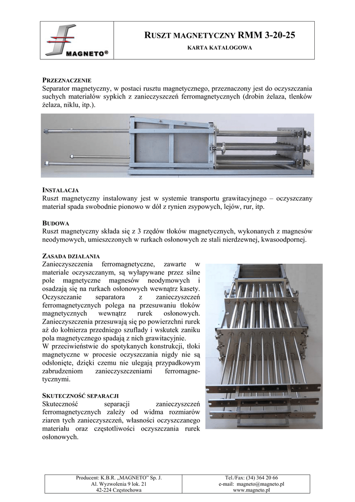 RUSZT MAGNETYCZNY RMM 3-20-25 KARTA KATALOGOWA PRZEZNACZENIE Separator magnetyczny, w postaci rusztu magnetycznego, przeznaczony jest do oczyszczania suchych materiałów sypkich z zanieczyszczeń ferromagnetycznych (drobin żelaza, tlenków żelaza, niklu, itp.). INSTALACJA Ruszt magnetyczny instalowany jest w systemie transportu grawitacyjnego – oczyszczany materiał spada swobodnie pionowo w dół z rynien zsypowych, lejów, rur, itp. BUDOWA Ruszt magnetyczny składa się z 3 rzędów tłoków magnetycznych, wykonanych z magnesów neodymowych, umieszczonych w rurkach osłonowych ze stali nierdzewnej, kwasoodpornej. ZASADA DZIAŁANIA Zanieczyszczenia ferromagnetyczne, zawarte w materiale oczyszczanym, są wyłapywane przez silne pole magnetyczne magnesów neodymowych i osadzają się na rurkach osłonowych wewnątrz kasety. Oczyszczanie separatora z zanieczyszczeń ferromagnetycznych polega na przesuwaniu tłoków magnetycznych wewnątrz rurek osłonowych. Zanieczyszczenia przesuwają się po powierzchni rurek aż do kołnierza przedniego szuflady i wskutek zaniku pola magnetycznego spadają z nich grawitacyjnie. W przeciwieństwie do spotykanych konstrukcji, tłoki magnetyczne w procesie oczyszczania nigdy nie są odsłonięte, dzięki czemu nie ulegają przypadkowym zabrudzeniom zanieczyszczeniami ferromagnetycznymi. SKUTECZNOŚĆ SEPARACJI Skuteczność separacji zanieczyszczeń ferromagnetycznych zależy od widma rozmiarów ziaren tych zanieczyszczeń, własności oczyszczanego materiału oraz częstotliwości oczyszczania rurek osłonowych. Producent: K.B.R. „MAGNETO” Sp. J. Al. Wyzwolenia 9 lok. 21 42-224 Częstochowa Tel./Fax: (34) 364 20 66 e-mail: [email protected] www.magneto.pl