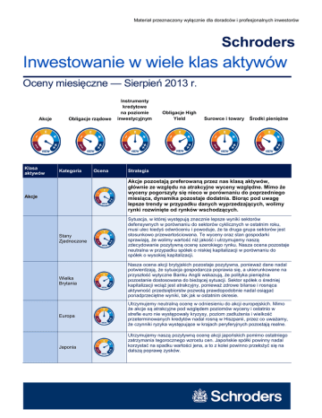 Materiał przeznaczony wyłącznie dla doradców i profesjonalnych inwestorów Schroders Inwestowanie w wiele klas aktywów Oceny miesięczne — Sierpień 2013 r. Akcje Klasa aktywów Obligacje rządowe Kategoria Ocena Instrumenty kredytowe na poziomie inwestycyjnym Obligacje High Yield Surowce i towary Środki pieniężne Strategia Akcje pozostają preferowaną przez nas klasą aktywów, głównie ze względu na atrakcyjne wyceny względne. Mimo że wyceny pogorszyły się nieco w porównaniu do poprzedniego miesiąca, dynamika pozostaje dodatnia. Biorąc pod uwagę lepsze trendy w przypadku danych wyprzedzających, wolimy rynki rozwinięte od rynków wschodzących. Akcje Stany Zjednoczone Sytuacja, w której występują znacznie lepsze wyniki sektorów defensywnych w porównaniu do sektorów cyklicznych w ostatnim roku, musi ulec kiedyś odwróceniu i powoduje, że ta druga grupa sektorów jest stosunkowo przewartościowana. Te wyceny oraz stan gospodarki sprawiają, że wolimy wartość niż jakość i utrzymujemy naszą zdecydowanie pozytywną ocenę szerokiego rynku. Nasza ocena pozostaje neutralna w przypadku spółek o niskiej kapitalizacji w porównaniu do spółek o wysokiej kapitalizacji. Wielka Brytania Nasza ocena akcji brytyjskich pozostaje pozytywna, ponieważ dane nadal potwierdzają, że sytuacja gospodarcza poprawia się, a ukierunkowane na przyszłość wytyczne Banku Anglii wskazują, że polityka pieniężna pozostanie dostosowana do bieżącej sytuacji. Sektor spółek o średniej kapitalizacji wciąż jest atrakcyjny, ponieważ zdrowe bilanse i rosnąca aktywność przedsiębiorstw pozwolą prawdopodobnie nadal osiągać ponadprzeciętne wyniki, tak jak w ostatnim okresie. Europa Japonia Utrzymujemy neutralną ocenę w odniesieniu do akcji europejskich. Mimo że akcje są atrakcyjne pod względem poziomów wyceny i ostatnio w strefie euro nie występowały kryzysy, poziom zadłużenia i wielkość przeterminowanych kredytów nadal rosną w Hiszpanii, przez co uważamy, że czynniki ryzyka występujące w krajach peryferyjnych pozostają realne. Utrzymujemy naszą pozytywną ocenę akcji japońskich pomimo ostatniego zatrzymania tegorocznego wzrostu cen. Japońskie spółki powinny nadal korzystać na spadku wartości jena, a to z kolei powinno przełożyć się na dalszą poprawę zysków. Schroders Inwestowanie w wiele klas aktywów Klasa aktywów Kategoria Ocena Strategia Utrzymujemy neutralną ocenę akcji regionu Pacyfiku (bez Japonii). Niskie tempo wzrostu w regionie i konkurencja spółek japońskich będą nadal stanowić źródła przeciwności, które nie są naszym zdaniem równoważone przez atrakcyjne poziomy wyceny. Kraje Pacyfiku (bez Japonii) Nie zmieniliśmy naszej neutralnej oceny rynków wschodzących. Chociaż jesteśmy przekonani, że większość złych informacji jest już odzwierciedlona w obecnych niskich cenach, niewiele przemawia za sformułowaniem jednoznacznie pozytywnej oceny w średnim okresie, biorąc pod uwagę słabe dane gospodarcze i ostatnie obawy dotyczące gospodarek z wysokimi deficytami na rachunku obrotów bieżących. Rynki wschodzące Obligacje rządowe Stany Zjednoczone Wielka Brytania Europa Japonia Amerykańskie obligacje powiązane z inflacją Obligacje na rynkach wschodzącyc h ▲ Utrzymujemy ogólny krótki czas trwania, ponieważ obecne poziomy wyceny wskazują, że istnieje potencjał dalszej korekty stóp zwrotu. Nasza ocena jest nieco mniej negatywna niż w poprzednim miesiącu, ponieważ polityka prowadzona przez banki centralne przewiduje utrzymanie krótkoterminowych stóp procentowych na niskich poziomach. Wydaje się, że stopy zwrotu na razie się ustabilizowały, ponieważ ograniczenie złagodzenia ilościowego jest w znacznym stopniu uwzględnione w cenach rynkowych. Możliwość wydłużenia okresu ograniczania byłaby pozytywną informacją dla rynku, ale wciąż istnieją ważne czynniki ryzyka związane z debatą budżetową, limitem zadłużenia i wyborami następnego prezesa Rezerwy Federalnej. W związku z tym podnieśliśmy naszą ocenę. Nie zmieniliśmy naszej neutralnej oceny brytyjskich obligacji skarbowych. Pomimo wyższego tempa wzrostu i pozytywnych wskaźników wyprzedzających ukierunkowane na przyszłość wytyczne formułowane przez prezesa Banku Anglii wskazują, że Komitet Polityki Pieniężnej prawdopodobnie nie będzie podnosić stóp procentowych przez kolejne 3– 4 lata, chyba że nastąpi znaczny wzrost wskaźnika zatrudnienia. Obniżyliśmy naszą ocenę obligacji rządowych państw europejskich, ponieważ ograniczone ryzyko polityczne, lepsze perspektywy wzrostu i ▼ niższe ryzyko deflacji powinny stworzyć presję na wzrost stóp zwrotu z niemieckich obligacji skarbowych wraz ze zmianami obserwowanymi ostatnio na pozostałych rynkach obligacji rządowych państw grupy G7. Biorąc pod uwagę obecny wyjątkowo niski poziom stóp zwrotu, ich dalsze znaczne obniżenie będzie trudne, nawet w przypadku dużych zakupów obligacji. Mimo że trwający program skupu obligacji przez Bank Japonii pozwoli prawdopodobnie utrzymać stopy zwrotu na bieżących poziomach, rynek obligacji ma mały potencjał inwestycyjny w długim terminie, w związku z czym utrzymujemy negatywną ocenę. Inflacja utrzymuje się na dolnym poziomie oczekiwanego przez nas zakresu zmian. Ostatnie komentarze Rezerwy Federalnej powinny pozwolić utrzymać oczekiwania inflacyjne pod kontrolą, w związku z czym utrzymujemy naszą neutralną ocenę. Podnieśliśmy do neutralnej ocenę denominowanych w dolarach amerykańskich papierów dłużnych z rynków wschodzących w związku z bardziej atrakcyjnymi spreadami i lepszymi perspektywami obligacji ▲ amerykańskich. Utrzymaliśmy neutralną ocenę denominowanych w walutach lokalnych obligacji z rynków wschodzących, ale na poziomie poszczególnych krajów utrzymujemy obecnie pozytywną ocenę rynku meksykańskiego. Schroders Inwestowanie w wiele klas aktywów 