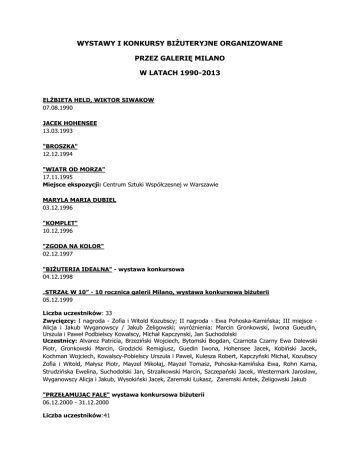 WYSTAWY I KONKURSY BIŻUTERYJNE ORGANIZOWANE PRZEZ GALERIĘ MILANO W LATACH 1990-2013 ELŻBIETA HELD, WIKTOR SIWAKOW 07.08.1990 JACEK HOHENSEE 13.03.1993 "BROSZKA" 12.12.1994 "WIATR OD MORZA" 17.11.1995 Miejsce ekspozycji: Centrum Sztuki Współczesnej w Warszawie MARYLA MARIA DUBIEL 03.12.1996 "KOMPLET" 10.12.1996 "ZGODA NA KOLOR" 02.12.1997 "BIŻUTERIA IDEALNA" - wystawa konkursowa 04.12.1998 „STRZAŁ W 10” - 10 rocznica galerii Milano, wystawa konkursowa biżuterii 05.12.1999 Liczba uczestników: 33 Zwycięzcy: I nagroda - Zofia i Witold Kozubscy; II nagroda - Ewa Pohoska-Kamińska; III miejsce Alicja i Jakub Wyganowscy / Jakub Żeligowski; wyróżnienia: Marcin Gronkowski, Iwona Gueudin, Urszula i Paweł Podbielscy Kowalscy, Michał Kapczynski, Jan Suchodolski Uczestnicy: Alvarez Patricia, Brzeziński Wojciech, Bytomski Bogdan, Czarnota Czarny Ewa Dalewski Piotr, Gronkowski Marcin, Grodzicki Remigiusz, Guedin Iwona, Hohensee Jacek, Kobiński Jacek, Kochman Wojciech, Kowalscy-Pobielscy Urszula i Paweł, Kulesza Robert, Kapczyński Michał, Kozubscy Zofia i Witold, Małysz Piotr, Mayzel Mikołaj, Mayzel Tomasz, Pohoska-Kamińska Ewa, Rohn Kama, Strudzińska Ewelina, Suchodolski Jan, Strzałkowski Marcin, Szczepański Jacek, Westermark Jarosław, Wyganowscy Alicja i Jakub, Wysokiński Jacek, Zaremski Łukasz, Zaremski Antek, Żeligowski Jakub "PRZEŁAMUJĄC FALE" wystawa konkursowa biżuterii 06.12.2000 - 31.12.2000 Liczba uczestników:41 Zwycięzcy: I nagroda – Dorota Piestrak; II nagroda - Agnieszka Bruzda; III nagroda - Radosław Szwed; wyróżnienia: Wojciech Brzeziński, Jacek Byczewski, Jacek Kobiński, Marcin Strzałkowski, Bartek Tarchalski, Jakub Żeligowski Uczestnicy: Brzeziński Wojciech, Bruzda Agnieszka, Burczyński Rafał, Byczewski Jacek; Bytomski Bogumił, Ciosmak Tomasz, Dalewski Piotr, Firlet Mikołaj, Fijałkowski Stanisław, Gueudin Iwona, Janowska Małgorzata, Kaleta Albert, Kamińska-Ogińska Anna, Kędzia Paweł, Kobiński Jacek, Podbielscy-Kowalscy Urszula i Paweł, Kulesza Robert, Lisowska Adrianna, Małysz Piotr, Mayzel Tomasz, Mioduszewska Ewa, Piestrak Dorota, Piotrowski Krzysztof, Płodowski Tomasz, Przasnyski Piotr, Roszkiewicz Krzysztof, Rozenweld Magdalena, Sawicka Anna, Schoneck Marta, Strzałkowski Marcin, Suchodolski Jan, Szczepański Jacek, Szwed Radosław, Tarchalski Bartek, Stępniak Marcin, Westermark Jarosław, Wisznewski Jan, Wolski Arkadiusz, Zaremski Antek, Żeligowski Jakub AJ AJ AJ HO HO HO CZE CZE CZE wystawa konkursowa biżuterii 01.12.2001 - 24.12.2001 Liczba uczestników:17 Zwycięzcy: I nagroda - Żeligowski Jakub; II nagroda - Tomasz Mayzel; III nagroda - Anna Ogińska; wyróżnienia: Renata Czyżnikowska, Antek Zaremski, Iwona Gueudin, Jacek Byczewski, Michał Kapczyński Uczestnicy: Rafał Burczyński, Jacek Byczewski, Renata Czyżnikowska, Rafał Firlet, Iwona Gueudin, Paweł Kaczyński, Michał Kapczyński, Marta Kochanek, Tomasz Mayzel, Anna Kamińska-Ogińska, Michał Peter, Jan Suchodolski, Marta Schonek, Joanna Stkowska, Marta Szulc, Antek Zaremski Żeligowski Jakub ODJAZDY - PRZYJAZDY wystawa konkursowa biżuterii Grudzień 2003 Zwycięzcy: I nagroda - Zofia i Witold Kozubscy; II nagroda Radosław Szwed, III nagroda - Oliwia Kuczyńska; wyróżnienia: Jacek Byczewski, Renata Czyżnikowska, Iwona Gueudin, Arkadiusz Wolski Uczestnicy: Patricia Alvarez, Wojciech Brzeziński, Jacek Byczewski, Renata Czyżnikowska, Joanna Dynysiuk, Krzysztof Gińko, Iwona Gueudin, Barbara Górska, Jacek Hohensee, Joanna Jaworska, Paweł Kaczyński, Urszula i Paweł Podbielscy-Kowalscy, Katarzyna Kucharska, Oliwia Kuczyńska, Zofia i Witold Kozubscy, Izabela Krauza, Paweł Kur, Robert Kulesza, Andrzej Kupniewski, Mikołaj Mayzel, Anna Kamińska-Ogińska, Małgorzata Pabel, Krzysztof Piotrowski, Anna Pilipczyk, Michał Peter, Jacek A. Rochacki, Krzysztof Roszkowski, Marcin Strzałkowski, Jan Suchodolski, Radosław Szwed, Marcin Tymiński, Jarosław Westermark, Leszek Weiss, Jan Wiśniewski, Arkadiusz Wolski, Jakub Wyganowski, Anna Wojdan, Antek Zaremski, Jakub Żelichowski BIŻUTERIA NA MEDAL wystawa konkursowa biżuterii 02.12.2004 - 16.12.2004 Liczba uczestników:52 Zwycięzcy: Nagroda specjalna STFZ - Jacek Byczewski, I nagroda - Anna Ogińska; II nagroda Jakub Żeligowski, III nagroda - Marta Kochanek-Zbroja; wyróżnienia: Iza Krauza, Paweł Kur, Marcin Strzałkowski, Marta Schoeneck, Karina Królak, Małgorzata Pabel Uczestnicy: Andrzej Bartosik, Wojciech Brzeziński, Jacek Byczewski, Agnieszka Bruzda, Aleksander Czapnik, Danuta Czapnik, Renata Czyżnikowska, Tomasz Ciosmak, Jerzy Cielecki, Magdalena Czajka, Mariusz Deka, Joanna Dynysiuk, Joanna Filik, Giuseppina Arrigoni Garin, Iwona Gueudin, Ewelina Golinowska, Joanna i Tadeusz Jaworscy, Rafał Kozubowicz, Marta Kochanek-Zbroja, Magda Kowalczyk, Agata Kamińska, Anna Kamińska-Ogińska, Ewa Klinowska, Zofia i Witold Kozubscy, Izabela Krauza i Paweł Kur, Karina Krolak, Dorota Krzeszewska, Oliwia Kuczyńska, Agata Łuczyńska, Daria Malicka, Tomasz Mayzel, Marzena Olszewska, Małgorzata Pabel, Mariusz Pajączkowski, Janusz Pilecki, Marcin Strzałkowski, Marta Schoeneck, Anna Szklarzewicz, Kacper Schiffers, Ewa Sobczyk, Jakub Śliwowski, Jacek Szczepański, Jan Wiszniewski, Arkadiusz Wolski, Anna Wojdan, Michał Wysocki, Michał Wyszomirski, Antek Zaremski, Jakub Żeligowski KREATYWNEGO DZIAŁANIA WYNIK 02.12.2005 - 15.12.2005 Liczba uczestników:54 uczestników FULL EXCLUSIVE 01.12.2006 - 15.12.2006 Liczba uczestników: 25 Uczestnicy: Jacek Byczewski, Grażyna Bieganik, Katarzyna Florkowska, Tadeusz i Joanna Jaworscy, Paweł Kaczyński, Paweł Kowalski, Zofia i Witold Kozubscy, Karina Królak, Dorota Krzeszewska, Katarzyna Kucharska, Piotr Małysz, Krzysztof Piotrowski, Marta Schoeneck i Arek Wolski, Jan Suchodolski, Radosław Szwed, Anna Wojdan, Anna Wyganowska, Alicja i Jakub Wyganowscy, Michał Wyszomirski, Jakub Żeligowski. KONSTRUKCJA ZACHWYTU 30.11.2007 - 15.12.2007 Liczba uczestn