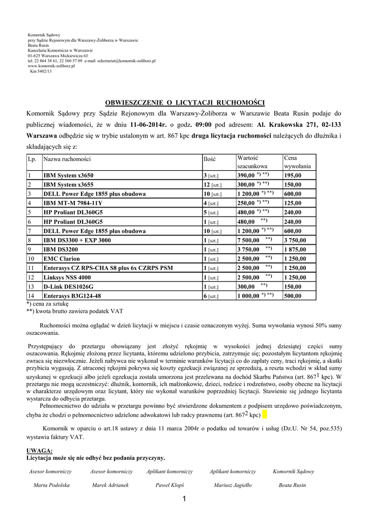 Komornik Sądowy przy Sądzie Rejonowym dla Warszawy-Żoliborza w Warszawie Beata Rusin Kancelaria Komornicza w Warszawie 01-625 Warszawa Mickiewicza 63 tel. 22 864 38 61, 22 560 57 09 e-mail: [email protected] www.komornik-zoliborz.pl Km 5402/13 OBWIESZCZENIE O LICYTACJI RUCHOMOŚCI Komornik Sądowy przy Sądzie Rejonowym dla Warszawy-Żoliborza w Warszawie Beata Rusin podaje do publicznej wiadomości, że w dniu 11-06-2014r. o godz. 09:00 pod adresem: Al. Krakowska 271, 02-133 Warszawa odbędzie się w trybie ustalonym w art. 867 kpc druga licytacja ruchomości należących do dłużnika i składających się z: Lp. Nazwa ruchomości Ilość 1 IBM System x3650 2 IBM System x3655 3 DELL Power Edge 1855 plus obudowa 4 IBM MT-M 7984-11Y 5 HP Proliant DL360G5 6 HP Proliant DL360G5 7 DELL Power Edge 1855 plus obudowa 8 IBM DS3300 + EXP 3000 9 IBM DS3200 10 EMC Clarion 11 Enterasys CZ RPS-CHA S8 plus 6x CZRPS PSM 12 Linksys NSS 4000 13 D-Link DES1026G 14 Enterasys B3G124-48 *) cena za sztukę **) kwota brutto zawiera podatek VAT 3 [szt.] 12 [szt.] 10 [szt.] 4 [szt.] 5 [szt.] 1 [szt.] 10 [szt.] 1 [szt.] 1 [szt.] 1 [szt.] 1 [szt.] 1 [szt.] 1 [szt.] 6 [szt.] Wartość szacunkowa 390,00 *) **) 300,00 *) **) 1 200,00 *) **) 250,00 *) **) 480,00 *) **) 480,00 **) 1 200,00 *) **) 7 500,00 **) 3 750,00 **) 2 500,00 **) 2 500,00 **) 2 500,00 **) 300,00 **) 1 000,00 *) **) Cena wywołania 195,00 150,00 600,00 125,00 240,00 240,00 600,00 3 750,00 1 875,00 1 250,00 1 250,00 1 250,00 150,00 500,00 Ruchomości można oglądać w dzień licytacji w miejscu i czasie oznaczonym wyżej. Suma wywołania wynosi 50% sumy oszacowania. Przystępujący do przetargu obowiązany jest złożyć rękojmię w wysokości jednej dziesiątej części sumy oszacowania. Rękojmię złożoną przez licytanta, któremu udzielono przybicia, zatrzymuje się; pozostałym licytantom rękojmię zwraca się niezwłocznie. Jeżeli nabywca nie wykonał w terminie warunków licytacji co do zapłaty ceny, traci rękojmię, a skutki przybicia wygasają. Z utraconej rękojmi pokrywa się koszty egzekucji związanej ze sprzedażą, a reszta wchodzi w skład sumy uzyskanej w egzekucji albo jeżeli egzekucja została umorzona jest przelewana na dochód Skarbu Państwa (art. 8671 kpc). W przetargu nie mogą uczestniczyć: dłużnik, komornik, ich małżonkowie, dzieci, rodzice i rodzeństwo, osoby obecne na licytacji w charakterze urzędowym oraz licytant, który nie wykonał warunków poprzedniej licytacji. Stawienie się jednego licytanta wystarcza do odbycia przetargu. Pełnomocnictwo do udziału w przetargu powinno być stwierdzone dokumentem z podpisem urzędowo poświadczonym, chyba że chodzi o pełnomocnictwo udzielone adwokatowi lub radcy prawnemu (art. 8672 kpc) Komornik w oparciu o art.18 ustawy z dnia 11 marca 2004r o podatku od towarów i usług (Dz.U. Nr 54, poz.535) wystawia faktury VAT. UWAGA: Licytacja może się nie odbyć bez podania przyczyny. Asesor komorniczy Asesor komorniczy Aplikant komorniczy Aplikant komorniczy Komornik Sądowy Marta Podolska Marek Adrianek Paweł Klopś Mariusz Jagiełło Beata Rusin 1 Kancelaria czynna w godzinach 9:00-17:00; przyjęcia interesantów poniedziałki 15:00-18:00 czwartki 9:00-12:00. Wpłat należy dokonywać na rachunek bankowy komornika: Bank Polska Kasa Opieki SA 43 1240 6074 1111 0010 4704 2981 Wszelkich informacji udzielamy pod numerem telefonu 22 864 38 61, 22 697 00 61 lub drogą elektroniczną pod adresem: [email protected] 2