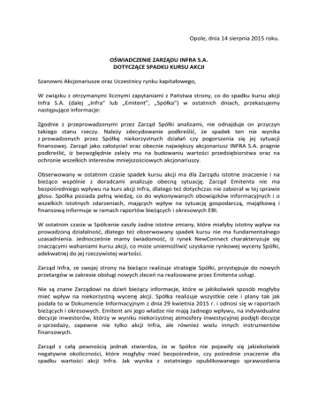 Opole, dnia 14 sierpnia 2015 roku. OŚWIADCZENIE ZARZĄDU INFRA S.A. DOTYCZĄCE SPADKU KURSU AKCJI Szanowni Akcjonariusze oraz Uczestnicy rynku kapitałowego, W związku z otrzymanymi licznymi zapytaniami z Państwa strony, co do spadku kursu akcji Infra S.A. (dalej „Infra” lub „Emitent”, „Spółka”) w ostatnich dniach, przekazujemy następujące informacje: Zgodnie z przeprowadzonymi przez Zarząd Spółki analizami, nie odnajduje on przyczyn takiego stanu rzeczy. Należy zdecydowanie podkreślić, że spadek ten nie wynika z prowadzonych przez Spółkę niekorzystnych działań czy pogorszenia się jej sytuacji finansowej. Zarząd jako założyciel oraz obecnie największy akcjonariusz INFRA S.A. pragnie podkreślić, iż bezwzględnie zależy mu na budowaniu wartości przedsiębiorstwa oraz na ochronie wszelkich interesów mniejszościowych akcjonariuszy. Obserwowany w ostatnim czasie spadek kursu akcji ma dla Zarządu istotne znaczenie i na bieżąco wspólnie z doradcami analizuje obecną sytuację. Zarząd Emitenta nie ma bezpośredniego wpływu na kurs akcji Infra, dlatego też dotychczas nie zabierał w tej sprawie głosu. Spółka posiada pełną wiedzę, co do wykonywanych obowiązków informacyjnych i o wszelkich istotnych zdarzeniach, mających wpływ na sytuację gospodarczą, majątkową i finansową informuje w ramach raportów bieżących i okresowych EBI. W ostatnim czasie w Spółcenie zaszły żadne istotne zmiany, które miałyby istotny wpływ na prowadzoną działalność, dlatego też obserwowany spadek kursu nie ma fundamentalnego uzasadnienia. Jednocześnie mamy świadomość, iż rynek NewConnect charakteryzuje się znaczącymi wahaniami kursu akcji, co może uniemożliwić uzyskanie rynkowej wyceny Spółki, adekwatnej do jej rzeczywistej wartości. Zarząd Infra, ze swojej strony na bieżąco realizuje strategie Spółki, przystępuje do nowych przetargów w zakresie obsługi nowych zleceń na realizowane przez Emitenta usługi. Nie są znane Zarządowi na dzień bieżący informacje, które w jakikolwiek sposób mogłyby mieć wpływ na niekorzystną wycenę akcji. Spółka realizuje wszystkie cele i plany tak jak podała to w Dokumencie Informacyjnym z dnia 29 kwietnia 2015 r. i odnosi się w raportach bieżących i okresowych. Emitent ani jego władze nie mają żadnego wpływu, na indywidualne decyzje inwestorów, którzy w wyniku niekorzystnej atmosfery inwestycyjnej podjęli decyzje o sprzedaży, zapewne nie tylko akcji Infra, ale również wielu innych instrumentów finansowych. Zarząd z całą pewnością jednak stwierdza, że w Spółce nie pojawiły się jakiekolwiek negatywne okoliczności, które mogłyby mieć bezpośrednie, czy pośrednie znaczenie dla spadku wartości akcji Infra. Jak wynika z ostatniego opublikowanego sprawozdania finansowego Spółki, poziom zobowiązań Infra uległ natomiast znacznemu obniżeniu w stosunku do roku poprzedniego. Jako Zarząd Spółki publicznie notowanej przypominamy również, że cena walorów spółki o takim statusie, zależy nie tylko od aktywności władz spółki czy dokonaniach finansowych Emitenta jako podmiotu gospodarczego, ale także od indywidualnych działań, podejmowanych przez inwestorów będących w posiadaniu akcji Infra, na które Spółka ani jej Zarząd, czy też Rada Nadzorcza nie mają wpływu. Infra ani jej Zarząd nie ponoszą odpowiedzialności za suwerenne decyzje inwestycyjne akcjonariuszy, które przekładają się na obecną ceną akcji Spółki, a tym samym na jej rynkową kapitalizację. Dodatkowo należy podkreślić, że do dnia dzisiejszego żaden ze znaczących akcjonariuszy Spółki nie zawiadomił o zmianie stanu posiadania w wyniku zbycia akcji Infra, co dodatkowo umacnia Zarząd w przekonaniu o zasadności powyższych wniosków. Pragniemy Państwa zapewnić, że Spółka konsekwentnie realizuje przyjętą i opublikowaną strategię oraz wdrożone założenia biznesowe. Podsumowując, według posiadanej i przekazanej przez Zarząd wiedzy, w Spółce nie wystąpiły żadne zdarzenia, które mogłyby być przyczyną zniżkowania kursu akcji. Z poważaniem Henryk Franecki – Prezes Zarządu
