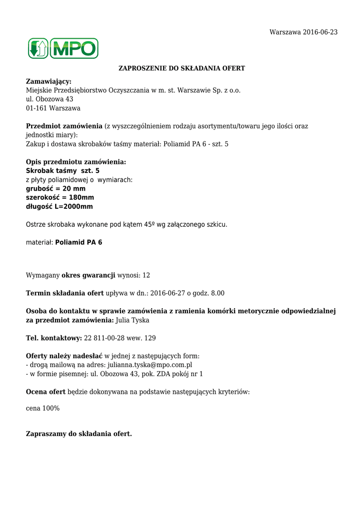 Warszawa 2016-06-23 ZAPROSZENIE DO SKŁADANIA OFERT Zamawiający: Miejskie Przedsiębiorstwo Oczyszczania w m. st. Warszawie Sp. z o.o. ul. Obozowa 43 01-161 Warszawa Przedmiot zamówienia (z wyszczególnieniem rodzaju asortymentu/towaru jego ilości oraz jednostki miary): Zakup i dostawa skrobaków taśmy materiał: Poliamid PA 6 - szt. 5 Opis przedmiotu zamówienia: Skrobak taśmy szt. 5 z płyty poliamidowej o wymiarach: grubość = 20 mm szerokość = 180mm długość L=2000mm Ostrze skrobaka wykonane pod kątem 45º wg załączonego szkicu. materiał: Poliamid PA 6 Wymagany okres gwarancji wynosi: 12 Termin składania ofert upływa w dn.: 2016-06-27 o godz. 8.00 Osoba do kontaktu w sprawie zamówienia z ramienia komórki metorycznie odpowiedzialnej za przedmiot zamówienia: Julia Tyska Tel. kontaktowy: 22 811-00-28 wew. 129 Oferty należy nadesłać w jednej z następujących form: - drogą mailową na adres: [email protected] - w formie pisemnej: ul. Obozowa 43, pok. ZDA pokój nr 1 Ocena ofert będzie dokonywana na podstawie następujących kryteriów: cena 100% Zapraszamy do składania ofert.