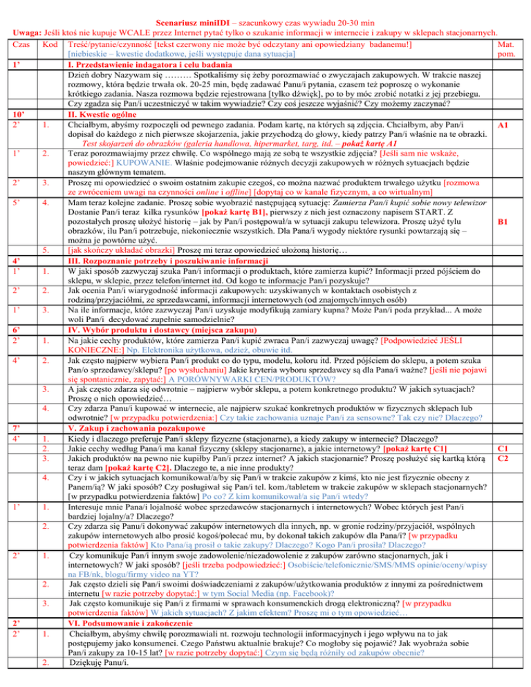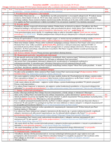 Scenariusz miniIDI – szacunkowy czas wywiadu 20-30 min Uwaga: Jeśli ktoś nie kupuje WCALE przez Internet pytać tylko o szukanie informacji w internecie i zakupy w sklepach stacjonarnych. Czas Kod Treść/pytanie/czynność [tekst czerwony nie może być odczytany ani opowiedziany badanemu!] Mat. [niebieskie – kwestie dodatkowe, jeśli występuje dana sytuacja] pom. 1’ I. Przedstawienie indagatora i celu badania Dzień dobry Nazywam się ……… Spotkaliśmy się żeby porozmawiać o zwyczajach zakupowych. W trakcie naszej rozmowy, która będzie trwała ok. 20-25 min, będę zadawać Panu/i pytania, czasem też poproszę o wykonanie krótkiego zadania. Nasza rozmowa będzie rejestrowana [tylko dźwięk], po to by móc zrobić notatki z jej przebiegu. Czy zgadza się Pan/i uczestniczyć w takim wywiadzie? Czy coś jeszcze wyjaśnić? Czy możemy zaczynać? 10’ II. Kwestie ogólne 2’ 1. Chciałbym, abyśmy rozpoczęli od pewnego zadania. Podam kartę, na których są zdjęcia. Chciałbym, aby Pan/i A1 dopisał do każdego z nich pierwsze skojarzenia, jakie przychodzą do głowy, kiedy patrzy Pan/i właśnie na te obrazki. Test skojarzeń do obrazków (galeria handlowa, hipermarket, targ, itd. – pokaż kartę A1 1’ 2. Teraz porozmawiajmy przez chwilę. Co wspólnego mają ze sobą te wszystkie zdjęcia? [Jeśli sam nie wskaże, powiedzieć:] KUPOWANIE. Właśnie podejmowanie różnych decyzji zakupowych w różnych sytuacjach będzie naszym głównym tematem. 2’ 3. Proszę mi opowiedzieć o swoim ostatnim zakupie czegoś, co można nazwać produktem trwałego użytku [rozmowa ze zwróceniem uwagi na czynności online i offline] [dopytaj co w kanale fizycznym, a co wirtualnym] 5’ 4. Mam teraz kolejne zadanie. Proszę sobie wyobrazić następującą sytuację: Zamierza Pan/i kupić sobie nowy telewizor Dostanie Pan/i teraz kilka rysunków [pokaż kartę B1], pierwszy z nich jest oznaczony napisem START. Z pozostałych proszę ułożyć historię – jak by Pan/i postępował/a w sytuacji zakupu telewizora. Proszę użyć tylu B1 obrazków, ilu Pan/i potrzebuje, niekoniecznie wszystkich. Dla Pana/i wygody niektóre rysunki powtarzają się – można je powtórne użyć. 5. [jak skończy układać obrazki] Proszę mi teraz opowiedzieć ułożoną historię… 4’ III. Rozpoznanie potrzeby i poszukiwanie informacji 1’ 1. W jaki sposób zazwyczaj szuka Pan/i informacji o produktach, które zamierza kupić? Informacji przed pójściem do sklepu, w sklepie, przez telefon/internet itd. Od kogo te informacje Pan/i pozyskuje? 2’ 2. Jak ocenia Pan/i wiarygodność informacji zakupowych: uzyskiwanych w kontaktach osobistych z rodziną/przyjaciółmi, ze sprzedawcami, informacji internetowych (od znajomych/innych osób) 1’ 3. Na ile informacje, które zazwyczaj Pan/i uzyskuje modyfikują zamiary kupna? Może Pan/i poda przykład... A może woli Pan/i decydować zupełnie samodzielnie? 6’ IV. Wybór produktu i dostawcy (miejsca zakupu) 2’ 1. Na jakie cechy produktów, które zamierza Pan/i kupić zwraca Pan/i zazwyczaj uwagę? [Podpowiedzieć JEŚLI KONIECZNE:] Np. Elektronika użytkowa, odzież, obuwie itd. 4’ 2. Jak często najpierw wybiera Pan/i produkt co do typu, modelu, koloru itd. Przed pójściem do sklepu, a potem szuka Pan/o sprzedawcy/sklepu? [po wysłuchaniu] Jakie kryteria wyboru sprzedawcy są dla Pana/i ważne? [jeśli nie pojawi się spontanicznie, zapytać:] A PORÓWNYWARKI CEN/PRODUKTÓW? 3. A jak często zdarza się odwrotnie – najpierw wybór sklepu, a potem konkretnego produktu? W jakich sytuacjach? Proszę o nich opowiedzieć… 4. Czy 4 zdarza Panu/i kupować w internecie, ale najpierw szukać konkretnych produktów w fizycznych sklepach lub odwrotnie? [w przypadku potwierdzenia:] Czy takie zachowania uznaje Pan/i za sensowne? Tak czy nie? Dlaczego? 7’ V. Zakup i zachowania pozakupowe 4’ 1. Kiedy i dlaczego preferuje Pan/i sklepy fizyczne (stacjonarne), a kiedy zakupy w internecie? Dlaczego? 2. Jakie cechy według Pana/i ma kanał fizyczny (sklepy stacjonarne), a jakie internetowy? [pokaż kartę C1] C1 3. Jakich produktów na pewno nie kupiłby Pan/i przez internet? A jakich stacjonarnie? Proszę posłużyć się kartką którą C2 teraz dam [pokaż kartę C2]. Dlaczego te, a nie inne produkty? 4. Czy i w jakich sytuacjach komunikował/a/by się Pan/i w trakcie zakupów z kimś, kto nie jest fizycznie obecny z Panem/ią? W jaki sposób? Czy posługiwał się Pan/i tel. kom./tabletem w trakcie zakupów w sklepach stacjonarnych? [w przypadku potwierdzenia faktów] Po co? Z kim komunikował/a się Pan/i wtedy? 1’ 1. Interesuje mnie Pana/i lojalność wobec sprzedawców stacjonarnych i internetowych? Wobec których jest Pan/i bardziej lojalny/a? Dlaczego? 2. Czy zdarza się Panu/i dokonywać zakupów internetowych dla innych, np. w gronie rodziny/przyjaciół, wspólnych zakupów internetowych albo prosić kogoś/polecać mu, by dokonał takich zakupów dla Pana/i? [w przypadku potwierdzenia faktów] Kto Pana/ią prosił o takie zakupy? Dlaczego? Kogo Pan/i prosiła? Dlaczego? 2’ 1. Czy komunikuje Pan/i innym swoje zadowolenie/niezadowolenie z zakupów zarówno stacjonarnych, jak i internetowych? W jaki sposób? [jeśli trzeba podpowiedzieć:] Osobiście/telefonicznie/SMS/MMS opinie/oceny/wpisy na FB/nk, blogu/firmy video na YT? 2. Jak często dzieli się Pan/i swoimi doświadczeniami z zakupów/użytkowania produktów z innymi za pośrednictwem internetu [w razie potrzeby dopytać:] w tym Social Media (np. Facebook)? 3. Jak często komunikuje się Pan/i z firmami w sprawach konsumenckich drogą elektroniczną? [w przypadku potwierdzenia faktów] W jakich sytuacjach? Z jakim efektem? Proszę mi o tym opowiedzieć… 2’ VI. Podsumowanie i zakończenie 2’ 1. Chciałbym, abyśmy chwilę porozmawiali nt. rozwoju technologii informacyjnych i jego wpływu na to jak postępujemy jako konsumenci. Czego Państwu aktualnie brakuje? Co mogłoby s