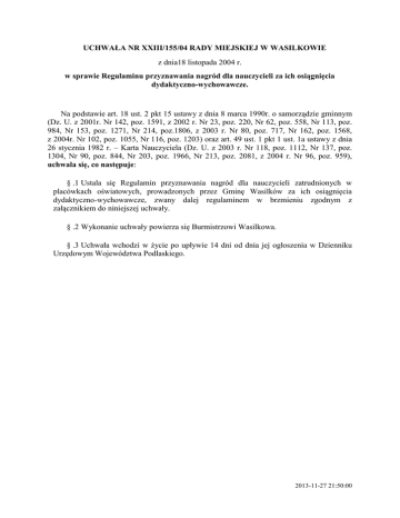 UCHWAŁA NR XXIII/155/04 RADY MIEJSKIEJ W WASILKOWIE z dnia18 listopada 2004 r. w sprawie Regulaminu przyznawania nagród dla nauczycieli za ich osiągnięcia dydaktyczno-wychowawcze. Na podstawie art. 18 ust. 2 pkt 15 ustawy z dnia 8 marca 1990r. o samorządzie gminnym (Dz. U. z 2001r. Nr 142, poz. 1591, z 2002 r. Nr 23, poz. 220, Nr 62, poz. 558, Nr 113, poz. 984, Nr 153, poz. 1271, Nr 214, poz.1806, z 2003 r. Nr 80, poz. 717, Nr 162, poz. 1568, z 2004r. Nr 102, poz. 1055, Nr 116, poz. 1203) oraz art. 49 ust. 1 pkt 1 ust. 1a ustawy z dnia 26 stycznia 1982 r. – Karta Nauczyciela (Dz. U. z 2003 r. Nr 118, poz. 1112, Nr 137, poz. 1304, Nr 90, poz. 844, Nr 203, poz. 1966, Nr 213, poz. 2081, z 2004 r. Nr 96, poz. 959), uchwala się, co następuje: § .1 Ustala się Regulamin przyznawania nagród dla nauczycieli zatrudnionych w placówkach oświatowych, prowadzonych przez Gminę Wasilków za ich osiągnięcia dydaktyczno-wychowawcze, zwany dalej regulaminem w brzmieniu zgodnym z załącznikiem do niniejszej uchwały. § .2 Wykonanie uchwały powierza się Burmistrzowi Wasilkowa. § .3 Uchwała wchodzi w życie po upływie 14 dni od dnia jej ogłoszenia w Dzienniku Urzędowym Województwa Podlaskiego. 2013-11-27 21:50:00 Załącznik do Uchwały Nr XXIII/155/04 Rady Miejskiej w Wasilkowie z dnia 18 listopada 2004 r. REGULAMIN PRZYZNAWANIA NAGRÓD DLA NAUCZYCIELI ZATRUDNIONYCH W PLACÓWKACH OŚWIATOWYCH, PROWADZONYCH PRZEZ GMINĘ WASILKÓW ZA ICH OSIĄGNIĘCIA DYDAKTYCZNO – WYCHOWAWCZE. §1 Ilekroć w niniejszym regulaminie jest mowa bez bliższego określenia o: 1) placówkach – należy przez to rozumieć szkoły i przedszkola prowadzone przez Gminę Wasilków zwaną dalej gminą, 2) nauczycielach – należy przez to rozumieć nauczycieli wychowawców i innych pracowników pedagogicznych zatrudnionych w placówkach prowadzonych przez gminę, 3) nagrodzie Burmistrza - należy przez to rozumieć nagrodę organu prowadzącego placówkę, 4) nagrodzie dyrektora - należy przez to rozumieć nagrodę dyrektora placówki, 5) funduszu nagród - należy przez to rozumieć specjalny fundusz nagród dla nauczycieli za ich osiągnięcia dydaktyczno-wychowawcze przeznaczony na wypłaty nagród Burmistrza i nagród dyrektorów. §2 1. W budżecie gminy na specjalny fundusz nagród dla nauczycieli przeznacza się corocznie środki w wysokości, co najmniej 1% planowanych rocznych wynagrodzeń osobowych nauczycieli z przeznaczeniem na wypłaty nagród: 1) Burmistrza, 2) dyrektorów placówek. 2. Z funduszu o którym mowa w ust. 1 przeznacza się 20% na nagrody Burmistrza dla dyrektorów i nauczycieli i 80% na nagrody przyznawane przez dyrektorów dla nauczycieli szkół i innych placówek prowadzonych przez gminę w rozumieniu art. 3 pkt 2 ustawy Karta Nauczyciela. 3. Nagrody, o których mowa w ust. 2 mogą być przyznawane z okazji: 1) Dnia Edukacji Narodowej 2) innych ważnych uroczystości szkolnych. §3 2013-11-27 21:50:00 1. Nagrody mogą być przyznawane dyrektorom i nauczycielom po przepracowaniu w placówce, co najmniej 1 roku. 2. Nagroda, o której mowa w § 2, może być przyznana nauczycielowi, który w okresie pięciu ostatnich lat uzyskał wyróżniającą ocenę pracy pedagogicznej. §4 1. Z wnioskiem o przyznanie nagrody Burmistrza mogą wystąpić: 1) dla dyrektora placówki: a) sekretarz gminy, b) rada pedagogiczna, c) rada szkoły lub rada rodziców, d) zarząd zakładowej organizacji związkowej, 2) dla nauczyciela zatrudnionego w placówce: a) dyrektor placówki, b) rada szkoły lub rada rodziców c) zarząd zakładowej organizacji związkowej. 2. Wnioski winny być zaopiniowane przez radę pedagogiczną placówki i zarząd zakładowej organizacji związkowej. 3. Wzór wniosku, o którym mowa w ust. 1 określa załącznik do regulaminu. 4. W uzasadnieniu do wniosku należy zawrzeć informacje potwierdzające spełnienie wymagań, o których mowa w § 3 i 7. §5 1. Wnioski o nagrodę Burmistrza należy składać w sekretariacie Urzędu Miejskiego w Wasilkowie: 1) wnioski o nagrodę z okazji Dnia Edukacji Narodowej – do dnia 15 września danego roku, 2) wnioski o nagrodę z okazji ważnych uroczystości szkolnych – co najmniej na miesiąc przed datą uroczystości. 2. Wnioski, o których mowa w ust. 1 opiniuje komisja powołana przez Burmistrza. 3. W skład komisji, o której mowa w ust. 2, wchodzą: 1) przedstawiciel organu prowadzącego, 2) przedstawiciel rady pedagogicznej placówki, 3) przedstawiciele reprezentatywnych związków zawodowych. §6 Burmistrz może z własnej inicjatywy przyznać nagrodę dyrektorowi lub nauczycielowi, spełniającym warunki, o których mowa w § 7. W tym przypadku wniosek nie podlega zaopiniowaniu przez komisję, o której mowa w § 5 pkt 2 oraz radę pedagogiczną danej placówki i organizacje związkowe. §7 2013-11-27 21:50:00 1. Nagroda Burmistrza może być przyznana nauczycielowi, w tym pełniącemu funkcje kierownicze, który spełnia odpowiednio warunki określone w § 3 oraz co najmniej pięć z następujących kryteriów: 1) Osiąga bardzo dobre wyniki w nauczaniu potwierdzone w sprawdzianach i egzaminach uczniów, prowadzonych przez okręgowe komisje egzaminacyjne lub zakwalifikowaniem się uczniów do udziału w okręgowych, wojewódzkich lub ogólnopolskich zawodach, konkursach, przeglądach i festiwalach, 2) Posiada udokumentowane osiągnięcia w pracy z uczniami (wychowankami) uzdolnionymi lub mającymi trudności w nauce (adaptacji), 3) Podejmuje udokumentowaną działalność innowacyjną, 4) Opracował autorski program nauczania, jest autorem publikacji metodycznych, 5) Wzorowo przygotowuje i organizuje uroczystości szkolne lub środowiskowe, imprezy kulturalne, sportowe, rekreacyjne, 6) Organizuje i kieruje systemowymi działaniami na rzecz diagnozowania i podnoszenia jakości pracy placówki, 7) Dba o właściwy klimat pedagogiczny, wdraża rozwiązania na rzecz podnoszenia poziomu organizacyjnego placówki, 8) Wyróżnia si