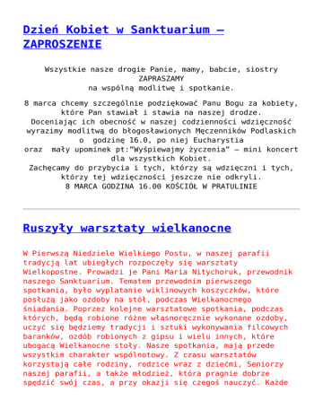 Dzień Kobiet w Sanktuarium – ZAPROSZENIE Wszystkie nasze drogie Panie, mamy, babcie, siostry ZAPRASZAMY na wspólną modlitwę i spotkanie. 8 marca chcemy szczególnie podziękować Panu Bogu za kobiety, które Pan stawiał i stawia na naszej drodze. Doceniając ich obecność w naszej codzienności wdzięczność wyrazimy modlitwą do błogosławionych Męczenników Podlaskich o godzinę 16.0, po niej Eucharystia oraz mały upominek pt:”Wyśpiewajmy życzenia” – mini koncert dla wszystkich Kobiet. Zachęcamy do przybycia i tych, którzy są wdzięczni i tych, którzy tej wdzięczności jeszcze nie odkryli. 8 MARCA GODZINA 16.00 KOŚCIÓŁ W PRATULINIE Ruszyły warsztaty wielkanocne W Pierwszą Niedziele Wielkiego Postu, w naszej parafii tradycją lat ubiegłych rozpoczęły się warsztaty Wielkopostne. Prowadzi je Pani Maria Nitychoruk, przewodnik naszego Sanktuarium. Tematem przewodnim pierwszego spotkania, było wyplatanie wiklinowych koszyczków, które posłużą jako ozdoby na stół, podczas Wielkanocnego śniadania. Poprzez kolejne warsztatowe spotkania, podczas których, będą robione różne własnoręcznie wykonane ozdoby, uczyć się będziemy tradycji i sztuki wykonywania filcowych baranków, ozdób robionych z gipsu i wielu innych, które ubogacą Wielkanocne stoły. Nasze spotkania, mają przede wszystkim charakter wspólnotowy. Z czasu warsztatów korzystają całe rodziny, rodzice wraz z dziećmi, Seniorzy naszej parafii, a także młodzież, która pragnie dobrze spędzić swój czas, a przy okazji się czegoś nauczyć. Każde nasze spotkanie rozpoczyna sie modlitwą i prośbą o błogosławieństwo naszej wspólnej pracy i razem spędzonego czasu. Jak się okazuje sztuka wikliniarska, wymaga nie lada umiejętności, skupienia, a także wielkiej precyzji, co jest okazją do uczenia się cierpliwości. Naszej pracy towarzyszą rozmowy, wspólna wymiana doświadczeń, wzajemna pomoc, a także wiele radości. Zapraszamy w każdą niedzielę wielkiego postu na godz. 15.00 do sali pod plebanią by dołączyć do grona tych, którzy nie bojąc się wyzwań odkrywają wielką wartość wspólnie spędzonego czasu. Zachęcamy kilkoma fotkami wykonanymi podczas ostatniego spotkania. 12► I niedziela Wielkiego Postu /05.03.2017/ 1. Dziś niedziela różańcowa zmianka o godz. 11.30 oraz miesięczna adoracja Najświętszego Sakramentu wraz ze śpiewem Gorzkich Żali po Mszy o godz. 12.00. Ofiary zaś składane na tacę przekazujemy zgodnie z decyzją biskupa ordynariusza na jubileusz 200 lecia diecezji siedleckiej. 2. Zbliża się czas marcowej modlitwy przed świętym Józefem. W naszym dekanacie nowenna do św. Józefa w Szpakach codziennie od 11-19 marca. W imieniu Kustosza zapraszamy do wspólnoty modlitwy już w najbliższą sobotę o godz. 19.30 Chętnych zapisujemy na wyjazd w zakrystii. 3. Za tydzień II niedziela miesiąca słowo i cykliczne spotkanie z dziećmi o godz. 12.00 oraz katecheza dla dzieci pierwszokomunijnych. 4. Nabożeństwa wielkopostne: piątek godz. 16.00 Droga Krzyżowa, niedziela po mszy o godz. 12.00 i w kaplicy po mszy o godz. 10.00 Gorzkie Żale. 5. Tradycyjnie w niedzielę wielkiego postu o godz. 15.00 zapraszamy dzieci, młodzież i dorosłych na wspólne spotkania warsztatowe w sali plebanii. 6. Za tydzień niedziela pomocy Kościołowi w świecie tzw “Ad gentes” – na ten cel do puszek będą zbierane dobrowolne ofiary po każdej Mszy świętej. 7. 17 marca w Białej Podlaskiej odbędzie się spotkanie w ramach Przystanku Światowych Dni Młodzieży. Gościem specjalnym będzie Ks. Witerski Andrzej – Egzorcysta, który odprawi Mszę świętą z modlitwą o uzdrowienie i uwolnienie. Zapraszamy młodzież i wszystkich chętnych do uczestnictwa w tym spotkaniu. Zapisy na wyjazd w w zakrystii. 8. Darem materialnym wsparli naszą parafię: mieszkańcy Bohukał – Cieleśnicy – Zaczopek – Pratulina – Woroblina – wdzięczni za przekazane datki składamy – Bóg zapłać. 9. Wychodząc znajdziemy na stoliku “Dobre Słowo” na ten tydzień – czyli Echo katolickie i Niedziela – nasza cotygodniowa prasa – polecamy. 10. W środę 8 marca Dzień Kobiet – już dziś z całego serca dziękujemy wam Drogie Panie za wasze ciche i codzienne towarzyszenie nam w drodze do świętości. Szczególną modlitwą i słowem chcemy się podzielić w środę o godz.16.00 11. Zawierzamy też wstawiennictwu naszych błogosławionych Unitów życie, radości i smutki wszystkich czcicieli, solenizantów rozpoczynającego się tygodnia i całą naszą parafię. 12. Zmarłym z naszych rodzin, polecanym w wypominkach parafialnych oddajmy naszą modlitwę o miłosierdzie Boże dla nich. VIII niedziela zwykła /26.02.2017/ 1. Za wspólną modlitwę i spotkanie w ramach Pratulińskiej Szkoły Wiary składamy staropolskie Bóg zapłać. 2. W środę rozpoczynamy wyjątkowy czas Kościoła – Wielki Post. Liturgia z obrzędem posypania głów popiołem o 11.00 i 17.00 w Kościele, a kaplicy o 15.00. W tym dniu obowiązuje post ścisły i wstrzemięźliwość od pokarmów mięsnych. Pomyślmy już dziś nad przygotowaniem się do przemyśleń nad potrzebą naszego nawrócenia i skorzystajmy z łaski nabożeństw, które w wielkim poście pomagają nam odkryć drogę do Boga. 3. Zapraszamy na nabożeństwo Drogi Krzyżowej w każdy piątek o godz. 16.00, Gorzkie Żale – niedziela po mszy o godz. 12.00 4. W tym tygodniu pierwszy czwartek – adoracja Najświętszego Sakramentu i godzina święta od 15.00 w kościele. 5. Pierwszy piątek i sobota miesiąca to cześć oddawana Najświętszemu Sercu Pana Jezusa i Niepokalanej Matce Maryi. Nabożeństwa wynagradzające o godz. 16.00, w kaplicy Cieleśnica o 15.00. 6. Chorych odwiedzimy w środę popielcową od godz. 9.00 7. Za tydzień pierwsza niedziela miesiąca. Na godz. 11.30 zapraszamy wszystkich członków Kół Różańcowych z naszej parafii na zmiankę i do wspólnej modlitwy, którą poprow