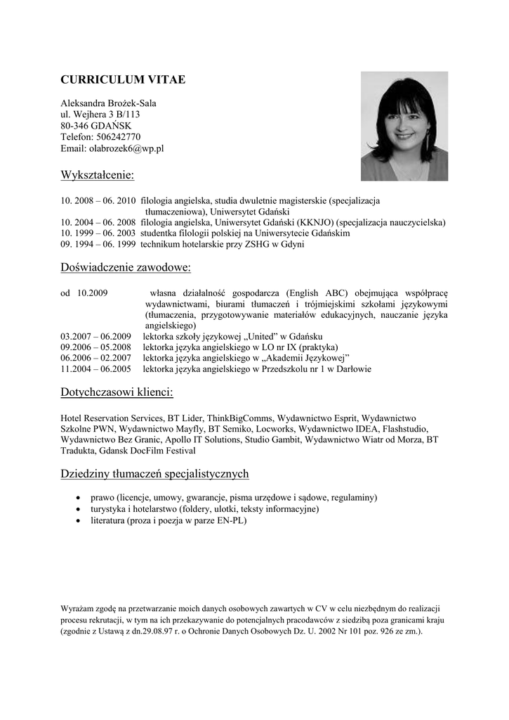 CURRICULUM VITAE Aleksandra Brożek-Sala ul. Wejhera 3 B/113 80-346 GDAŃSK Telefon: 506242770 Email: [email protected] Wykształcenie: 10. 2008 – 06. 2010 filologia angielska, studia dwuletnie magisterskie (specjalizacja tłumaczeniowa), Uniwersytet Gdański 10. 2004 – 06. 2008 filologia angielska, Uniwersytet Gdański (KKNJO) (specjalizacja nauczycielska) 10. 1999 – 06. 2003 studentka filologii polskiej na Uniwersytecie Gdańskim 09. 1994 – 06. 1999 technikum hotelarskie przy ZSHG w Gdyni Doświadczenie zawodowe: od 10.2009 03.2007 – 06.2009 09.2006 – 05.2008 06.2006 – 02.2007 11.2004 – 06.2005 własna działalność gospodarcza (English ABC) obejmująca współpracę wydawnictwami, biurami tłumaczeń i trójmiejskimi szkołami językowymi (tłumaczenia, przygotowywanie materiałów edukacyjnych, nauczanie języka angielskiego) lektorka szkoły językowej „United” w Gdańsku lektorka języka angielskiego w LO nr IX (praktyka) lektorka języka angielskiego w „Akademii Językowej” lektorka języka angielskiego w Przedszkolu nr 1 w Darłowie Dotychczasowi klienci: Hotel Reservation Services, BT Lider, ThinkBigComms, Wydawnictwo Esprit, Wydawnictwo Szkolne PWN, Wydawnictwo Mayfly, BT Semiko, Locworks, Wydawnictwo IDEA, Flashstudio, Wydawnictwo Bez Granic, Apollo IT Solutions, Studio Gambit, Wydawnictwo Wiatr od Morza, BT Tradukta, Gdansk DocFilm Festival Dziedziny tłumaczeń specjalistycznych prawo (licencje, umowy, gwarancje, pisma urzędowe i sądowe, regulaminy) turystyka i hotelarstwo (foldery, ulotki, teksty informacyjne) literatura (proza i poezja w parze EN-PL) Wyrażam zgodę na przetwarzanie moich danych osobowych zawartych w CV w celu niezbędnym do realizacji procesu rekrutacji, w tym na ich przekazywanie do potencjalnych pracodawców z siedzibą poza granicami kraju (zgodnie z Ustawą z dn.29.08.97 r. o Ochronie Danych Osobowych Dz. U. 2002 Nr 101 poz. 926 ze zm.). Przekłady: Jarosław Tomasiewicz, Zło w imię dobra. Zjawisko przemocy w polityce. Wydawnictwo Szkolne PWN, 2009. (fragmenty) Mark Bowden, Helikopter w ogniu (Black Hawk Down), Mayfly 2011. Carver Alan Ames, Oczami Jezusa cz. 2 (Through the Eyes of Jezus, vol. 2), Esprit 2011. Carver Alan Ames, Oczami Jezusa cz. 3 (Through the Eyes of Jezus, vol. 2), Esprit 2012. Verna van Schaik, Zanurzona (Fatally Flawed), Mayfly 2012. W. J. Peasley, Ostatni koczownicy (The Last of the Nomads), Bez Granic, 2013. Tadeusz Karmazyn, wiersz pt. Taniec [w:] Powroty/Returns, Marpress 2013. Jason Verch, Wewnętrzna granica, [w:] Szortal na wynos. Miesięcznik krótkich form literackich. Lipiec 2014, ISSN 2300-6935. John Philip Johnson, Obserwując rakiety [w:] Szortal na wynos. Miesięcznik krótkich form literackich. Sierpień 2014, ISSN 2300-6935. Russell Willingham, Uwolnienie od uzależnień (Breaking Free), Esprit, w przygotowaniu. Matthew Kneale, Anglicy na pokładzie (English Passengers), Wiatr od Morza, w przygotowaniu (fragment). Publikacje: Ciasteczko, Udane rozdanie, Babki [w:] Po 100 Słowie, Solaris, 2014, ISBN 978-83-7590-199-3. Kikuty, [w:] Szortal Fiction, Solaris, 2013, ISBN 978-83-7590-136-8. Are We, Humans, Just a Joke? Luck-Jape-Determinism [w:] HWAET vol.1, Gdańsk 2011, ISSN 20823118. Absynt [w:] Sny malarzy – sny poetów. Ogólnopolski konkurs literacki, Katowice 2011, ISBN 978-839191-85-08-9-7 Chimeryczność rzeczy martwych (wraz z Rafałem Salą) [w:] QFant. Dwumiesięcznik fantastycznokryminalny. Numer 13/11. ISSN 2080-2633. Znajomość języków obcych: angielski (CPE, BEC Higher, Certificate in Adult Literacy) szwedzki (bardzo dobry) niemiecki (podstawowy) hiszpański (podstawowy) Zainteresowania: literatura, nauka języków obcych, jeździectwo, turystyka Wyrażam zgodę na przetwarzanie moich danych osobowych zawartych w CV w celu niezbędnym do realizacji procesu rekrutacji, w tym na ich przekazywanie do potencjalnych pracodawców z siedzibą poza granicami kraju (zgodnie z Ustawą z dn.29.08.97 r. o Ochronie Danych Osobowych Dz. U. 2002 Nr 101 poz. 926 ze zm.).