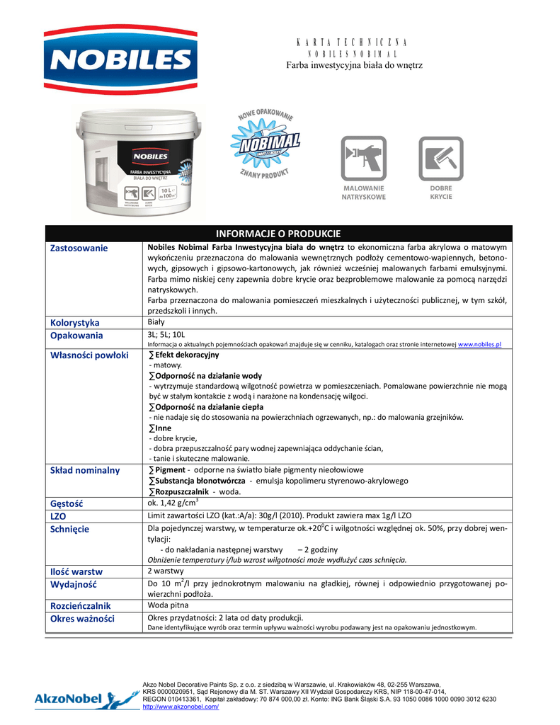 KARTA TECHNICZNA NOBILES NOBIMAL Farba inwestycyjna biała do wnętrz INFORMACJE O PRODUKCIE Kolorystyka Opakowania Nobiles Nobimal Farba Inwestycyjna biała do wnętrz to ekonomiczna farba akrylowa o matowym wykończeniu przeznaczona do malowania wewnętrznych podłoży cementowo-wapiennych, betonowych, gipsowych i gipsowo-kartonowych, jak również wcześniej malowanych farbami emulsyjnymi. Farba mimo niskiej ceny zapewnia dobre krycie oraz bezproblemowe malowanie za pomocą narzędzi natryskowych. Farba przeznaczona do malowania pomieszczeń mieszkalnych i użyteczności publicznej, w tym szkół, przedszkoli i innych. Biały 3L; 5L; 10L Własności powłoki · Efekt dekoracyjny Zastosowanie Informacja o aktualnych pojemnościach opakowań znajduje się w cenniku, katalogach oraz stronie internetowej www.nobiles.pl - matowy. · Odporność na działanie wody - wytrzymuje standardową wilgotność powietrza w pomieszczeniach. Pomalowane powierzchnie nie mogą być w stałym kontakcie z wodą i narażone na kondensację wilgoci. · Odporność na działanie ciepła - nie nadaje się do stosowania na powierzchniach ogrzewanych, np.: do malowania grzejników. · Inne - dobre krycie, - dobra przepuszczalność pary wodnej zapewniająca oddychanie ścian, - tanie i skuteczne malowanie. Skład nominalny Gęstość LZO Schnięcie · Pigment - odporne na światło białe pigmenty nieołowiowe · Substancja błonotwórcza - emulsja kopolimeru styrenowo-akrylowego · Rozpuszczalnik - woda. ok. 1,42 g/cm3 Limit zawartości LZO (kat.:A/a): 30g/l (2010). Produkt zawiera max 1g/l LZO Dla pojedynczej warstwy, w temperaturze ok.+200C i wilgotności względnej ok. 50%, przy dobrej wentylacji: - do nakładania następnej warstwy – 2 godziny Obniżenie temperatury i/lub wzrost wilgotności może wydłużyć czas schnięcia. Ilość warstw Wydajność Rozcieńczalnik Okres ważności 2 warstwy Do 10 m2/l przy jednokrotnym malowaniu na gładkiej, równej i odpowiednio przygotowanej powierzchni podłoża. Woda pitna Okres przydatności: 2 lata od daty produkcji. Dane identyfikujące wyrób oraz termin upływu ważności wyrobu podawany jest na opakowaniu jednostkowym. Akzo Nobel Decorative Paints Sp. z o.o. z siedzibą w Warszawie, ul. Krakowiaków 48, 02-255 Warszawa, KRS 0000020951, Sąd Rejonowy dla M. ST. Warszawy XII Wydział Gospodarczy KRS, NIP 118-00-47-014, REGON 010413361, Kapitał zakładowy: 70 874 000,00 zł. Konto: ING Bank Śląski S.A. 93 1050 0086 1000 0090 3012 6230 http://www.akzonobel.com/ KARTA TECHNICZNA NOBILES NOBIMAL Farba inwestycyjna biała do wnętrz STOSOWANIE PRODUKTU Przygotowanie wyrobu Przygotowanie podłoża Nie dodawać obcych składników. Przed użyciem farbę dokładnie wymieszaj. Powierzchnie powinny być zwarte, jednolite, czyste i suche (np. tynki malować po 4 tygodniach sezonowania lub po czasie wskazanym przez producenta danego tynku, gładzi, szpachli). W przypadku podłoży poddanych renowacji należy ocenić stan podłoża, jeżeli jest stare i zwietrzałe, kruszące się i pylące powinno być poddane ekspertyzie budowlanej. 1. Powłoki farb wapiennych, klejowych oraz słabo przyczepnych należy całkowicie usunąć z podłoża, a następnie powierzchnie przemyj wodą w celu usunięcia pylistych pozostałości i kurzu. Pozostaw do wyschnięcia. 2. Z powierzchni należy usunąć zanieczyszczenia ograniczające przyczepność farby (tłuste plamy, pleśń). Zanieczyszczenia zmyj wodą ze środkiem myjącym. Pozostaw do wyschnięcia. 3. Powierzchnie zagrzybione oczyść za pomocą szpachelki, a następnie zastosuj odpowiedni środek grzybobójczy. 4. Nierówności i uszkodzenia powierzchni wypełnij odpowiednią masą szpachlową, a następnie wyrównaj i wygładź. 5. Zagruntuj malowane powierzchnie: · Wcześniej nie malowane tynki betonowe i cementowo-wapienne zagruntuj farbą Nobiles Nobimal rozcieńczoną 10-20% dodatkiem wody pitnej. · Podłoża silnie chłonne, niestabilne i skredowane zagruntuj wstępnie podkładem Nobiles Nobigrunt. · Podłoża wcześniej malowane farbami emulsyjnymi, których powierzchnia jest jednolita, dobrze przyczepna, nie jest pyląca lub uszkodzona malować bez gruntowania. Uwaga! Na podłożach uprzednio malowanych wykonaj na małej powierzchni wymalowanie próbne. Jeżeli po wyschnięciu farby powstanie niepożądany efekt, poprzednie powłoki należy całkowicie usunąć i na nowo przygotować je do malowania. Malowanie · Warunki malowania 0 0 - temperatura otoczenia i malowanej powierzchni powinna być pomiędzy +10 C a +30 C - wilgotność względna powietrza powinna być niższa niż 80% · Zalecane metody malowania - pędzel: najlepszy efekt uzyskasz stosując pędzle z włosia syntetycznego - wałek: najlepszy efekt uzyskasz stosując wałki z runa naturalnego o długości runa 10-18 mm - natrysk hydrodynamiczny: zalecane parametry urządzenia: o ciśnienie robocze 220 [bar] o średnica dyszy 0,017” / 0,43 mm (dysza PAA517) o kąt natrysku 50 Parametry natrysku wykonane na urządzeniach firmy GRACO, model STmax395 Dobór parametrów do metody natryskowej uzależniony jest od indywidualnych potrzeb i cech urządzenia, powinien być poprzedzony próbami technicznymi. · Parametry malowania nawierzchniowego (ostatecznego) Malowanie pędzlem, wałkiem, natryskiem: - nakładaj 2 warstwy farby w odstępie 2 godzin od naniesienia poprzedniej warstwy, - nabieraj na wałek lub pędzel obfite i równomierne ilości farby, - rozprowadzaj dokładnie do uzyskania równomiernej warstwy. Uwaga! Do malowania dużych powierzchni zalecamy używanie farb z jednej serii produkcyjnej. Numer serii na opakowaniu. Po zakończeniu prac malarskich pomieszczenie wietrzyć do zaniku charakterystycznego zapachu. Czyszczenie narzędzi malarskich Po zakończeniu malowania zaleca się usunąć z narzędzi jak największą ilość farby, a następnie umyć je czystą wodą. Nie używać pustych opakowań do przechowywania żywności. Akzo Nobel Dec