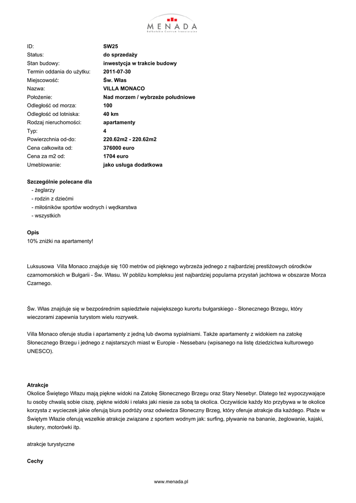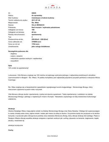 ID: SW25 Status: do sprzedaży Stan budowy: inwestycja w trakcie budowy Termin oddania do użytku: 2011-07-30 Miejscowość: Św. Włas Nazwa: VILLA MONACO Położenie: Nad morzem / wybrzeże południowe Odległość od morza: 100 Odległość od lotniska: 40 km Rodzaj nieruchomości: apartamenty Typ: 4 Powierzchnia od-do: 220.62m2 - 220.62m2 Cena całkowita od: 376000 euro Cena za m2 od: 1704 euro Umeblowanie: jako usługa dodatkowa Szczególnie polecane dla - żeglarzy - rodzin z dziećmi - miłośników sportów wodnych i wędkarstwa - wszystkich Opis 10% zniżki na apartamenty! Luksusowa Villa Monaco znajduje się 100 metrów od pięknego wybrzeża jednego z najbardziej prestiżowych ośrodków czarnomorskich w Bułgarii - Św. Własu. W pobliżu kompleksu jest najbardziej popularna przystań jachtowa w obszarze Morza Czarnego. Św. Włas znajduje się w bezpośrednim sąsiedztwie największego kurortu bułgarskiego - Słonecznego Brzegu, który wieczorami zapewnia turystom wielu rozrywek. Villa Monaco oferuje studia i apartamenty z jedną lub dwoma sypialniami. Także apartamenty z widokiem na zatokę Słonecznego Brzegu i jednego z najstarszych miast w Europie - Nessebaru (wpisanego na listę dziedzictwa kulturowego UNESCO). Atrakcje Okolice Świętego Włazu mają piękne widoki na Zatokę Słonecznego Brzegu oraz Stary Nesebyr. Dlatego też wypoczywające tu osoby chwalą sobie ciszę, piękne widoki i relaks jaki niesie za sobą ta okolica. Oczywiście każdy kto przybywa w te okolice korzysta z wycieczek jakie oferują biura podróży oraz odwiedza Słoneczny Brzeg, który oferuje atrakcje dla każdego. Plaże w Świętym Włazie oferują wszelkie atrakcje związane z sportem wodnym jak: surfing, pływanie na bananie, żeglowanie, kajaki, skutery, motorówki itp. atrakcje turystyczne Cechy www.menada.pl Dlaczego warto? Ciekawe usytuowanie obiektu w pierwszej linii brzegowej - z apartamentów rozpościera się niesamowity widok na morze Interesująca lokalizacja - Św. Włas to idealne miejsce do wypoczynku a bezpośrednie sąsiedztwo Słonecznego Brzegu dostarcza turystom wielu atrakcji deweloper oferuje różne możliwości planów płatności dostosowane do możliwości Inwestora a także ciekawe zniżki Cechy: Basen Plac zabaw dla dzieci Internet TV kablowa Ogród i tereny zielone Parking Całodobowa ochrona Usługi Roczna opłata za zarządzanie: 12 Euro/m2 z Vat Nasza firma dba o utrzymanie apartamentu w ciągu roku - Dla naszych Klientów zapewniamy utrzymanie nieruchomości, ochronę 24 h przez cały rok, oświetlenie, bezpieczeństwo elektryczne i wodne, naprawy, sprzątanie i czyszczenie części wspólnych, zieleni, czyszczenie apartamentu czy też płatności rachunków. Uzyskiwanie dodatkowych dochodów z ewentualnego wynajmu apartamentu - Zapewniamy bowiem również organizację wynajmu apartamentu. obsługa posprzedażowa Zasady płatności Plan zapłaty 1000 Eur depozytu 60 % przy podpisaniu umowy przedwstępnej 40 % przy akcie notarialnym Koszty www.menada.pl Należy pamiętać, iż oprócz ceny za nieruchomość dochodzą koszty związane z opłatą notarialną (jest to około 3,5 - 4% wartości zakupu). www.menada.pl