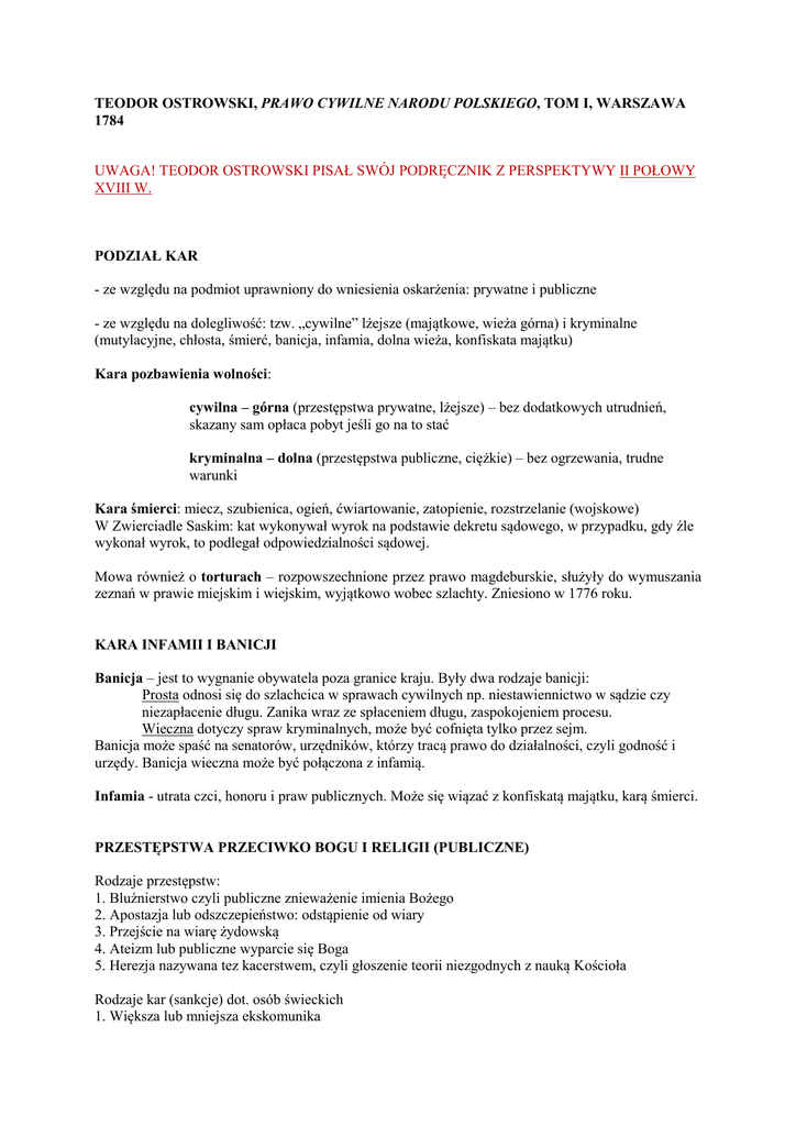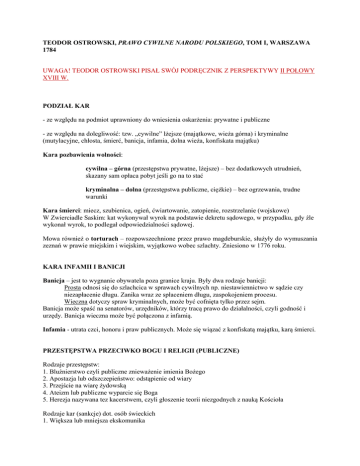 TEODOR OSTROWSKI, PRAWO CYWILNE NARODU POLSKIEGO, TOM I, WARSZAWA 1784 UWAGA! TEODOR OSTROWSKI PISAŁ SWÓJ PODRĘCZNIK Z PERSPEKTYWY II POŁOWY XVIII W. PODZIAŁ KAR - ze względu na podmiot uprawniony do wniesienia oskarżenia: prywatne i publiczne - ze względu na dolegliwość: tzw. „cywilne” lżejsze (majątkowe, wieża górna) i kryminalne (mutylacyjne, chłosta, śmierć, banicja, infamia, dolna wieża, konfiskata majątku) Kara pozbawienia wolności: cywilna – górna (przestępstwa prywatne, lżejsze) – bez dodatkowych utrudnień, skazany sam opłaca pobyt jeśli go na to stać kryminalna – dolna (przestępstwa publiczne, ciężkie) – bez ogrzewania, trudne warunki Kara śmierci: miecz, szubienica, ogień, ćwiartowanie, zatopienie, rozstrzelanie (wojskowe) W Zwierciadle Saskim: kat wykonywał wyrok na podstawie dekretu sądowego, w przypadku, gdy źle wykonał wyrok, to podlegał odpowiedzialności sądowej. Mowa również o torturach – rozpowszechnione przez prawo magdeburskie, służyły do wymuszania zeznań w prawie miejskim i wiejskim, wyjątkowo wobec szlachty. Zniesiono w 1776 roku. KARA INFAMII I BANICJI Banicja – jest to wygnanie obywatela poza granice kraju. Były dwa rodzaje banicji: Prosta odnosi się do szlachcica w sprawach cywilnych np. niestawiennictwo w sądzie czy niezapłacenie długu. Zanika wraz ze spłaceniem długu, zaspokojeniem procesu. Wieczna dotyczy spraw kryminalnych, może być cofnięta tylko przez sejm. Banicja może spaść na senatorów, urzędników, którzy tracą prawo do działalności, czyli godność i urzędy. Banicja wieczna może być połączona z infamią. Infamia - utrata czci, honoru i praw publicznych. Może się wiązać z konfiskatą majątku, karą śmierci. PRZESTĘPSTWA PRZECIWKO BOGU I RELIGII (PUBLICZNE) Rodzaje przestępstw: 1. Bluźnierstwo czyli publiczne znieważenie imienia Bożego 2. Apostazja lub odszczepieństwo: odstąpienie od wiary 3. Przejście na wiarę żydowską 4. Ateizm lub publiczne wyparcie się Boga 5. Herezja nazywana tez kacerstwem, czyli głoszenie teorii niezgodnych z nauką Kościoła Rodzaje kar (sankcje) dot. osób świeckich 1. Większa lub mniejsza ekskomunika 2. Pokuta publiczna 3. Kara pieniężna Rodzaje kar (sankcje) dotyczące osób duchownych 1. Suspensa czyli wydalanie ze stanu duchownego 2. Degradacja w hierarchii kościelnej Przejście na wiarę żydowską karane było infamią czyli pozbawieniem czci i dobrego imienia, wygnanie lub nawet śmierć Warunki odpowiedzialności za przestępstwa 1. Tylko oskarżenie z urzędu (publiczne) 2. Uporczywe trwanie w przestępstwie Sądownictwo dotyczące osób świeckich i duchownych sprawowały Magistratury następnie Trybunały składające się z osób zarówno świeckich i duchownych. PRZESTĘPSTWA OBRAZY MAJESTATU KRÓLEWSKIEGO I ZDRADY OJCZYZNY (PUBLICZNE) Zbrodnia obrazy majestatu: Zbrodnia ta miała charakter personalny, dotyczyła osoby panującego, jednak rozciągała się również na syna oraz ojca władcy. o wysokości kary decydował panujący, więc jej wymiar mógł być różny. Przewidywano również, że kara może (ale nie musi) dotyczyć całej rodziny sprawcy (odpowiedzialność zbiorowa). Warto zaznaczyć, że karany był też pomocnik, jednak jego kara była lżejsza. Zamiar popełnienia przestępstwa jest karalny. Rodzaje zbrodni majestatu przedstawia poniższy katalog przestępstw: • Działanie dążące do obalenia monarchy (nawet sam zamiar) • Wszelkie zniewagi monarchy • Niszczenie lub zniewaga posągów monarchy • Fałszowanie monety • Utrzymywanie prywatnych więzień (bezprawne uwięzienie – jest to uzurpacja kompetencji sądowniczych) Zbrodnia zdrady ojczyzny: Widoczne liczne recepcje z prawa rzymskiego. Tu, podobnie jak w przypadku zbrodni obrazy majestatu, karany jest również sam zamiar popełnienia czynu zabronionego (jednak wtedy kara jest mniejsza). Wszelkie pomocnictwo też jest sankcjonowane. Przykłady: próba obalenia rządu, spisek, bunt, sprzymierzenie się z wrogiem