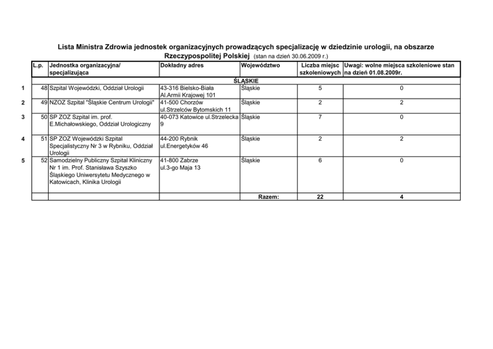 Lista Ministra Zdrowia jednostek organizacyjnych prowadzących specjalizację w dziedzinie urologii, na obszarze Rzeczypospolitej Polskiej (stan na dzień 30.06.2009 r.) L.p. Jednostka organizacyjna/ specjalizująca 1 48 Szpital Wojewódzki, Oddział Urologii 2 49 NZOZ Szpital "Śląskie Centrum Urologii" 3 50 SP ZOZ Szpital im. prof. E.Michałowskiego, Oddział Urologiczny 4 51 SP ZOZ Wojewódzki Szpital Specjalistyczny Nr 3 w Rybniku, Oddział Urologii 52 Samodzielny Publiczny Szpital Kliniczny Nr 1 im. Prof. Stanisława Szyszko Śląskiego Uniwersytetu Medycznego w Katowicach, Klinika Urologii 5 Dokładny adres Województwo ŚLĄSKIE 43-316 Bielsko-Biała Śląskie Al.Armii Krajowej 101 41-500 Chorzów Śląskie ul.Strzelców Bytomskich 11 40-073 Katowice ul.Strzelecka Śląskie 9 Liczba miejsc Uwagi: wolne miejsca szkoleniowe stan szkoleniowych na dzień 01.08.2009r. 5 0 2 2 7 0 44-200 Rybnik ul.Energetyków 46 Śląskie 2 2 41-800 Zabrze ul.3-go Maja 13 Śląskie 6 0 22 4 Razem: