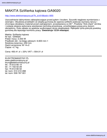 www.elektromaszyny.pl MAKITA Szlifierka kątowa GA9020 http://www.elektromaszyny.pl/?k_d=618&sid=1955 Uszczelnienie labiryntowe zabezpieczające przed pyłem i brudem. Szczotki węglowe wymieniane z zewnątrz. Obudowa przekładni ze stopką gumową do oparcia szlifierki podczas wymiany tarczy i chroniąca obrabiany materiał przed zadrapaniem, przestawiana co 90°. Powłoka "Zick-Zack" wirnika i izolacja stojana wykonana warstwowo techniką proszkową, umożliwiająca pracę przy dużym obciążeniu. Koła zębate ze spieków wydłużające okres eksploatacji. Rękojeść tylna pokryta powłoką gumową dla lepszego komfortu pracy. Gwarancja 12/24 miesiące. Makita: Szlifierka kątowa Nr kat.: GA9020 Pobór mocy: 2.200 W Prędkość obr. na biegu jałowym: 6.600 min-1 Średnica ściernicy: 230 mm Gwint wrzeciona: M 14×2 Ciężar: 4,7 kg Cena: 450.41 zł + 23% VAT = 554.01 zł ELEKTROMASZYNY.PL www.elektromaszyny.pl [email protected] tel.: 75 612 66 14 tel.: 71 722 02 29 fax: 75 612 66 02 tel. kom: 510 410 288 tel. kom: 509 767 001 www.elektromaszyny.pl