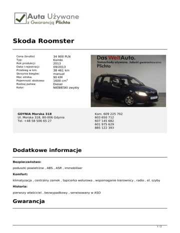 Skoda Roomster Cena (brutto) Typ: Rok produkcji: Data I rejestracji: Przebieg w km: Skrzynia biegów: Moc silnika: Pojemność skokowa: Rodzaj paliwa: Kolor: 34 900 PLN Kombi 2013 09/2013 38 461 km manual 90 KM 1600 cm3 Diesel NIEBIESKI zwykły GDYNIA Morska 318 Ul. Morska 318, 80-006 Gdynia Tel. +48 58 506 65 27 Kom. 609 225 702 603 650 712 607 145 682 601 975 629 885 122 393 Dodatkowe informacje Bezpieczeństwo: poduszki powietrzne , ABS , ASR , immobiliser Komfort: klimatyzacja , centralny zamek , tapicerka welurowa , wspomaganie kierownicy , radio , el. szyby Historia: pierwszy właściciel , bezwypadkowy , serwisowany w ASO Gwarancja 1/2 Szanowni Państwo, Pragniemy Państwa poinformować, iż firma Plichta – Autoryzowany Dealer Škoda Auto prowadzi skup oraz sprzedaż samochodów używanych wszystkich marek, oferując także samochody używane z gwarancją objęte programem „Auta używane z Gwarancją Plichta”. W ramach programu „Auta Używane z Gwarancją Plichta ” każdy Klient otrzymuje atrakcyjny pakiet zniżek pozwalający zoptymalizować koszty eksploatacji samochodu: -50% na serwis klimatyzacji -50% na ustawienie zbieżności -50% na kosmetykę auta -50% na ścieżkę diagnostyczną -25% na wymiany oleju -25% na zakup opon + 5zł na sezon za hotelowanie opon -15% na części i akcesoria Oferujemy również kompleksową obsługę w zakresie finansowania i ubezpieczenia: - kredyty już od 4,99% - leasingi i kredyty bez zaświadczeń - uproszczone procedury – decyzja już od 30 min. - atrakcyjne pakiety AC/OC/NW/ASS wiodących firm ubezpieczeniowych Możliwość pozostawienia dotychczas użytkowanego auta w rozliczeniu – BEZPŁATNA WYCENA!!! Zapraszamy wszystkich Klientów na jazdę próbną wybranym autem. Numer oferty: e1014 Informacja nie stanowi oferty w rozumieniu art. 66 KC. Podane dane mają charakter wyłącznie informacyjny. 2/2 Powered by TCPDF (www.tcpdf.org)