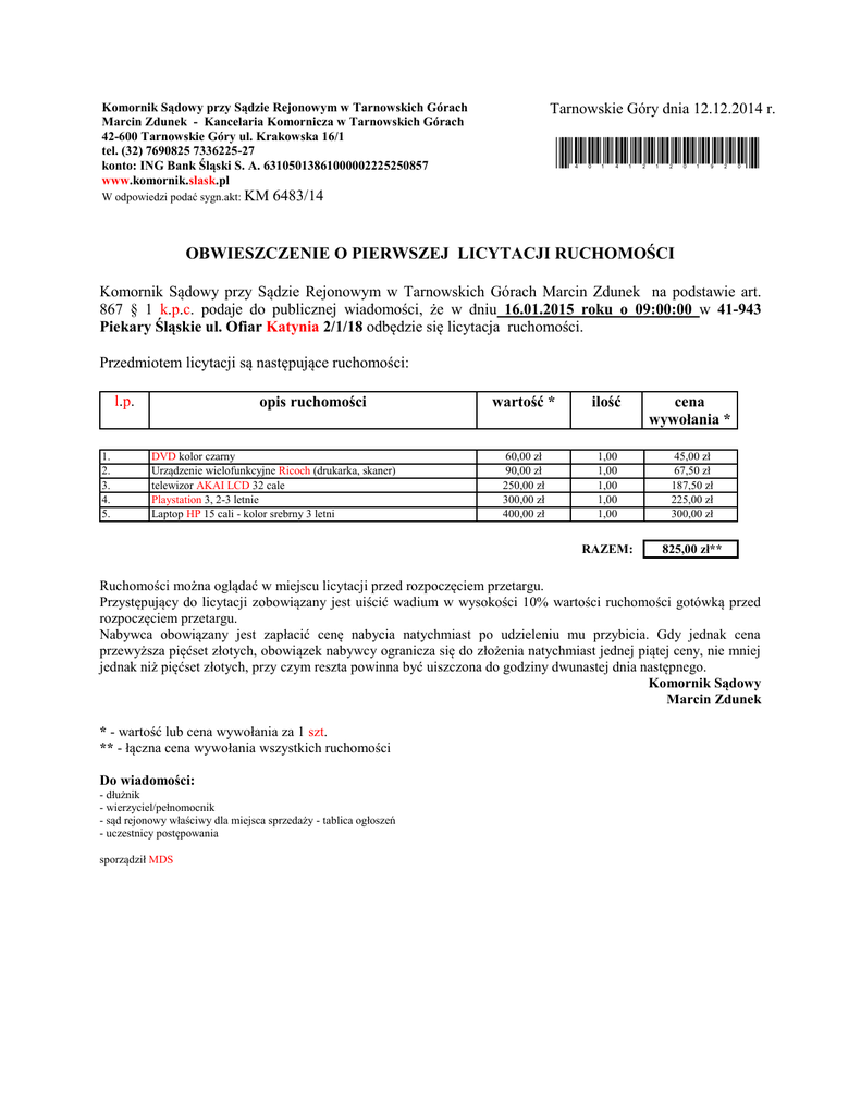 Tarnowskie Góry dnia 12.12.2014 r. Komornik Sądowy przy Sądzie Rejonowym w Tarnowskich Górach Marcin Zdunek - Kancelaria Komornicza w Tarnowskich Górach 42-600 Tarnowskie Góry ul. Krakowska 16/1 tel. (32) 7690825 7336225-27 konto: ING Bank Śląski S. A. 63105013861000002225250857 www.komornik.slask.pl W odpowiedzi podać sygn.akt: KM *4014121201920* 6483/14 OBWIESZCZENIE O PIERWSZEJ LICYTACJI RUCHOMOŚCI Komornik Sądowy przy Sądzie Rejonowym w Tarnowskich Górach Marcin Zdunek na podstawie art. 867 § 1 k.p.c. podaje do publicznej wiadomości, że w dniu 16.01.2015 roku o 09:00:00 w 41-943 Piekary Śląskie ul. Ofiar Katynia 2/1/18 odbędzie się licytacja ruchomości. Przedmiotem licytacji są następujące ruchomości: opis ruchomości l.p. 1. 2. 3. 4. 5. DVD kolor czarny Urządzenie wielofunkcyjne Ricoch (drukarka, skaner) telewizor AKAI LCD 32 cale Playstation 3, 2-3 letnie Laptop HP 15 cali - kolor srebrny 3 letni wartość * ilość cena wywołania * 60,00 zł 90,00 zł 250,00 zł 300,00 zł 400,00 zł 1,00 1,00 1,00 1,00 1,00 45,00 zł 67,50 zł 187,50 zł 225,00 zł 300,00 zł RAZEM: 825,00 zł** Ruchomości można oglądać w miejscu licytacji przed rozpoczęciem przetargu. Przystępujący do licytacji zobowiązany jest uiścić wadium w wysokości 10% wartości ruchomości gotówką przed rozpoczęciem przetargu. Nabywca obowiązany jest zapłacić cenę nabycia natychmiast po udzieleniu mu przybicia. Gdy jednak cena przewyższa pięćset złotych, obowiązek nabywcy ogranicza się do złożenia natychmiast jednej piątej ceny, nie mniej jednak niż pięćset złotych, przy czym reszta powinna być uiszczona do godziny dwunastej dnia następnego. Komornik Sądowy Marcin Zdunek * - wartość lub cena wywołania za 1 szt. ** - łączna cena wywołania wszystkich ruchomości Do wiadomości: - dłużnik - wierzyciel/pełnomocnik - sąd rejonowy właściwy dla miejsca sprzedaży - tablica ogłoszeń - uczestnicy postępowania sporządził MDS