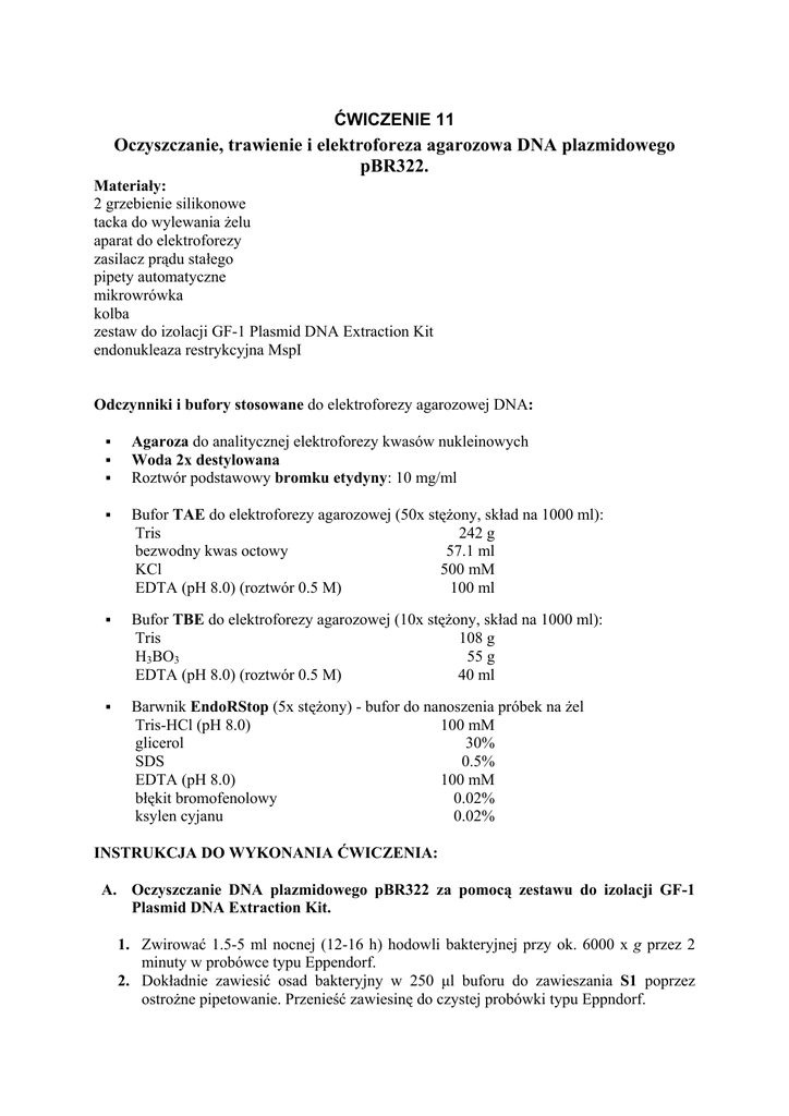 ĆWICZENIE 11 Oczyszczanie, trawienie i elektroforeza agarozowa DNA plazmidowego pBR322. Materiały: 2 grzebienie silikonowe tacka do wylewania żelu aparat do elektroforezy zasilacz prądu stałego pipety automatyczne mikrowrówka kolba zestaw do izolacji GF-1 Plasmid DNA Extraction Kit endonukleaza restrykcyjna MspI Odczynniki i bufory stosowane do elektroforezy agarozowej DNA: Agaroza do analitycznej elektroforezy kwasów nukleinowych Woda 2x destylowana Roztwór podstawowy bromku etydyny: 10 mg/ml Bufor TAE do elektroforezy agarozowej (50x stężony, skład na 1000 ml): Tris 242 g bezwodny kwas octowy 57.1 ml KCl 500 mM EDTA (pH 8.0) (roztwór 0.5 M) 100 ml Bufor TBE do elektroforezy agarozowej (10x stężony, skład na 1000 ml): Tris 108 g 55 g H3BO3 EDTA (pH 8.0) (roztwór 0.5 M) 40 ml Barwnik EndoRStop (5x stężony) - bufor do nanoszenia próbek na żel Tris-HCl (pH 8.0) 100 mM glicerol 30% SDS 0.5% EDTA (pH 8.0) 100 mM błękit bromofenolowy 0.02% ksylen cyjanu 0.02% INSTRUKCJA DO WYKONANIA ĆWICZENIA: A. Oczyszczanie DNA plazmidowego pBR322 za pomocą zestawu do izolacji GF-1 Plasmid DNA Extraction Kit. 1. Zwirować 1.5-5 ml nocnej (12-16 h) hodowli bakteryjnej przy ok. 6000 x g przez 2 minuty w probówce typu Eppendorf. 2. Dokładnie zawiesić osad bakteryjny w 250 µl buforu do zawieszania S1 poprzez ostrożne pipetowanie. Przenieść zawiesinę do czystej probówki typu Eppndorf. 3. Dodać 250 µl buforu lizującego S2. Powoli mieszać zawartość, poprzez ostrożne kilkukrotne (4-6 razy) odwracanie probówki, aż do uzyskania jednolitej zawiesiny. Inkubować w temperaturze pokojowej lub w lodzie nie dłużej niż 5 min. Uwaga 1: Zbyt intensywne mieszanie zawiesiny komórek z buforem lizującym powoduje nieodwracalną denaturację części plazmidowego DNA oraz zanieczyszczenie plazmidu fragmentami chromosomalnego DNA. 4. Dodać 400 µl buforu NB. Dokładnie i powoli mieszać zawartość probówki poprzez kilkukrotne odwracanie (6-10 razy), aż do momentu pojawienia się białego precypitatu. 5. Wirować w mikrowirówce przez 10 min z prędkością ok. 14000 – 16000 x g. 6. Wlać supernatant do minikolumny, znajdującej się w probówce odbierającej. Starać się nie przenieść białego precypitatu. Narysować za pomocą markera kropkę na powierzchni minikolumny, ułatwiającą późniejsze identyczne umiejscowienie minikolumny w mikrowirówce podczas kolejnych etapów wirowania. 7. Wirować przez 1 min z prędkością 10000 x g. 8. Wyjąć minikolumnę, wylać przesącz i powtórnie umieścić minikolumnę w probówce. 9. Dodać 700 µl buforu płuczącego Wash Buffer i wirować przez 1 min z prędkością 10000 x g. 10. Wyjąć minikolumnę, wylać przesącz i powtórnie umieścić minikolumnę w probówce. 11. Wirować przez 1 min z prędkością 10000 x g w celu usunięcia resztek buforu płuczącego. 12. Minikolumnę umieścić w nowej probówce typu Eppendorf 1.5-2 ml. Dodać 50-100 µl buforu elucyjnego Elution Buffer. Uwaga 1: Dodanie buforu eluującego centralnie na powierzchnię membrany zapewnia uzyskanie maksymalnej wydajności odzysku DNA. Należy unikać dotykania ścianek minikolumn mikropipetą, aby nie przenosić śladów DNA pomiędzy kolejnymi minikolumnami. 13. Minikolumnę pozostawić na 1 min w temperaturze pokojowej. 14. Wirować minikolumnę przez 1 min z prędkością 10000 x g. 15. Usunąć minikolumnę, zamknąć probówkę. DNA jest gotowe do dalszych analiz/manipulacji, może być przechowywane w 4oC lub zamrożone w -20oC. B. Przeprowadzenie trawienia plazmidowego DNA pBR322 endonukleazą restrykcyjną MspI. 1. Usunąć minikolumnę, zamknąć probówkę. DNA jest gotowe do dalszych analiz/manipulacji, może być przechowywane w 4oC lub zamrożone w -20oC. 2. Przeprowadzić reakcję trawienia DNA odpowiednim enzymem restrykcyjnym stosując 1-10 jednostek enzymu na 1 µg DNA w 30 µl mieszaniny reakcyjnej, zachowując przy tym stężenie glicerolu na poziomie maksimum 5% w objętości reakcji. 3. Trawienia przeprowadzić w odpowiednim buforze i temperaturze 37oC (w bloku grzejnym) przez 1 godzinę. 4. Po zakończeniu inkubacji przerwać trawienie poprzez dodanie 3 µl buforu EndoRStop i ogrzanie próbki w 55oC przez 5 minut. Przygotowane w ten sposób próbki nanosić na żel agrozowy. C. Przygotowanie żelu agarozowego w aparacie do elektroforezy horyzontalnej (DNAGdańsk). 1. Do szklanej kolby stożkowej albo okrągłodennej (250-500 ml) odważyć ilość agarozy stosowaną do potrzebnego stężenia i objętości tacki do wylewania żelu. Należy odważyć 1g agarozy do przygotowania 100 ml 1 % żelu. 2. Wlać do kolbki wymaganą objętość buforu do elektroforezy (1xTAE). 3. Zamieszać silnie zawartość kolbki i rozpuścić agarozę przez zagotowanie. Najwygodniej jest użyć do tego celu kuchenki mikrofalowej, ale żel można również ogrzewać przy pomocy zwykłego palnika laboratoryjnego lub płaszcza grzejnego. Jeśli agaroza nie jest całkowicie rozpuszczona należy powtórzyć gotowanie. UWAGA! Upłynniony i rozgrzany żel agarozowy silnie kipi – oparzenia mogę być bardzo dotkliwe. 4. Schłodzić żel w temperaturze pokojowej do temperatury około 60oC. 5. Do schłodzonego żelu dodać roztworu bromku etydyny do stężenia 0.1 µg/ml i silnie zamieszać (1µl 10 mg/ml roztworu EtBr na 100 ml żelu agarozowego). UWAGA! Bromek etydyny jest silnym kancerogenem. Unikać kontaktu ze skórą, przy pracy z bromkiem etydyny używać rękawic gumowych. 6. Wylać żel na wcześniej przygotowaną i umieszczoną w lodówce tackę. Niezwłocznie umieścić grzebień w żelu. W żelu nie powinno być żadnych pęcherzyków powietrza. 7. Po zastygnięciu żelu (około 20 minut) ostrożnie wyjąć grzebień, umieścić tackę z żelem w naczyniu do elektroforezy i zalać żel buforem (1xTAE), tak aby żel był 2-3 mm pod powierzchnią buforu. 8. Próbki i wzorce masowe DNA zmieszać z odpowiednią ilością buforu obciążającego z barwniki