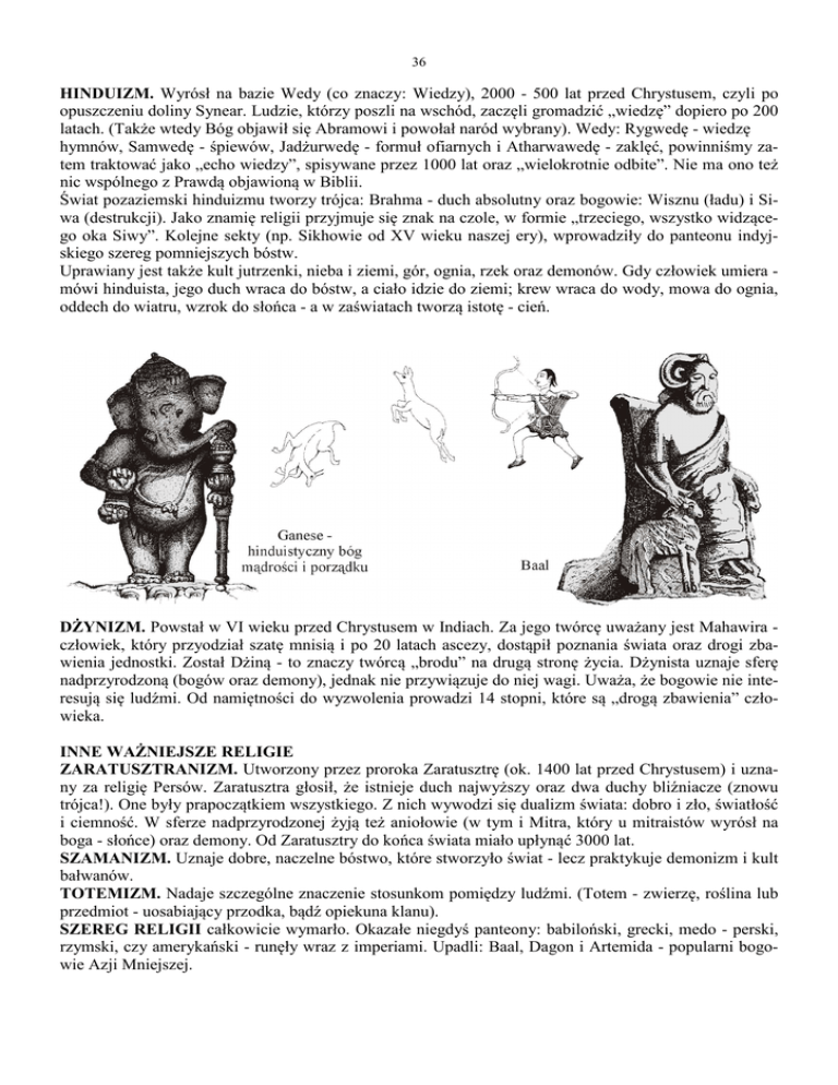 36 HINDUIZM. Wyrósł na bazie Wedy (co znaczy: Wiedzy), 2000 - 500 lat przed Chrystusem, czyli po opuszczeniu doliny Synear. Ludzie, którzy poszli na wschód, zaczęli gromadzić „wiedzę” dopiero po 200 latach. (Także wtedy Bóg objawił się Abramowi i powołał naród wybrany). Wedy: Rygwedę - wiedzę hymnów, Samwedę - śpiewów, Jadżurwedę - formuł ofiarnych i Atharwawedę - zaklęć, powinniśmy zatem traktować jako „echo wiedzy”, spisywane przez 1000 lat oraz „wielokrotnie odbite”. Nie ma ono też nic wspólnego z Prawdą objawioną w Biblii. Świat pozaziemski hinduizmu tworzy trójca: Brahma - duch absolutny oraz bogowie: Wisznu (ładu) i Siwa (destrukcji). Jako znamię religii przyjmuje się znak na czole, w formie „trzeciego, wszystko widzącego oka Siwy”. Kolejne sekty (np. Sikhowie od XV wieku naszej ery), wprowadziły do panteonu indyjskiego szereg pomniejszych bóstw. Uprawiany jest także kult jutrzenki, nieba i ziemi, gór, ognia, rzek oraz demonów. Gdy człowiek umiera mówi hinduista, jego duch wraca do bóstw, a ciało idzie do ziemi; krew wraca do wody, mowa do ognia, oddech do wiatru, wzrok do słońca - a w zaświatach tworzą istotę - cień. DŻYNIZM. Powstał w VI wieku przed Chrystusem w Indiach. Za jego twórcę uważany jest Mahawira człowiek, który przyodział szatę mnisią i po 20 latach ascezy, dostąpił poznania świata oraz drogi zbawienia jednostki. Został Dżiną - to znaczy twórcą „brodu” na drugą stronę życia. Dżynista uznaje sferę nadprzyrodzoną (bogów oraz demony), jednak nie przywiązuje do niej wagi. Uważa, że bogowie nie interesują się ludźmi. Od namiętności do wyzwolenia prowadzi 14 stopni, które są „drogą zbawienia” człowieka. INNE WAŻNIEJSZE RELIGIE ZARATUSZTRANIZM. Utworzony przez proroka Zaratusztrę (ok. 1400 lat przed Chrystusem) i uznany za religię Persów. Zaratusztra głosił, że istnieje duch najwyższy oraz dwa duchy bliźniacze (znowu trójca!). One były prapoczątkiem wszystkiego. Z nich wywodzi się dualizm świata: dobro i zło, światłość i ciemność. W sferze nadprzyrodzonej żyją też aniołowie (w tym i Mitra, który u mitraistów wyrósł na boga - słońce) oraz demony. Od Zaratusztry do końca świata miało upłynąć 3000 lat. SZAMANIZM. Uznaje dobre, naczelne bóstwo, które stworzyło świat - lecz praktykuje demonizm i kult bałwanów. TOTEMIZM. Nadaje szczególne znaczenie stosunkom pomiędzy ludźmi. (Totem - zwierzę, roślina lub przedmiot - uosabiający przodka, bądź opiekuna klanu). SZEREG RELIGII całkowicie wymarło. Okazałe niegdyś panteony: babiloński, grecki, medo - perski, rzymski, czy amerykański - runęły wraz z imperiami. Upadli: Baal, Dagon i Artemida - popularni bogowie Azji Mniejszej.