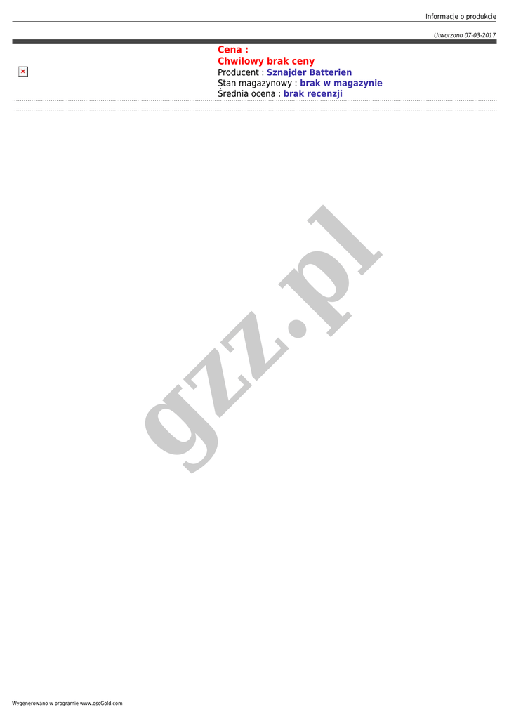 Informacje o produkcie Utworzono 07-03-2017 Cena : Chwilowy brak ceny gz z .p l Producent : Sznajder Batterien Stan magazynowy : brak w magazynie Średnia ocena : brak recenzji Wygenerowano w programie www.oscGold.com