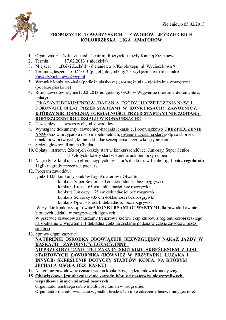 Zieleniewo 05.02.2013 PROPOZYCJE TOWARZYSKICH ZAWODÓW JEŹDZIECKICH KOŁOBRZESKA LIGA AMATORÓW 1. 2. 3. 4. Organizator: „Dziki Zachód” Centrum Rozrywki i Jazdy Konnej Zieleniewo Termin: 17.02.2013 ( niedziela) Miejsce: „Dziki Zachód” -Zieleniewo k/Kołobrzegu; ul. Wycieczkowa 9 Termin zgłoszeń: 15.02.2013 (piątek) do godziny 20, wyłącznie e-mail na adres: [email protected] 5. Warunki: konkursy -hala (podłoże piaskowe) ; rozprężalnia – ujeżdżalnia zewnętrzna (podłoże piaskowe) 6. Biuro zawodów czynne17.02.2013 od godziny 09.30 w Wigwamie (kontrola dokumentów, opłaty) OKAZANIE DOKUMENTÓW, (BADANIA, ZGODY I UBEZPIECZENIA NNW) I DOKONANIE OPŁAT PRZED STARTAMI W KONKURSACH! ZAWODNICY, KTÓRZY NIE DOPEŁNIĄ FORMALNOŚCI PRZED STARTAMI NIE ZOSTANĄ DOPUSZCZENI DO UDZIAŁU W KONKURSACH!! 7. Uczestnicy: wszyscy chętni zawodnicy 8. Wymagane dokumenty: zawodnicy-badania lekarskie, i obowiązkowo UBEZPIECZENIE NNW oraz w przypadku osób niepełnoletnich, pisemna zgoda na start podpisana przez opiekunów prawnych; konie- aktualne szczepienia przeciwko grypie koni 9. Sędzia główny: Roman Chojka 10. Opłaty: startowe 25złotych -każdy start w konkursach:Kuce, Juniorzy, Super Senior ; 30 złotych- każdy start w konkursach Seniorzy i Open 11. Nagrody: w konkursach eliminacyjnych ligi- floo's dla koni; w finale Ligi ( patrz regulamin Ligi)- nagrody rzeczowe, puchary. 12. Program zawodów: godz.10.00 konkursy skoków Ligi Amatorów i Otwarte konkurs Super Senior -50 cm dokładności bez rozgrywki konkurs Kuce – 65 cm dokładności bez rozgrywki konkurs Juniorzy – 75 cm dokładności bez rozgrywki konkurs Seniorzy -85 cm dokładności bez rozgrywki konkurs Open – klasa L dokładności bez rozgrywki Wszystkie konkursy są również KONKURSAMI OTWARTYMI dla zawodników nie biorących udziału w rozgrywkach ligowych W przerwie zawodów zapraszamy trenerów i szefów ekip klubów z regionu kołobrzeskiego na spotkanie w wigwamie. ( dokładna godzina zostanie podana w czasie zawodów przez spikera) 13. Sprawy organizacyjne: NA TERENIE OŚRODKA OBOWIĄZUJE BEZWZGLĘDNY NAKAZ JAZDY W KASKACH ( ZAWODNICY, LUZACY, INNI) NIEPRZESTRZEGANIE TEJ ZASADY SKUTKUJE SKREŚLENIEM Z LIST STARTOWYCH ZAWODNIKA (RÓWNIEŻ W PRZYPADKU LUZAKA I INNYCH- SKREŚLENIE DOTYCZY STARTÓW KONIA, NA KTÓRYM JECHAŁA OSOBA BEZ KASKU) 14. Na terenie zawodów, w czasie trwania konkursów, będzie ratownik medyczny. 15. Obowiązkowe jest ubezpieczenie zawodników od następstw nieszczęśliwych wypadków i innych zdarzeń losowych. Organizator zastrzega sobie możliwość zmian w programie. Organizator nie odpowiada za wypadki, kradzieże i inne zdarzenia losowe mogące mieć miejsce podczas treningu,zawodów oraz w czasie transportu koni, zawodników i osób trzecich. 16. Mozliwy jest wcześniejszy przyjazd z koniem. Ilośc boksów ograniczona. 17. Dodatkowe informacje: Paweł Czechowicz 604911157, Marta Murek 501174835 REGULAMIN KOŁOBRZESKIEJ LIGI AMATORÓW 1. UCZESTNICY W kategorii Kuce mogą brać udział zawodnicy do 16 lat, nieposiadający żadnych uprawnień sportowych ( bez licencji i klas sportowych w skokach przez przeszkody).Dopuszczalna brązowa odznaka Pzj. Wiek zawodnika określa się zgodnie z kalendarzowym rokiem urodzenia ( 1997 i młodsi). W konkursach w kategorii Junior i Senior mogą startować zawodnicy zarejestrowani i niezarejestrowani w ZZJ , nieposiadający uprawnień sportowych ( żadnych licencji i klas sportowych) w skokach przez przeszkody ( mogą posiadać jedynie brązową odznakę PZJ). W kategorii Open mogą startować zawodnicy posiadający uprawnienia sportowe III stopnia i/lub srebrną odznakę PZJ i żadnych wyższych. W kategorii Super Senior mogą brać udział zawodnicy powyżej 30 roku życia, nieposiadający żadnych uprawnień sportowych i odznak PZJ. Zawodnik może startować tylko w jednej kategorii Ligi. 2. POSTANOWIENIA OGÓLNE Kołobrzeska Liga Amtorów rozgrywana jest w 5 kategoriach: Kuce – zawodnicy do 16 lat włącznie i konie,których wysokość w kłębie zmierzona na równej poziomej powierzchni nie przekracza 148 cm bez podków lub 149 cm w podkowach. Dla kucy nie jest wymagany certyfikat wzrostu , wystarczy jedynie oświadczenie właściciela/ użytkownika kuca.W przypadku niejasności decydujące zdanie o dopuszczeniu kuca do startu ma sędzia główny zawodów. Juniorzy- zawodnicy do 18 roku życia włącznie Seniorzy – zawodnicy powyżej 18 roku życia Open – zawodnicy bez podziału wiekowego, decydują posiadane uprawnienia, wymagany minimalny wiek konia – 5lat ( ze względu na konkurs finałowy ) Super Senior – zawodnicy powyżej 30 roku życia 3. ZASADY KLASYFIKACJI Każdy zawodnik może startować na dwóch koniach. Każdy przejazd klasyfikowany jest osobno. Warunkiem udziału w finale jest ukończenie 3 konkursów Eliminacyjnych ligi. Zawody ligowe rozgrywane będą raz w miesiącu od stycznia do kwietnia włącznie. Do konkursu finałowego awansują zawodnicy zajmujący miejsca 1-10 po ukończeniu 3 konkursów eliminacyjnych ( w przypadku startu we wszystkich 4 konkursach eliminacyjnych do ostatecznego wyniku będą liczyły się wyniki 3 najlepszych przejazdów z eliminacji). W przypadku zakwalifikowania się do finału zawodnika na dwóch koniach, zawodnik musi wybrać konia do udziału w konkursie finałowym( w konkursie finałowym zawodnik może startować tylko raz).Zwycięzcą zostaje zawodnik z najmniejszą liczbą punktów karnych ze wszystkich konkursów. W przypadku równej ilości punktów karnych o zwycięstwie decyduje lepszy czas w konkursie finałowym.W sytuacji równych wyników punktowych i czasowych zwycięzca zostanie wyłoniony w dodatkowej rozgrywce. Zawodnicy nie startujący w konkursie finałowym sklasyfikowani będą na podstawie punktów uzyskanych w 3 konkursach eliminacyjnych.( w przypadku równej ilości punktów sklasyfikowani są na tym samym miejscu). 4. WARUNKI ROZGRYWANIA KONKURSÓW: ELIMINA