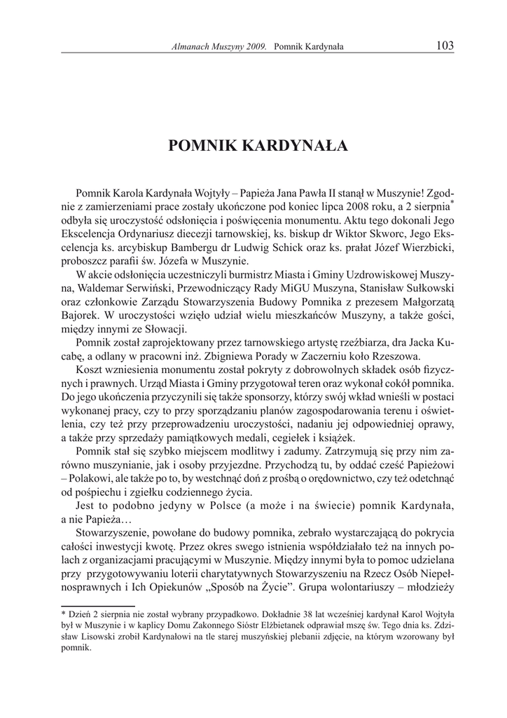 Almanach Muszyny 2009. Pomnik Kardynała 103 POMNIK KARDYNAŁA Pomnik Karola Kardynała Wojtyły – Papieża Jana Pawła II stanął w Muszynie! Zgodnie z zamierzeniami prace zostały ukończone pod koniec lipca 2008 roku, a 2 sierpnia odbyła się uroczystość odsłonięcia i poświęcenia monumentu. Aktu tego dokonali Jego Ekscelencja Ordynariusz diecezji tarnowskiej, ks. biskup dr Wiktor Skworc, Jego Ekscelencja ks. arcybiskup Bambergu dr Ludwig Schick oraz ks. prałat Józef Wierzbicki, proboszcz parafii św. Józefa w Muszynie. W akcie odsłonięcia uczestniczyli burmistrz Miasta i Gminy Uzdrowiskowej Muszyna, Waldemar Serwiński, Przewodniczący Rady MiGU Muszyna, Stanisław Sułkowski oraz członkowie Zarządu Stowarzyszenia Budowy Pomnika z prezesem Małgorzatą Bajorek. W uroczystości wzięło udział wielu mieszkańców Muszyny, a także gości, między innymi ze Słowacji. Pomnik został zaprojektowany przez tarnowskiego artystę rzeźbiarza, dra Jacka Kucabę, a odlany w pracowni inż. Zbigniewa Porady w Zaczerniu koło Rzeszowa. Koszt wzniesienia monumentu został pokryty z dobrowolnych składek osób fizycznych i prawnych. Urząd Miasta i Gminy przygotował teren oraz wykonał cokół pomnika. Do jego ukończenia przyczynili się także sponsorzy, którzy swój wkład wnieśli w postaci wykonanej pracy, czy to przy sporządzaniu planów zagospodarowania terenu i oświetlenia, czy też przy przeprowadzeniu uroczystości, nadaniu jej odpowiedniej oprawy, a także przy sprzedaży pamiątkowych medali, cegiełek i książek. Pomnik stał się szybko miejscem modlitwy i zadumy. Zatrzymują się przy nim zarówno muszynianie, jak i osoby przyjezdne. Przychodzą tu, by oddać cześć Papieżowi – Polakowi, ale także po to, by westchnąć doń z prośbą o orędownictwo, czy też odetchnąć od pośpiechu i zgiełku codziennego życia. Jest to podobno jedyny w Polsce (a może i na świecie) pomnik Kardynała, a nie Papieża… Stowarzyszenie, powołane do budowy pomnika, zebrało wystarczającą do pokrycia całości inwestycji kwotę. Przez okres swego istnienia współdziałało też na innych polach z organizacjami pracującymi w Muszynie. Między innymi była to pomoc udzielana przy przygotowywaniu loterii charytatywnych Stowarzyszeniu na Rzecz Osób Niepełnosprawnych i Ich Opiekunów „Sposób na Życie”. Grupa wolontariuszy – młodzieży Dzień 2 sierpnia nie został wybrany przypadkowo. Dokładnie 38 lat wcześniej kardynał Karol Wojtyła był w Muszynie i w kaplicy Domu Zakonnego Sióstr Elżbietanek odprawiał mszę św. Tego dnia ks. Zdzisław Lisowski zrobił Kardynałowi na tle starej muszyńskiej plebanii zdjęcie, na którym wzorowany był pomnik. 104 Stanisława Bożena Dziedzic z Liceum Ogólnokształcącego w Muszynie – pod patronatem szkoły i Stowarzyszenia – podjęła współpracę z Domem Pomocy Społecznej „Jar” oraz Ośrodkiem „Przystań” w Krynicy. Nawiązano także kontakt z nowosądecką filią Uniwersytetu Trzeciego Wieku, organizując spotkania w Miejsko-Gminnym Ośrodku Kultury. Dalsza część planów, czyli budowa Centrum Godnej Starości im. Ojca Świętego Jana Pawła II, głównie z powodu recesji na rynku gospodarczym i wycofania się sponsorów, została odłożona na dalsze lata. Rok 2009 został ogłoszony „Rokiem Jana Pawła II na Ziemi Sądeckiej”. Muszyna ze swym pomnikiem dołożyła istotną cegiełkę w jego obchody. Stanisława Bożena Dziedzic NA ODSŁONIĘCIE POMNIKA KAROLA KARDYNAŁA WOJTYŁY Gdy stoję u stóp Twojego pomnika Uświadamiam sobie Jakie to szczęście, że mogę podążać Twoimi śladami. Podziwiać krajobrazy, którymi Ty się zachwycałeś, Przemierzać szlaki, które stanowiły Trasę Twoich wędrówek. Myślę o Tobie, gdy o brzasku świtania Obserwuję góry otulone gęstą mgłą. Tak jak Ty czekam, aby słońce wynurzające się zza lasu Ukazało swoją złotą twarz I rozświetliło te urokliwe okolice. Ojcze! Proszę pokornie, oręduj w Niebie za naszą Ojczyzną, Wolną dzięki Twojemu wsparciu. Oręduj za wspaniałymi, gościnnymi ludźmi Zamieszkującymi te tereny. Wspieraj ich trud w staraniach, By piękno pochodzące od Stwórcy Nie uległo zniszczeniu I mogło służyć całemu narodowi. Muszyna, sierpień 2008 r.