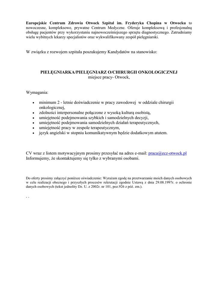 Europejskie Centrum Zdrowia Otwock Szpital im. Fryderyka Chopina w Otwocku to nowoczesne, kompleksowe, prywatne Centrum Medyczne. Oferuje kompleksową i profesjonalną obsługę pacjentów przy wykorzystaniu najnowocześniejszego sprzętu diagnostycznego. Zatrudniamy wielu wybitnych lekarzy specjalistów oraz wykwalifikowany zespół pielęgniarski. W związku z rozwojem szpitala poszukujemy Kandydatów na stanowisko: PIELĘGNIARKA/PIELĘGNIARZ O/CHIRURGII ONKOLOGICZNEJ miejsce pracy- Otwock, Wymagania: minimum 2 - letnie doświadczenie w pracy zawodowej w oddziale chirurgii onkologicznej, zdolności interpersonalne połączone z wysoką kulturą osobistą, umiejętność podejmowania szybkich i samodzielnych decyzji, umiejętność podejmowania samodzielnych działań terapeutycznych, umiejętność pracy w zespole terapeutycznym, język angielski w stopniu komunikatywnym będzie dodatkowym atutem. CV wraz z listem motywacyjnym prosimy przesyłać na adres e-mail: [email protected] Informujemy, że skontaktujemy się tylko z wybranymi osobami. Do oferty prosimy załączyć poniższe oświadczenie: Wyrażam zgodę na przetwarzanie moich danych osobowych w celu realizacji obecnego i przyszłych procesów rekrutacji zgodnie Ustawą z dnia 29.08.1997r. o ochronie danych osobowych (tekst jednolity Dz. U. z 2002r. nr 101, poz.926 z póź. zm.). ..