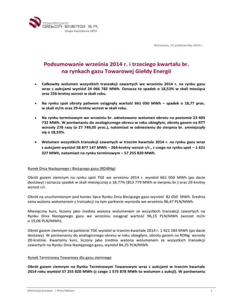 Warszawa, 22 października 2014 r. Podsumowanie września 2014 r. i trzeciego kwartału br. na rynkach gazu Towarowej Giełdy Energii Całkowity wolumen wszystkich transakcji zawartych we wrześniu 2014 r. na rynku gazu wraz z aukcjami wyniósł 24 066 782 MWh. Oznacza to spadek o 18,53% w skali miesiąca oraz 226-krotny wzrost w skali roku. Na rynku spot obroty paliwem osiągnęły wartość 661 050 MWh – spadek o 18,77 proc. w skali m/m oraz 29-krotny wzrost w skali roku. Na rynku terminowym we wrześniu br. odnotowano wolumen obrotu na poziomie 23 405 732 MWh. W porównaniu do analogicznego okresu w roku ubiegłym, obroty gazem na RTT wzrosły 278 razy (o 27 749,05 proc.), natomiast w odniesieniu do sierpnia br. zmniejszyły się o 18,53%. Wolumen wszystkich transakcji zawartych w trzecim kwartale 2014 r. na rynku gazu wraz z aukcjami wyniósł 58 877 147 MWh – 264-krotny wzrost r/r., z czego na rynku spot – 1 621 327 MWh, natomiast na rynku terminowym – 57 255 820 MWh. Rynek Dnia Następnego i Bieżącego gazu (RDiBNg) Obrót gazem ziemnym na rynku spot TGE we wrześniu 2014 r. wyniósł 661 050 MWh (po dacie dostawy) i oznacza spadek w skali miesięcznej o 18,77% (813 779 MWh w sierpniu br.) oraz 29-krotny wzrost r/r. Obrót na uruchomionym pod koniec lipca Rynku Dnia Bieżącego gazu wyniósł 82 050 MWh. Średnia cena ważona wolumenem z transakcji na tym parkiecie wyniosła we wrześniu 96,47 PLN/MWh. Miesięczny kurs, liczony jako średnia ważona wolumenem ze wszystkich transakcji zawartych na Rynku Dnia Następnego gazu we wrześniu osiągnął wartość 96,15 PLN/MWh (wzrost m/m o 19,06 PLN/MWh). Obrót gazem ziemnym na parkiecie TGE wyniósł w trzecim kwartale 2014 r. 1 421 184 MWh (po dacie dostawy). W porównaniu do analogicznego okresu w roku ubiegłym, obroty gazem na RDNg wzrosły 20-krotnie. Kwartalny kurs, liczony jako średnia ważona wolumenem ze wszystkich transakcji zawartych na Rynku Dnia Następnego gazu, wyniósł 84,25 PLN/MWh. Rynek Terminowy Towarowy dla gazu ziemnego Obrót gazem ziemnym na Rynku Terminowym Towarowym wraz z aukcjami w trzecim kwartale 2014 roku wyniósł 57 255 820 MWh (z czego 1 575 878 MWh to wolumen z aukcji). W porównaniu Informacja prasowa Ι Press Release 1 do analogicznego okresu w roku ubiegłym, obroty gazem na RTT dla gazu ziemnego wzrosły 374krotnie. W samym wrześniu br. obrót gazem ziemnym na Rynku Terminowym Towarowym wraz z aukcjami wyniósł 23 405 732 MWh (z czego 1 323 700 MWh to wolumen z aukcji). W porównaniu do analogicznego okresu w roku ubiegłym, obroty gazem na RTT wzrosły 278-krotnie. W skali miesięcznej zmniejszyły się jednak o 18,53% (w sierpniu br. 28 727 727 MWh). Największy wolumen transakcji na rynku terminowym ustanowiono na kontrakcie z dostawą w roku 2016 (GAS_BASE_Y-16) – 7 747 488 MWh (1 185 840 MWh w sierpniu br.). Średnia ważona wolumenem cena transakcyjna ze wszystkich transakcji dla tego kontraktu we wrześniu wyniosła 115,31 PLN/MWh (wzrost m/m o 2,21 PLN/MWh). Dla kontraktu GAS_BASE_S-W14, dla którego w sierpniu ustanowiono rekordowy miesięczny wolumen obrotu, wolumen wyniósł 1 962 288 MWh (przy 14 261 520 MWh w sierpniu) przy średniej cenie 112,05 (wzrost m/m o 3,21 PLN/MWh). We wrześniu odbyły się 4 aukcje kupna/sprzedaży gazu na Rynku Terminowym Towarowym gazu, których przedmiotem był gaz ziemny w dostawie w listopadzie br. (wolumen transakcji 140 400 MWh), w czwartym kwartale br. (220 900 MWh), w sezonie zimowym rozpoczynającym się z początkiem października br. (436 800 MWh) oraz w roku 2015 (525 600 MWh). Rynki gazu na TGE 2013/2014 r.: Wolumeny (MWh) i cena (PLN/MWh) *** Towarowa Giełda Energii S.A. (TGE) powstała pod koniec 1999 roku. Jest jedyną licencjonowaną giełdą energii w Polsce. Działalność operacyjną rozpoczęła 30 czerwca 2000 roku. Uruchomienie TGE było jednym z pierwszych działań w kierunku liberalizacji polskiego rynku energii elektrycznej i prywatyzacji sektora elektroenergetycznego. Od lutego 2012 r. TGE jest wyłączną własnością Giełdy Papierów Wartościowych w Warszawie. Informacja prasowa Ι Press Release 2 TGE prowadzi rynki: energii elektrycznej (Rynek Terminowy Towarowy - RTT, Rynek Dnia Następnego - RDN, Rynek Dnia Bieżącego - RDB) oraz gazu (RTT, RDNg), a także Rynek Praw Majątkowych. Jest obecnie najbardziej dynamicznie rozwijającą się giełdą towarową w regionie. Potwierdza to przynależność do organizacji EUROPEX, promującej idee konsolidacji rynków energetycznych poprzez połączenia transgraniczne i zrzeszającej wszystkie towarowe i finansowe giełdy energii w Europie. Od grudnia 2010 TGE i Nord Pool Spot prowadzą połączone rynki dnia następnego na zasadach market coupling na połączeniu Swe-Pol Link łączącym Szwecję i Polskę. Obrót na wszystkich parkietach dedykowanych energii elektrycznej w roku 2013 wyniósł 176,55 TWh, był wyższy o 33,76 proc. niż w roku 2012 - 132 TWh. Na rynku gazu całkowity wolumen obrotu osiągnął wartość 2 393 418 MWh - to jest szacunkowo 214 656 323 m3 gazu. www.tge.pl Kontakt dla mediów: Towarowa Giełda Energii S.A.; [email protected], +48 885 885 645, +48 607 030 573 Informacja prasowa Ι Press Release 3