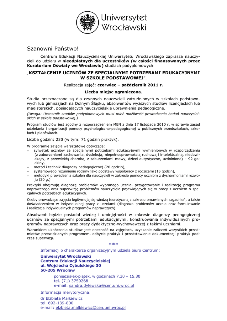 Szanowni Państwo! Centrum Edukacji Nauczycielskiej Uniwersytetu Wrocławskiego zaprasza nauczycieli do udziału w nieodpłatnych dla uczestników (w całości finansowanych przez Kuratorium Oświaty we Wrocławiu) studiach podyplomowych „KSZTAŁCENIE UCZNIÓW ZE SPECJALNYMI POTRZEBAMI EDUKACYJNYMI W SZKOLE PODSTAWOWEJ”. Realizacja zajęć: czerwiec – październik 2011 r. Liczba miejsc ograniczona. Studia przeznaczone są dla czynnych nauczycieli zatrudnionych w szkołach podstawowych lub gimnazjach na Dolnym Śląsku, absolwentów wyŜszych studiów licencjackich lub magisterskich, posiadających nauczycielskie uprawnienia pedagogiczne. (Uwaga: Uczestnik studiów podyplomowych musi mieć moŜliwość prowadzenia badań nauczycielskich w szkole podstawowej.) Program studiów jest zgodny z rozporządzeniem MEN z dnia 17 listopada 2010 r. w sprawie zasad udzielania i organizacji pomocy psychologiczno-pedagogicznej w publicznych przedszkolach, szkołach i placówkach. Liczba godzin: 230 (w tym: 71 godzin praktyk). W programie zajęcia warsztatowe dotyczące: − sylwetek uczniów ze specjalnymi potrzebami edukacyjnymi wymienionych w rozporządzeniu (z zaburzeniami zachowania, dysleksją, niepełnosprawnością ruchową i intelektualną, niedowidzący, z przewlekłą chorobą, z zaburzeniami mowy, dzieci autystyczne, uzdolnione) – 92 godziny, − metod i technik diagnozy pedagogicznej (20 godzin), − systemowego rozumienie rodziny jako podstawy współpracy z rodzicami (15 godzin), − metodyki prowadzenia szkoleń dla nauczycieli w zakresie pomocy uczniom z dysharmoniami rozwoju (20 g.) Praktyki obejmują diagnozę problemów wybranego ucznia, przygotowanie i realizację programu naprawczego oraz superwizję problemów nauczyciela pojawiających się w pracy z uczniem o specjalnych potrzebach edukacyjnych. Osoby prowadzące zajęcia legitymują się wiedzą teoretyczną z zakresu omawianych zagadnień, a takŜe doświadczeniem w indywidualnej pracy z uczniami (diagnoza problemów ucznia oraz formułowanie i realizacja indywidualnych programów naprawczych). Absolwent będzie posiadał wiedzę i umiejętności w zakresie diagnozy pedagogicznej uczniów ze specjalnymi potrzebami edukacyjnymi, konstruowania indywidualnych programów naprawczych oraz pracy dydaktyczno-wychowawczej z takimi uczniami. Warunkiem ukończenia studiów jest obecność na zajęciach, uzyskanie zaliczeń wszystkich przedmiotów przewidzianych programem, odbycie praktyk i przedstawienie dokumentacji praktyk podczas superwizji. *** Informacji o charakterze organizacyjnym udziela biuro Centrum: Uniwersytet Wrocławski Centrum Edukacji Nauczycielskiej ul. Wojciecha Cybulskiego 30 50-205 Wrocław poniedziałek-piątek, w godzinach 7.30 – 15.30 tel. (71) 3759268 e-mail: [email protected] Informacja merytoryczna: dr ElŜbieta Małkiewicz tel. 692-139-800 e-mail: [email protected] * Wymagane dokumenty: • podanie o przyjęcie na studia podyplomowe, • kwestionariusz osobowy (wypełniając formularz koniecznie trzeba zaznaczyć aktualne miejsca zatrudnienia i określić stanowisko pracy), • odpis dyplomu ukończenia studiów wyŜszych, • 2 fotografie o wymiarach 35mm x 45mm, • kserokopia dowodu osobistego, • zaświadczenie o posiadaniu przygotowania pedagogicznego. * Formularz Podania o przyjęcie na studia podyplomowe i Kwestionariusz osobowy do pobrania na stronie domowej Centrum Edukacji Nauczycielskiej: http://www.cen.uni.wroc.pl (zakładka: Kursy i studia podyplomowe) * Wymaganych dokumentów naleŜy składać w biurze Centrum lub listownie. Centrum Edukacji Nauczycielskiej 50-205 Wrocław, ul. Cybulskiego 30