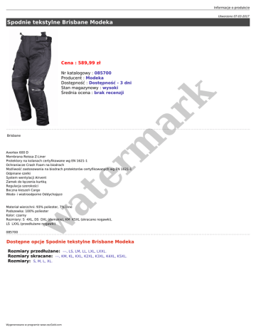 Informacje o produkcie Utworzono 07-03-2017 Spodnie tekstylne Brisbane Modeka Cena : 589,99 zł er m ar k Nr katalogowy : 085700 Producent : Modeka Dostępność : Dostępność - 3 dni Stan magazynowy : wysoki Średnia ocena : brak recenzji Brisbane at Avertex 600 D Membrana Reissa Z-Liner Protektory na kolanach certyfikowane wg EN 1621-1 Ochraniacze Crash Foam na biodrach Możliwość zastosowania na biodrach protektorów certyfikowanych wg EN 1621-1 Odpinane szelki System wentylacji Airvent Zamek do łączenia kurtką Regulacja szerokości Boczna kieszeń Cargo Wodo- i wiatroodporne Oddychające 085700 w Materiał wierzchni: 93% poliester, 7% inne Podszewka: 100% poliester Kolor: czarny Rozmiary: S 4XL, DS DXL (damskie), KM K5XL (skracane nogawki), LS LXXL (przedłużane nogawki) Dostępne opcje Spodnie tekstylne Brisbane Modeka Rozmiary przedłużane: ---, LS, LM, LL, LXL, LXXL. Rozmiary skracane: ---, KM, KL, KXL, K2XL, K3XL, K4XL, K5XL. Rozmiary: S, M, L, XL. Wygenerowano w programie www.oscGold.com