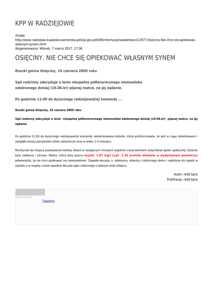 KPP W RADZIEJOWIE Źródło: http://www.radziejow.kujawsko-pomorska.policja.gov.pl/k39/informacje/wiadomosci/12577,Osieciny-Nie-chce-sie-opiekowacwlasnym-synem.html Wygenerowano: Wtorek, 7 marca 2017, 17:36 OSIĘCINY. NIE CHCE SIĘ OPIEKOWAĆ WŁASNYM SYNEM Ruszki gmina Osięciny, 10 czerwca 2009 roku Sąd rodzinny zdecyduje o losie niespełna półtorarocznego niemowlaka odebranego dzisiaj (10.06.br) pijanej matce, na jej żądanie. Po godzinie 11:00 do dyżurnego radziejowskiej komendy ... Ruszki gmina Osięciny, 10 czerwca 2009 roku Sąd rodzinny zdecyduje o losie niespełna półtorarocznego niemowlaka odebranego dzisiaj (10.06.br) pijanej matce, na jej żądanie. Po godzinie 11:00 do dyżurnego radziejowskiej komendy zatelefonowała kobieta, która poinformowała, że jest w ciągu alkoholowym i zażądała wizyty policjantów celem zabrania jej syna w wieku 1.4 miesiąca. Mundurowi do miejsca przebywania kobiety dotarli w następnych minutach wspólnie z pracownikiem osięcińskiej opieki społecznej. Dziecko było zadbane i zdrowe. Matka, która była pijana (wynik: 1.07 mg/l czyli 2.25 promila alkoholu w wydychanym powietrzu) potwierdziła, że nie chce opiekować się niemowlakiem. Zapadła decyzja: o odebraniu dziecka z rodzinnego domu i najbliższe dni spędzi w szpitalu a w między czasie zapadnie decyzja sądu rodzinnego o dalszym losie chłopca. Autor: red2.kpra Publikacja: red2.kpra Ocena: 0/5 (0) Tweetnij