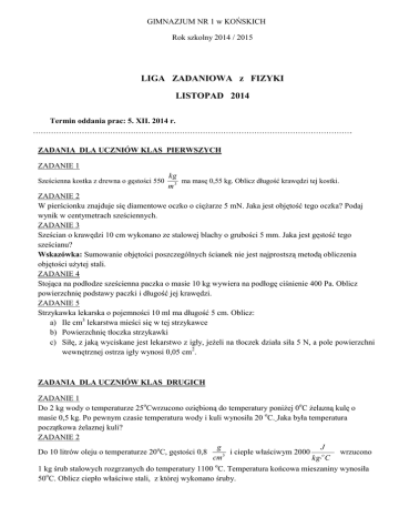 GIMNAZJUM NR 1 w KOŃSKICH Rok szkolny 2014 / 2015 LIGA ZADANIOWA z FIZYKI LISTOPAD 2014 Termin oddania prac: 5. XII. 2014 r. ZADANIA DLA UCZNIÓW KLAS PIERWSZYCH ZADANIE 1 Sześcienna kostka z drewna o gęstości 550 kg ma masę 0,55 kg. Oblicz długość krawędzi tej kostki. m3 ZADANIE 2 W pierścionku znajduje się diamentowe oczko o ciężarze 5 mN. Jaka jest objętość tego oczka? Podaj wynik w centymetrach sześciennych. ZADANIE 3 Sześcian o krawędzi 10 cm wykonano ze stalowej blachy o grubości 5 mm. Jaka jest gęstość tego sześcianu? Wskazówka: Sumowanie objętości poszczególnych ścianek nie jest najprostszą metodą obliczenia objętości użytej stali. ZADANIE 4 Stojąca na podłodze sześcienna paczka o masie 10 kg wywiera na podłogę ciśnienie 400 Pa. Oblicz powierzchnię podstawy paczki i długość jej krawędzi. ZADANIE 5 Strzykawka lekarska o pojemności 10 ml ma długość 5 cm. Oblicz: a) Ile cm3 lekarstwa mieści się w tej strzykawce b) Powierzchnię tłoczka strzykawki c) Siłę, z jaką wyciskane jest lekarstwo z igły, jeżeli na tłoczek działa siła 5 N, a pole powierzchni wewnętrznej ostrza igły wynosi 0,05 cm2. ZADANIA DLA UCZNIÓW KLAS DRUGICH ZADANIE 1 Do 2 kg wody o temperaturze 25oCwrzucono oziębioną do temperatury poniżej 0oC żelazną kulę o masie 0,5 kg. Po pewnym czasie temperatura wody i kuli wynosiła 20 oC. Jaka była temperatura początkowa żelaznej kuli? ZADANIE 2 g J Do 10 litrów oleju o temperaturze 20oC, gęstości 0,8 i cieple właściwym 2000 o wrzucono 3 cm kg C 1 kg śrub stalowych rozgrzanych do temperatury 1100 oC. Temperatura końcowa mieszaniny wynosiła 50oC. Oblicz ciepło właściwe stali, z której wykonano śruby. ZADANIE 3 Oblicz masę pary wodnej o temperaturze początkowej 100 oC, która zamieniając się w ciecz o temperaturze 20 oC oddaje 800 kJ ciepła. ZADANIE 4 Ile kostek lodu o masie 10 g każda i temperaturze -7 oC trzeba wrzucić do 0,5 litra soku o temperaturze 25 oC, aby schłodzić go do 10 oC? Przyjmij, że ciepło właściwe soku jest równe ciepłu właściwemu wody, a gęstość soku jest równa gęstości wody. ZADANIE 5 m Pocisk ołowiany o masie 0,1 kg, poruszający się z szybkością 200 , przebija deskę i porusza się dalej s m z szybkością 100 . Oblicz zmianę energii wewnętrznej pocisku, jeśli wiadomo, że pochłonął połowę s ubytku energii kinetycznej. O ile stopni ogrzał się ten pocisk? ZADANIA DLA UCZNIÓW KLAS TRZECICH ZADANIE 1 m . Oblicz wartość siły wyrzucającej s pocisk , jeżeli lufa ma długość 95cm. Przyjmij, że ruch pocisku w lufie jest jednostajnie przyspieszony. ZADANIE 2 m Monika wskoczyła na nieruchomą łódkę z szybkością 3 . Łódka razem z Moniką zaczęła płynąć z s m szybkością 2 . Łódka ma masę 25 kg. Jaka jest masa Moniki? s ZADANIE 3 kg Oblicz gęstość cieczy wiedząc, że zanurzony w niej drewniany klocek o gęstości 700 3 wystaje m ponad powierzchnię cieczy ¼ swej całkowitej objętości. Pocisk o masie 3 g, wylatując z lufy karabinu, ma szybkość 800 ZADANIE 4 Pchnięty po poziomym torze wagon kolejowy o masie 1000 kg zatrzymał się po przebyciu 50 m w czasie 10 s. Oblicz opory ruchu. ZADANIE 5 W ołowianą kulę o masie 4,95 kg zawieszoną na nieważkiej nitce uderza pionowo od dołu pocisk o m masie 50 g z szybkością 500 . Oblicz, o ile zmieni się wysokość podrzuconej kuli, w której zatrzymał s się pocisk. Zadania wybrała ze zbiorów zadań dla gimnazjów: Małgorzata Piecuch