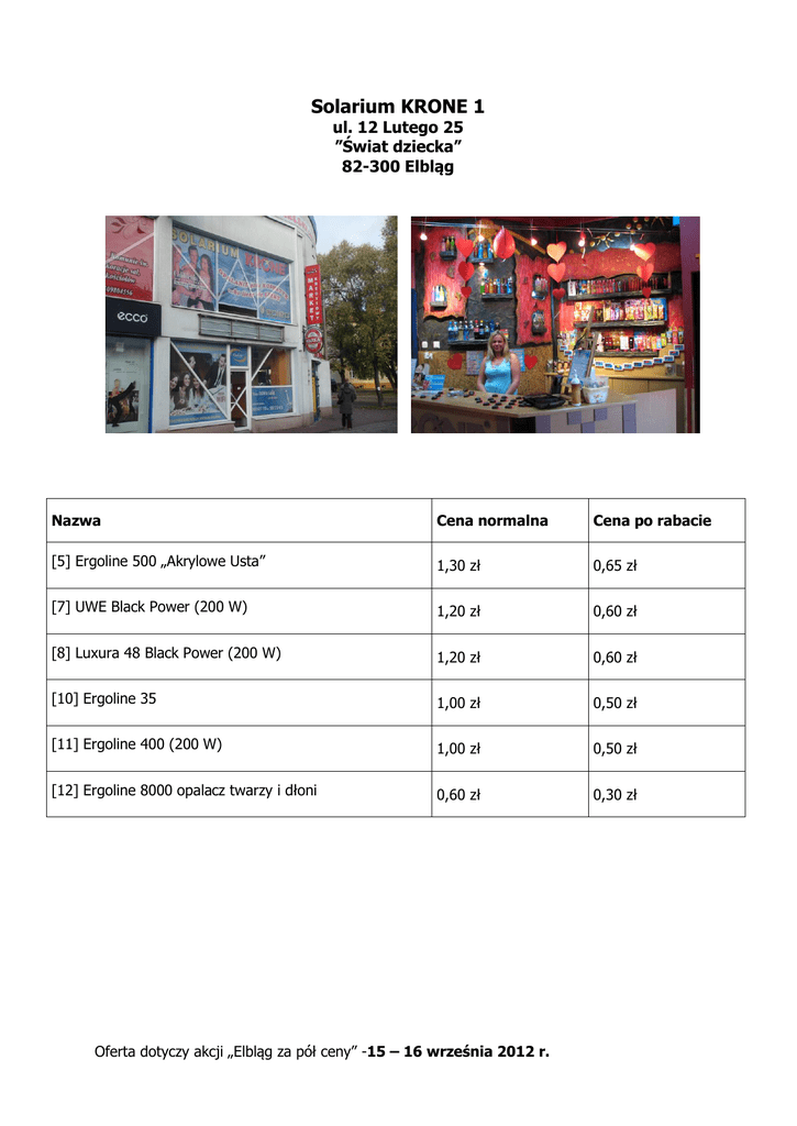 Solarium KRONE 1 ul. 12 Lutego 25 ”Świat dziecka” 82-300 Elbląg Nazwa Cena normalna Cena po rabacie [5] Ergoline 500 „Akrylowe Usta” 1,30 zł 0,65 zł [7] UWE Black Power (200 W) 1,20 zł 0,60 zł [8] Luxura 48 Black Power (200 W) 1,20 zł 0,60 zł [10] Ergoline 35 1,00 zł 0,50 zł [11] Ergoline 400 (200 W) 1,00 zł 0,50 zł [12] Ergoline 8000 opalacz twarzy i dłoni 0,60 zł 0,30 zł Oferta dotyczy akcji „Elbląg za pół ceny” -15 – 16 września 2012 r.