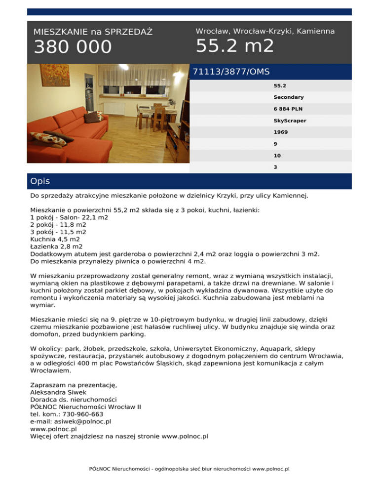 MIESZKANIE na SPRZEDAŻ 380 000 Wrocław, Wrocław-Krzyki, Kamienna 55.2 m2 71113/3877/OMS 55.2 Secondary 6 884 PLN SkyScraper 1969 9 10 3 Opis Do sprzedaży atrakcyjne mieszkanie położone w dzielnicy Krzyki, przy ulicy Kamiennej. Mieszkanie o powierzchni 55,2 m2 składa się z 3 pokoi, kuchni, łazienki: 1 pokój - Salon- 22,1 m2 2 pokój - 11,8 m2 3 pokój - 11,5 m2 Kuchnia 4,5 m2 Łazienka 2,8 m2 Dodatkowym atutem jest garderoba o powierzchni 2,4 m2 oraz loggia o powierzchni 3 m2. Do mieszkania przynależy piwnica o powierzchni 4 m2. W mieszkaniu przeprowadzony został generalny remont, wraz z wymianą wszystkich instalacji, wymianą okien na plastikowe z dębowymi parapetami, a także drzwi na drewniane. W salonie i kuchni położony został parkiet dębowy, w pokojach wykładzina dywanowa. Wszystkie użyte do remontu i wykończenia materiały są wysokiej jakości. Kuchnia zabudowana jest meblami na wymiar. Mieszkanie mieści się na 9. piętrze w 10-piętrowym budynku, w drugiej linii zabudowy, dzięki czemu mieszkanie pozbawione jest hałasów ruchliwej ulicy. W budynku znajduje się winda oraz domofon, przed budynkiem parking. W okolicy: park, żłobek, przedszkole, szkoła, Uniwersytet Ekonomiczny, Aquapark, sklepy spożywcze, restauracja, przystanek autobusowy z dogodnym połączeniem do centrum Wrocławia, a w odległości 400 m plac Powstańców Śląskich, skąd zapewniona jest komunikacja z całym Wrocławiem. Zapraszam na prezentację, Aleksandra Siwek Doradca ds. nieruchomości PÓŁNOC Nieruchomości Wrocław II tel. kom.: 730-960-663 e-mail: [email protected] www.polnoc.pl Więcej ofert znajdziesz na naszej stronie www.polnoc.pl PÓŁNOC Nieruchomości - ogólnopolska sieć biur nieruchomości www.polnoc.pl * UWAGA! Zamieszczone na naszych stronach oferty nie stanowią oferty w rozumieniu Kodeksu Cywilnego, a dane w nich zawarte mają jedynie charakter informacyjny. Aleksandra Siwek tel. 730-960-663 email: [email protected] PÓŁNOC Nieruchomości - ogólnopolska sieć biur nieruchomości www.polnoc.pl Powered by TCPDF (www.tcpdf.org)
