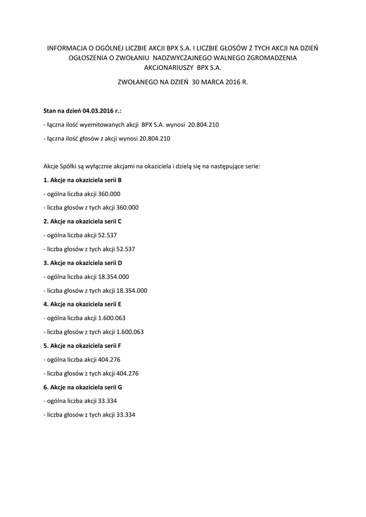 INFORMACJA O OGÓLNEJ LICZBIE AKCJI BPX S.A. I LICZBIE GŁOSÓW Z TYCH AKCJI NA DZIEŃ OGŁOSZENIA O ZWOŁANIU NADZWYCZAJNEGO WALNEGO ZGROMADZENIA AKCJONARIUSZY BPX S.A. ZWOŁANEGO NA DZIEŃ 30 MARCA 2016 R. Stan na dzień 04.03.2016 r.: - łączna ilość wyemitowanych akcji BPX S.A. wynosi 20.804.210 - łączna ilość głosów z akcji wynosi 20.804.210 Akcje Spółki są wyłącznie akcjami na okaziciela i dzielą się na następujące serie: 1. Akcje na okaziciela serii B - ogólna liczba akcji 360.000 - liczba głosów z tych akcji 360.000 2. Akcje na okaziciela serii C - ogólna liczba akcji 52.537 - liczba głosów z tych akcji 52.537 3. Akcje na okaziciela serii D - ogólna liczba akcji 18.354.000 - liczba głosów z tych akcji 18.354.000 4. Akcje na okaziciela serii E - ogólna liczba akcji 1.600.063 - liczba głosów z tych akcji 1.600.063 5. Akcje na okaziciela serii F - ogólna liczba akcji 404.276 - liczba głosów z tych akcji 404.276 6. Akcje na okaziciela serii G - ogólna liczba akcji 33.334 - liczba głosów z tych akcji 33.334