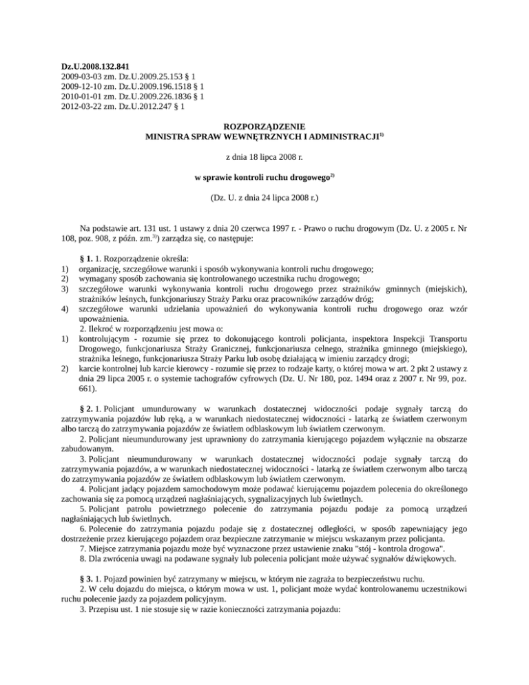Dz.U.2008.132.841 2009-03-03 zm. Dz.U.2009.25.153 § 1 2009-12-10 zm. Dz.U.2009.196.1518 § 1 2010-01-01 zm. Dz.U.2009.226.1836 § 1 2012-03-22 zm. Dz.U.2012.247 § 1 ROZPORZĄDZENIE MINISTRA SPRAW WEWNĘTRZNYCH I ADMINISTRACJI1) z dnia 18 lipca 2008 r. w sprawie kontroli ruchu drogowego2) (Dz. U. z dnia 24 lipca 2008 r.) Na podstawie art. 131 ust. 1 ustawy z dnia 20 czerwca 1997 r. - Prawo o ruchu drogowym (Dz. U. z 2005 r. Nr 108, poz. 908, z późn. zm.3)) zarządza się, co następuje: 1) 2) 3) 4) 1) 2) § 1. 1. Rozporządzenie określa: organizację, szczegółowe warunki i sposób wykonywania kontroli ruchu drogowego; wymagany sposób zachowania się kontrolowanego uczestnika ruchu drogowego; szczegółowe warunki wykonywania kontroli ruchu drogowego przez strażników gminnych (miejskich), strażników leśnych, funkcjonariuszy Straży Parku oraz pracowników zarządów dróg; szczegółowe warunki udzielania upoważnień do wykonywania kontroli ruchu drogowego oraz wzór upoważnienia. 2. Ilekroć w rozporządzeniu jest mowa o: kontrolującym - rozumie się przez to dokonującego kontroli policjanta, inspektora Inspekcji Transportu Drogowego, funkcjonariusza Straży Granicznej, funkcjonariusza celnego, strażnika gminnego (miejskiego), strażnika leśnego, funkcjonariusza Straży Parku lub osobę działającą w imieniu zarządcy drogi; karcie kontrolnej lub karcie kierowcy - rozumie się przez to rodzaje karty, o której mowa w art. 2 pkt 2 ustawy z dnia 29 lipca 2005 r. o systemie tachografów cyfrowych (Dz. U. Nr 180, poz. 1494 oraz z 2007 r. Nr 99, poz. 661). § 2. 1. Policjant umundurowany w warunkach dostatecznej widoczności podaje sygnały tarczą do zatrzymywania pojazdów lub ręką, a w warunkach niedostatecznej widoczności - latarką ze światłem czerwonym albo tarczą do zatrzymywania pojazdów ze światłem odblaskowym lub światłem czerwonym. 2. Policjant nieumundurowany jest uprawniony do zatrzymania kierującego pojazdem wyłącznie na obszarze zabudowanym. 3. Policjant nieumundurowany w warunkach dostatecznej widoczności podaje sygnały tarczą do zatrzymywania pojazdów, a w warunkach niedostatecznej widoczności - latarką ze światłem czerwonym albo tarczą do zatrzymywania pojazdów ze światłem odblaskowym lub światłem czerwonym. 4. Policjant jadący pojazdem samochodowym może podawać kierującemu pojazdem polecenia do określonego zachowania się za pomocą urządzeń nagłaśniających, sygnalizacyjnych lub świetlnych. 5. Policjant patrolu powietrznego polecenie do zatrzymania pojazdu podaje za pomocą urządzeń nagłaśniających lub świetlnych. 6. Polecenie do zatrzymania pojazdu podaje się z dostatecznej odległości, w sposób zapewniający jego dostrzeżenie przez kierującego pojazdem oraz bezpieczne zatrzymanie w miejscu wskazanym przez policjanta. 7. Miejsce zatrzymania pojazdu może być wyznaczone przez ustawienie znaku "stój - kontrola drogowa". 8. Dla zwrócenia uwagi na podawane sygnały lub polecenia policjant może używać sygnałów dźwiękowych. § 3. 1. Pojazd powinien być zatrzymany w miejscu, w którym nie zagraża to bezpieczeństwu ruchu. 2. W celu dojazdu do miejsca, o którym mowa w ust. 1, policjant może wydać kontrolowanemu uczestnikowi ruchu polecenie jazdy za pojazdem policyjnym. 3. Przepisu ust. 1 nie stosuje się w razie konieczności zatrzymania pojazdu: 1) 2) w wyniku prowadzonych działań pościgowych; co do którego zachodzi uzasadnione podejrzenie, iż może on zagrażać bezpieczeństwu ruchu drogowego ze względu na swój stan techniczny lub zachowanie się kierującego. 4. Pojazd policyjny powinien być, w miarę możliwości, ustawiony za zatrzymanym pojazdem, jeżeli zatrzymanie nastąpiło na drodze. 5. W przypadku zatrzymania pojazdu na jezdni lub poboczu, w miejscu gdzie jest to zabronione, kierujący pojazdem policyjnym przed przystąpieniem do kontroli włącza niebieskie światło błyskowe. § 4. 1. Policjant, po zatrzymaniu pojazdu, podaje kierującemu stopień, imię i nazwisko oraz przyczynę zatrzymania, a ponadto: 1) policjant umundurowany okazuje legitymację służbową na żądanie kontrolowanego uczestnika ruchu; 2) policjant nieumundurowany okazuje legitymację służbową bez wezwania. 2. Legitymację służbową okazuje się w sposób umożliwiający kontrolowanemu uczestnikowi ruchu odczytanie i zanotowanie danych pozwalających na identyfikację policjanta, w szczególności dotyczących jego stopnia, imienia i nazwiska oraz nazwy organu, który wydał ten dokument. 3. Przystępując do czynności kontrolnych, policjant może wydać polecenie unieruchomienia silnika pojazdu. 4. Przepisu ust. 1 nie stosuje się w razie zatrzymania pojazdu: 1) w wyniku prowadzonych działań pościgowych; 2) co do którego istnieje uzasadnione podejrzenie, że pochodzi z przestępstwa; 3) jeżeli zachodzi uzasadnione podejrzenie, że znajdują się w nim osoby, które popełniły przestępstwo. 5. W przypadkach uzasadnionych względami bezpieczeństwa lub uwarunkowanych charakterem kontroli policjant może wydać kierującemu pojazdem lub pasażerowi pojazdu polecenie opuszczenia pojazdu. 6. Do pojazdu policyjnego uczestnik ruchu może być wpuszczony tylko w razie konieczności: 1) udzielenia pomocy choremu lub rannemu; 2) doprowadzenia do jednostki Policji, izby wytrzeźwień lub placówki służby zdrowia; 3) poddania badaniu w celu ustalenia zawartości w organizmie alkoholu lub środka działającego podobnie do alkoholu, jeżeli wykonanie tej czynności w innych warunkach byłoby niemożliwe lub mogłoby zakłócić porządek; 4) okazania przebiegu zarejestrowanego wykroczenia; 5) przeprowadzenia czynności procesowych. § 5. 1. Policjant, zatrzymując dokument stwierdzający uprawnienie do kierowania pojazdem lub jego używania, wydaje pokwitowanie. Wzór pokwitowania stanowi załącznik nr 1 do rozporządzenia. 2. W razie uzasadnionego przypuszczenia, że pojazd zagraża bezpieczeństw