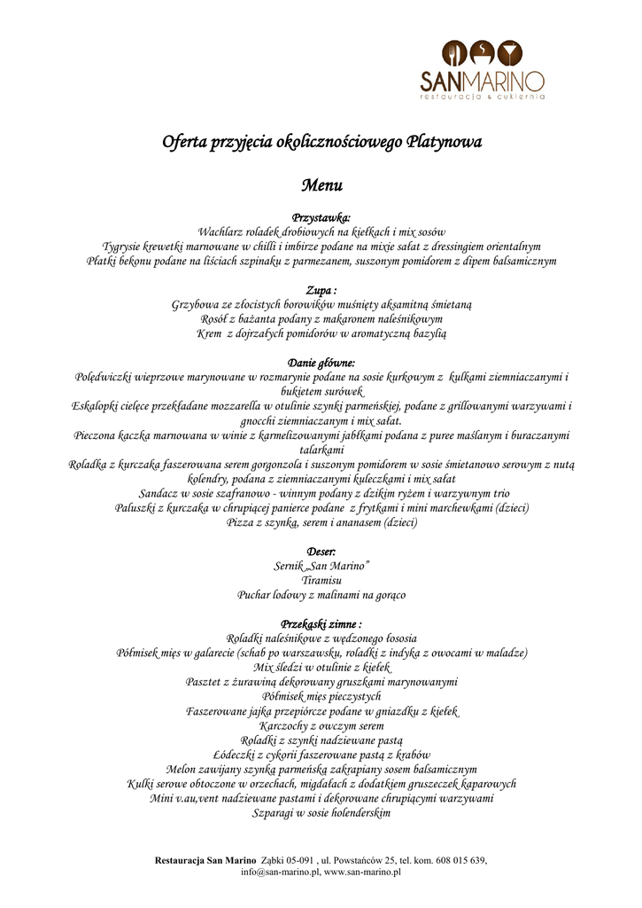 Oferta przyjęcia okolicznościowego Platynowa Menu Przystawka: Wachlarz roladek drobiowych na kiełkach i mix sosów Tygrysie krewetki marnowane w chilli i imbirze podane na mixie sałat z dressingiem orientalnym Płatki bekonu podane na liściach szpinaku z parmezanem, suszonym pomidorem z dipem balsamicznym Zupa : Grzybowa ze złocistych borowików muśnięty aksamitną śmietaną Rosół z bażanta podany z makaronem naleśnikowym Krem z dojrzałych pomidorów w aromatyczną bazylią Danie główne: Polędwiczki wieprzowe marynowane w rozmarynie podane na sosie kurkowym z kulkami ziemniaczanymi i bukietem surówek Eskalopki cielęce przekładane mozzarella w otulinie szynki parmeńskiej, podane z grillowanymi warzywami i gnocchi ziemniaczanym i mix sałat. Pieczona kaczka marnowana w winie z karmelizowanymi jabłkami podana z puree maślanym i buraczanymi talarkami Roladka z kurczaka faszerowana serem gorgonzola i suszonym pomidorem w sosie śmietanowo serowym z nutą kolendry, podana z ziemniaczanymi kuleczkami i mix sałat Sandacz w sosie szafranowo - winnym podany z dzikim ryżem i warzywnym trio Paluszki z kurczaka w chrupiącej panierce podane z frytkami i mini marchewkami (dzieci) Pizza z szynką, serem i ananasem (dzieci) Deser: Sernik „San Marino” Tiramisu Puchar lodowy z malinami na gorąco Przekąski zimne : Roladki naleśnikowe z wędzonego łososia Półmisek mięs w galarecie (schab po warszawsku, roladki z indyka z owocami w maladze) Mix śledzi w otulinie z kiełek Pasztet z żurawiną dekorowany gruszkami marynowanymi Półmisek mięs pieczystych Faszerowane jajka przepiórcze podane w gniazdku z kiełek Karczochy z owczym serem Roladki z szynki nadziewane pastą Łódeczki z cykorii faszerowane pastą z krabów Melon zawijany szynką parmeńską zakrapiany sosem balsamicznym Kulki serowe obtoczone w orzechach, migdałach z dodatkiem gruszeczek kaparowych Mini v.au,vent nadziewane pastami i dekorowane chrupiącymi warzywami Szparagi w sosie holenderskim Restauracja San Marino Ząbki 05-091 , ul. Powstańców 25, tel. kom. 608 015 639, [email protected], www.san-marino.pl Roladka z łososia marynowanego w wini Sałatki: Szpinakowa z pesto pomidorowym i mozzarellą Meksykańska z salami Sałatka z grillowanym kurczakiem, mix sałat i kiełków z anchois i dipem miodowo musztardowym Sałatka z wędzonym łososiem, mix sałat z owocami Tradycyjna sałatka jarzynowa z jajkiem Endywia z rucolą i dojrzałą figą z dressingiem malinowym Sałatka z krewetek tygrysich w stylu orientalnym z zieloną fasolką i dressingiem z limonki i chilli Z podanego wyżej menu należy wybrać: Przystawka x 1 Zupa x 1 dorosły / dziecko Danie główne x 1 dorosły / dziecko Deser x 1 dorosły / dziecko Przekąski zimne x 5 Sałatki x 2 W kosz wliczono: pieczywo, marynaty, warzywa sezonowe. Zapewniamy: przygotowanie sali, aranżacja stołu, zastawa porcelanowa, obsługa kelnerska, serwis, krzesła z pokrowcami / w Sali Kryształowej Koszt dziecka do 3 lat siedzącego z rodzicami bezpłatny, od 3 do 10 lat 60% kosztu przyjęcia osoba. W naszej Cukierni zostanie przygotowany dla Państwa dzieci kącik zabaw z animatorami i zapewnią im dobrą zabawę. Koszt 140,00zł/osoba Koszty dodatkowe: Napoje: kawa, herbata, soki, woda, softy gazowane x 25,00zł/osoba – bez limitu Ciasta i owoce filetowane x 15,00zł/osoba – bez limitu Tort z naszej cukierni od 45,00zł/kg Restauracja San Marino Ząbki 05-091 , ul. Powstańców 25, tel. kom. 608 015 639, [email protected], www.san-marino.pl