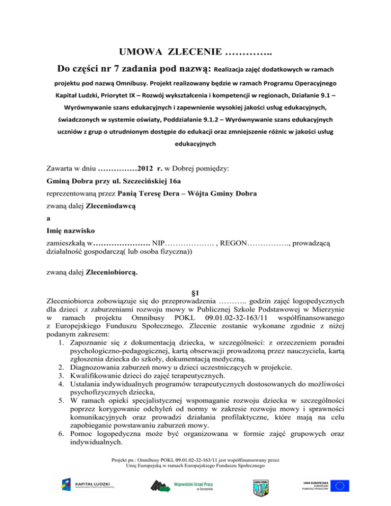 UMOWA ZLECENIE ………….. Do części nr 7 zadania pod nazwą: Realizacja zajęć dodatkowych w ramach projektu pod nazwą Omnibusy. Projekt realizowany będzie w ramach Programu Operacyjnego Kapitał Ludzki, Priorytet IX – Rozwój wykształcenia i kompetencji w regionach, Działanie 9.1 – Wyrównywanie szans edukacyjnych i zapewnienie wysokiej jakości usług edukacyjnych, świadczonych w systemie oświaty, Poddziałanie 9.1.2 – Wyrównywanie szans edukacyjnych uczniów z grup o utrudnionym dostępie do edukacji oraz zmniejszenie różnic w jakości usług edukacyjnych Zawarta w dniu ……………2012 r. w Dobrej pomiędzy: Gminą Dobra przy ul. Szczecińskiej 16a reprezentowaną przez Panią Teresę Dera – Wójta Gminy Dobra zwaną dalej Zleceniodawcą a Imię nazwisko zamieszkałą w …………………. NIP………………. , REGON……………., prowadzącą działalność gospodarczą( lub osoba fizyczna)) zwaną dalej Zleceniobiorcą. §1 Zleceniobiorca zobowiązuje się do przeprowadzenia ……….. godzin zajęć logopedycznych dla dzieci z zaburzeniami rozwoju mowy w Publicznej Szkole Podstawowej w Mierzynie w ramach projektu Omnibusy POKL 09.01.02-32-163/11 współfinansowanego z Europejskiego Funduszu Społecznego. Zlecenie zostanie wykonane zgodnie z niżej podanym zakresem: 1. Zapoznanie się z dokumentacją dziecka, w szczególności: z orzeczeniem poradni psychologiczno-pedagogicznej, kartą obserwacji prowadzoną przez nauczyciela, kartą zgłoszenia dziecka do szkoły, dokumentacją medyczną. 2. Diagnozowania zaburzeń mowy u dzieci uczestniczących w projekcie. 3. Kwalifikowanie dzieci do zajęć terapeutycznych. 4. Ustalania indywidualnych programów terapeutycznych dostosowanych do możliwości psychofizycznych dziecka, 5. W ramach opieki specjalistycznej wspomaganie rozwoju dziecka w szczególności poprzez korygowanie odchyleń od normy w zakresie rozwoju mowy i sprawności komunikacyjnych oraz prowadzi działania profilaktyczne, które mają na celu zapobieganie powstawaniu zaburzeń mowy. 6. Pomoc logopedyczna może być organizowana w formie zajęć grupowych oraz indywidualnych. Projekt pn.: Omnibusy POKL 09.01.02-32-163/11 jest współfinansowany przez Unię Europejską w ramach Europejskiego Funduszu Społecznego 7. Prowadzenia, w ramach swojej pracy, doradztwa pedagogiczno-logopedycznego zatrudnionym w szkole nauczycielom. 8. Współpracy z zatrudnionymi w szkole nauczycielami, psychologiem, uczestnictwa w posiedzeniach zespołu specjalistów. 9. Ścisła współpraca z rodzicami w celu zminimalizowania zaburzeń rozwojowych w zakresie mowy u dzieci. 10. Prowadzenia dokumentacji zgodnie z obowiązującymi przepisami. 1) Sporządzanie list obecności oraz dokumentowania zajęć w dzienniku zajęć, w tym opisywania wykorzystywanych metod i form pracy w odniesieniu w odniesieniu do rozpoznanych indywidualnych potrzeb uczniów, zorganizowania testów wiedzy na zakończenie projektu, 2) Prowadzenie miesięcznych kart czasu pracy stanowiących załącznik nr 1 do umowy. Karty czasu pracy składane będą dyrektorom szkół celem zatwierdzenia liczby przeprowadzonych godzin zajęć, 3) Sporządzanie sprawozdań kwartalnych (zatwierdzonych przez dyrektora szkoła), z postępu realizacji danego rodzaju zajęć zawierających m. in. liczbę zrealizowanych godzin, zakres przedmiotowy zajęć, liczbę uczniów obecnych na poszczególnych zajęciach, wykorzystane środki dydaktyczne do realizacji zajęć; na wniosek koordynatora projektu, 4) Przygotowanie i przekazanie do dnia 29 czerwca 2012 r. dzienników zajęć oraz raportu podsumowującego okres realizacji danego rodzaju zajęć. 11. Zleceniobiorca oraz osoba prowadząca zajęcia ponoszą odpowiedzialność za bezpieczeństwo dzieci w czasie zajęć. 12. §2 Zajęcia prowadzone będą w Publicznej Szkole Podstawowej w Mierzynie w ilości …………….. godzin . §3 Zlecenie zostanie wykonane w terminie: do dnia 29.06.2012 r. §4 Za wykonanie zlecenia Zleceniobiorca otrzyma wynagrodzenie umowne w kwocie: zgodnie ze złożoną ofertą, zł brutto (słownie: …………………….złotych brutto) za 1 godzinę zajęć. Całkowita wartość niniejszej umowy ………… zł brutto §5 Wynagrodzenie płatne będzie po zrealizowaniu godzin zgodnie z ustalonym harmonogramem zajęć po zakończeniu miesiąca i przedstawieniu faktury wraz z podpisana przez dyrektora kartą pracy koordynatorowi projektu (adres biura projektu: Urząd Gminy w Wołczkowie ul. Projekt pn.: Omnibusy POKL 09.01.02-32-163/11jest współfinansowany przez Unię Europejską w ramach Europejskiego Funduszu Społecznego Lipowa 51), zapłata zostanie dokonana w ciągu 21dni od dnia otrzymania prawidłowo wystawionej faktury. Faktury należy wystawiać na Gminę Dobra, ul. Szczecińska 16a, 72-003 Dobra. Nip 8512948083, Regon 811685496. Z dopiskiem: Realizacja zajęć dodatkowych ( rodzaj i nazwa szkoły zgodnie z zawartą umową) w ramach projektu POKL pn: Omnibusy Projekt jest współfinansowany z Unii Europejskiej w ramach Europejskiego Funduszu Społecznego. Wynagrodzenie wykonawcy zostanie przekazane na jego rachunek bankowy o numerze……………………… §6 1. Umowa może zostać rozwiązana przez każdą ze stron z upływem okresu wypowiedzenia, który wynosi 1 miesiąc. 2. W przypadku stwierdzenia nieprawidłowości w wykonaniu zadań, o których mowa w § 1 Zleceniodawca może, po uprzednim wezwaniu Zleceniobiorcy do usunięcia nieprawidłowości, rozwiązać umowę bez wypowiedzenia. §7 1. W sprawach nie uregulowanych niniejszą umową mają zastosowanie odpowiednie przepisy Kodeksu Cywilnego. 2. Wszelkie zmiany niniejszej umowy wymagają formy pisemnej pod rygorem nieważności. §8 Umowę sporządzono w 2 jednobrzmiących egzemplarzach, po1 dla każdej ze stron. ………………………………… (zleceniobiorca) ………………………………… (zleceniodawca) Projekt pn.: Omnibusy POKL 09.01.02