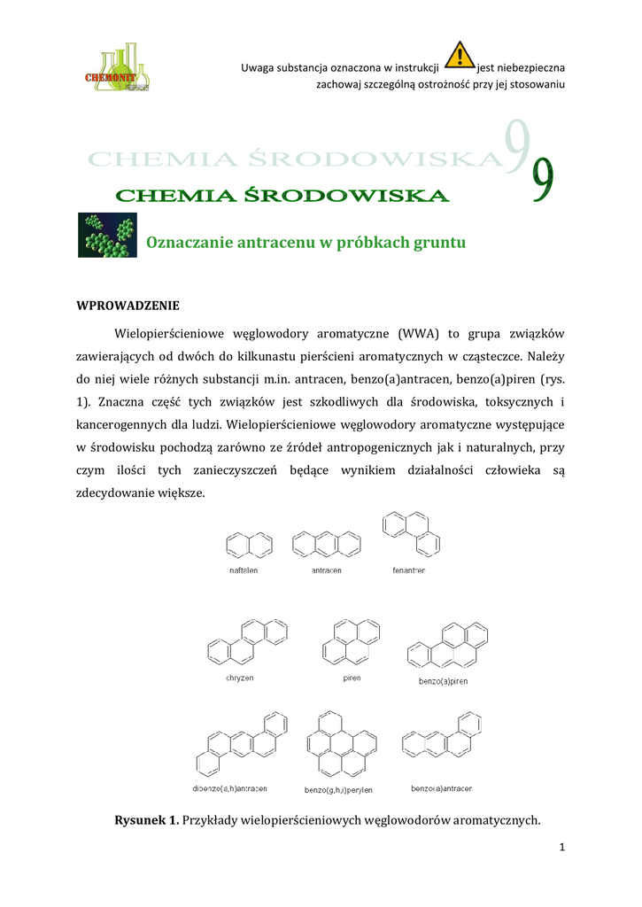 Uwaga substancja oznaczona w instrukcji jest niebezpieczna zachowaj szczególną ostrożność przy jej stosowaniu Oznaczanie antracenu w próbkach gruntu WPROWADZENIE Wielopierścieniowe węglowodory aromatyczne (WWA) to grupa związków zawierających od dwóch do kilkunastu pierścieni aromatycznych w cząsteczce. Należy do niej wiele różnych substancji m.in. antracen, benzo(a)antracen, benzo(a)piren (rys. 1). Znaczna część tych związków jest szkodliwych dla środowiska, toksycznych i kancerogennych dla ludzi. Wielopierścieniowe węglowodory aromatyczne występujące w środowisku pochodzą zarówno ze źródeł antropogenicznych jak i naturalnych, przy czym ilości tych zanieczyszczeń będące wynikiem działalności człowieka są zdecydowanie większe. Rysunek 1. Przykłady wielopierścieniowych węglowodorów aromatycznych. 1 Uwaga substancja oznaczona w instrukcji jest niebezpieczna zachowaj szczególną ostrożność przy jej stosowaniu Związki te powstają jako produkty uboczne w wielu procesach chemicznych, praktycznie każdy proces, związany z silnym ogrzewaniem lub niecałkowitym spalaniem związków organicznych, może być źródłem emisji WWA, również pozaprzemysłowym (spalarnie odpadów, pożary lasów, spaliny samochodowe). Źródłem WWA jest także palenie tytoniu, przy czym zarówno bierne jak i czynne palenie jest istotnym czynnikiem ryzyka nowotworowego. WWA są na ogół słabo rozpuszczalne w wodzie, mogą jednak tworzyć z wodą emulsje, są trwałe pod względem chemicznym i nie ulegają łatwo rozkładowi pod wpływem mikroorganizmów. Ponadto związki te gromadzą się w osadach, gdzie w warunkach beztlenowych ich rozkład jest dodatkowo spowolniony. Węglowodory aromatyczne mogą się kumulować w organizmach żywych, np. w tłuszczu i mięsie ryb i mięczaków. Bardzo często WWA są obecne również w wodach podziemnych, do których przenikają przez mało zwarte warstwy filtracyjne gruntu zanieczyszczając w ten sposób źródła wody pitnej. Analiza WWA w próbkach środowiskowych jest trudna i czasochłonna gdyż na ogół obecna jest duża liczba związków z tej grupy, występują one w małym stężeniu wspólnie z innymi zanieczyszczeniami organicznymi. Izolacja WWA z próbek wody i ścieków może być wykonana poprzez ekstrakcje: ciecz-ciecz, do fazy stałej, płynem w stanie nadkrytycznym czy też z wykorzystaniem membran półprzepuszczalnych. W przypadku analizy próbek gleby stosuje się ekstrakcję rozpuszczalnikiem. Najczęściej wykorzystywane są takie rozpuszczalniki jak: benzen, toluen, heksan lub mieszaninę heksan – aceton. Jeśli chodzi zaś o oznaczanie WWA w próbkach powietrza to przeprowadza się adsorpcję na odpowiednim filtrze, a następnie ekstrakcję rozpuszczalnikiem. Często stosowanym sposobem kontroli dokładności wyników analitycznych jest metoda odzysku. Realizuje się ją w ten sposób, że do kilku porcji tej samej próbki dodaje się znane, różne ilości wzorca oznaczanej substancji i przeprowadza procedurę analityczną. Stosowanie tej metody wymaga jednak zachowania środków ostrożności i rozwagi podczas wnioskowania, a także uwzględnienia jak najwięcej informacji na temat badanego układu. 2 Uwaga substancja oznaczona w instrukcji jest niebezpieczna zachowaj szczególną ostrożność przy jej stosowaniu Celem ćwiczenia jest oznaczenie odzysku antracenu z gleby. Odczynniki: Acetonitryl (czystość HPLC) roztwór 70%, heksan, aceton, antracen (roztwór wzorcowy o stężeniu 1 mg/cm3). Sprzęt laboratoryjny i aparatura pomiarowa: Probówki stożkowe z tworzywa sztucznego, pipety automatyczne, chromatograf cieczowy HP 1050 z detektorem UV/VIS. Sposób wykonania A. Wyznaczenie czasu retencji antracenu Antracen oznacza się poddając analizie chromatograficznej ekstrakt glebowy. Analizę wykonać z zastosowaniem wysokosprawnej chromatografii cieczowej (HPLC), chromatograf HP 1050 z detektorem UV/VIS, pętlą nastrzykową o objętości 20 mm3, kolumną chromatograficzną ze złożem C18 (Grace, 250 x 4,6 mm), sterowany oprogramowaniem Clarity. Fazę ruchomą stanowi roztwór acetonitrylu i wody (70:30 v/v), szybkość przepływu wynosi 1,5 cm3/min. Detekcję prowadzić przy długości fali 250 nm. Identyfikacji związku dokonać na podstawie zgodności czasu retencji z wzorcem. W tym celu przygotować w wialce chromatograficznej 1cm3 roztworu wzorcowego roboczego o stężeniu 50 µg/cm3 poprzez rozcieńczenie acetonitrylem roztworu wzorcowego podstawowego o stężeniu 1 mg/cm3 i przeprowadzić jego analizę chromatograficzną. B. Przygotowanie ekstraktu glebowego Przeprowadzić dwa równoległe oznaczenia Na wadze analitycznej odważyć po 5 g wysuszonej na powietrzu i rozdrobnionej gleby, przenieść ją do plastikowych probówek (a, b). Następnie pipetą automatyczną dodać do każdej z nich 50,0 mm3 roztworu podstawowego antracenu o stężeniu 1 mg/cm3 i po 2,5 cm3 acetonu i heksanu. Wytrząsać przez 10 min. Próbki odstawić na kilkanaście minut, aż osad ulegnie sedymentacji. Pobrać do strzykawek 2 cm3 ekstraktów, przesączyć przez 3 Uwaga substancja oznaczona w instrukcji jest niebezpieczna zachowaj szczególną ostrożność przy jej stosowaniu filtr 0,45 µm do wialek chromatograficznych (1a i 1b). Przeprowadzić chromatograficzne oznaczanie antracenu. C. Oznaczanie zawartości antracenu Aby wyznaczyć stężenia badanego analitu w ekstraktach glebowych wykorzystać metodę dodatku wzorca, która polega na dodaniu do próbki znanych ilości substancji oznaczanych (zwykle 50 – 150% oczekiwanej zawartości oznaczanej substancji). W tym celu do wialek chromatograficznych (2a i 2b) przenieść przy pomocy pipety automatycznej 100 mm3 przefiltrowanych ekstraktów z gleby oraz 100 mm3 roztworu wzorcowego o stężeniu 50 µg/cm3 i po dokładnym wymieszaniu wprowadzić do kolumny chromatograficznej. Opracowanie wyników 1. Na podstawie uzyskanych sygnałów AG (pole powierzchni piku