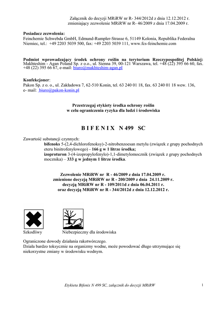 Załącznik do decyzji MRiRW nr R- 344/2012d z dnia 12.12.2012 r. zmieniający zezwolenie MRiRW nr R- 46/2009 z dnia 17.04.2009 r. Posiadacz zezwolenia: Feinchemie Schwebda GmbH, Edmund-Rumpler-Strasse 6, 51149 Kolonia, Republika Federalna Niemiec, tel.: +49 2203 5039 500, fax: +49 2203 5039 111, www.fcs-feinchemie.com Podmiot wprowadzający środek ochrony roślin na terytorium Rzeczypospolitej Polskiej: Makhteshim - Agan Poland Sp. z o.o., ul. Sienna 39, 00-121 Warszawa, tel. +48 (22) 395 66 60, fax. +48 (22) 395 66 67, e-mail: [email protected] Konfekcjoner: Pakon Sp. z o. o., ul. Zakładowa 7, 62-510 Konin, tel. 63 240 01 18, fax. 63 240 01 18 wew. 136, e- mail: [email protected] Przestrzegaj etykiety środka ochrony roślin w celu ograniczenia ryzyka dla ludzi i środowiska B I F E N I X N 499 SC Zawartość substancji czynnych: bifenoks 5-(2,4-dichlorofenoksy)-2-nitrobenzoesan metylu (związek z grupy pochodnych eteru binitrofenylowego) - 166 g w 1 litrze środka; izoproturon 3-(4-izopropylofenylo)-1,1-dimetylomocznik (związek z grupy pochodnych mocznika) – 333 g w jednym 1 litrze środka. Zezwolenie MRiRW nr R - 46/2009 z dnia 17.04.2009 r. zmienione decyzją MRiRW nr R - 200/2009 z dnia 24.11.2009 r. decyzją MRiRW nr R - 109/2011d z dnia 06.04.2011 r. oraz decyzją MRiRW nr R - 344/2012d z dnia 12.12.2012 r. Szkodliwy Niebezpieczny dla środowiska Ograniczone dowody działania rakotwórczego. Działa bardzo toksycznie na organizmy wodne, może powodować długo utrzymujące się niekorzystne zmiany w środowisku wodnym. Etykieta Bifenix N 499 SC, załącznik do decyzji MRiRW 1 Uwaga! 1. Zabrania się stosowania środka w strefie bezpośredniej ochrony ujęć wody oraz na terenie uzdrowisk, otulin parków narodowych i rezerwatów. 2. Nie zanieczyszczać wód środkiem ochrony roślin lub jego opakowaniem. I OPIS DZIAŁANIA Bifenix N 499 SC jest środkiem chwastobójczym w formie koncentratu stężonej zawiesiny do rozcieńczania wodą, stosowanym nalistnie, przeznaczonym do wiosennego zwalczania jednorocznych chwastów dwuliściennych i miotły zbożowej w pszenicy ozimej. II DZIAŁANIE NA CHWASTY Środek działa kontaktowo i systemicznie, jest pobierany przez liście, kiełki oraz korzenie chwastów. Najlepiej zwalcza chwasty we wczesnych fazach rozwoju. Substancja aktywna – bifenoks jest inhibitorem oksydazy protoporfirynogenu (PPO), po jej wniknięciu rośliny wykazują dużą wrażliwość na światło. W wyniku działania bifenoksu zakłóceniu ulega proces fotosyntezy, następnie zniszczeniu ulegają ściany komórkowe i w efekcie następuje zasychanie chwastów. Chwasty wrażliwe np.: fiołek polny, gwiazdnica pospolita, jasnota purpurowa, jasnota różowa, mak polny, miotła zbożowa, niezapominajka polna, przetacznik ożankowy, przetacznik trójlistkowy, przetacznik polny, rdest powojowy, rumianowate, tasznik pospolity, tobołki polne. Chwasty średnio wrażliwe np.: poziewnik szorstki. Chwasty odporne np.: mlecz zwyczajny, przytulia czepna, chwasty wieloletnie. III ZAKRES STOSOWANIA, TERMINY I DAWKI ROŚLINY ROLNICZE 1. PSZENICA OZIMA Środek stosować wiosną od momentu ruszenia wegetacji, gdy zboża znajdują się w fazie od 3- 5 liści do końca fazy krzewienia. Zalecana dawka: 4,5 l/ha Uwaga Mogą wystąpić przemijające objawy fitotoksycznego działania szczególnie po zastosowaniu wyższej z zlecanych dawek, które nie mają wpływu na plon. Zalecana ilość wody: 200-300 l/ha. Zalecane opryskiwanie: średniokropliste. NASTĘPSTWO ROŚLIN Środek rozkłada się w glebie w ciągu okresu wegetacji nie stwarzając zagrożenia dla roślin uprawianych następczo. Etykieta Bifenix N 499 SC, załącznik do decyzji MRiRW 2 IV OKRES KARENCJI okres od dnia ostatniego zabiegu do dnia zbioru roślin przeznaczonych do konsumpcji. NIE DOTYCZY V OKRES PREWENCJI DLA LUDZI, ZWIERZĄT, PSZCZÓŁ okres zapobiegający zatruciu. NIE DOTYCZY VI PRZECIWWSKAZANIA Środka nie stosować: − na rośliny mokre, chore i uszkodzone. − w zbożach z wsiewką roślin motylkowatych − w temperaturze powietrza poniżej 4oC i powyżej 25˚C − w czasie nadmiernej suszy − po nocnych przymrozkach oraz przed spodziewanymi przymrozkami VII SPORZĄDZANIE CIECZY UŻYTKOWEJ Przed przystąpieniem do sporządzania cieczy użytkowej dokładnie ustalić potrzebną jej ilość. Zawartością opakowania przed użyciem wstrząsnąć. Odmierzoną ilość środka wlać do zbiornika opryskiwacza napełnionego częściowo wodą (z włączonym mieszadłem) i uzupełnić wodą do potrzebnej ilości. Po wlaniu środka do zbiornika opryskiwacza nie wyposażonego w mieszadło hydrauliczne ciecz w zbiorniku mechanicznie wymieszać. Opróżnione opakowania przepłukać trzykrotnie wodą, a popłuczyny wlać do zbiornika opryskiwacza z cieczą użytkową. W przypadku przerw w opryskiwaniu przed ponownym przystąpieniem do pracy należy dokładnie wymieszać ciecz użytkową w zbiorniku opryskiwacza. Po pracy aparaturę dokładnie wymyć. VIII PRZECHOWYWANIE Przechowywać z dala od źródeł ciepła. Przechowywać wyłącznie w oryginalnym opakowaniu w temperaturze nie niższej niż 0 oC i nie wyższej niż 30oC. Przechowywać pod zamknięciem i chronić przed dziećmi. Nie przechowywać razem z żywnością, napojami i paszami dla zwierząt. IX WARUNKI BEZPIECZNEGO STOSOWANIA ŚRODKA − Nie jeść i nie pić oraz nie palić tytoniu podczas stosowania środka. − Nie wdychać rozpylonej cieczy użytkowej. − Nosić odpowiednią odzież ochronną, odpowiednie rękawice ochronne i okulary lub ochronę twarzy. − W razie połknięcia niezwłocznie zasięgnij porady lekarza - pokaż opakowanie lub etykietę. Etykieta Bifenix N 499 SC, załącznik do decyzji MRiRW 3 − Resztki cieczy użytkowej rozcieńczyć wodą i wypryskać na powierzchni poprzednio opryskiwanej. Wodę użytą do mycia aparatury wypryskać na powierzchni uprzednio opryskiwanej, stosując te same środki ochrony osobistej. − Rozproszenie rozc