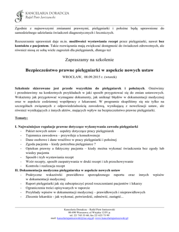 Zgodnie z najnowszymi zmianami prawnymi, pielęgniarki i położne będą uprawnione do samodzielnego udzielania świadczeń diagnostycznych i leczniczych. Rozszerzenie uprawnień daje m.in. możliwości wystawiania recept przez pielęgniarki, nawet bez kontaktu z pacjentem. Takie rozwiązania mają zwiększać dostępność do świadczeń zdrowotnych, ale również niosą ze sobą wiele zagrożeń dla pielęgniarek, dlatego też Zapraszamy na szkolenie Bezpieczeństwo prawne pielęgniarki w aspekcie nowych ustaw WROCŁAW, 08.09.2015 r. (wtorek) Szkolenie skierowane jest przede wszystkim do pielęgniarek i położnych. Omówimy i przedstawimy na konkretnych przykładach w jaki sposób przygotować się do zmian ustawowych. Wskażemy jak przygotować wymagane dokumenty, jak uniknąć błędów w dokumentacji medycznej oraz w aspekcie codziennej współpracy z lekarzami. W programie skupiliśmy się nie tylko na szczegółach związanych z odpowiedzialnością zawodową, wynikającą z nowelizacji ustaw, ale również wynikających z innych aktów, mających wpływ na bezpieczeństwo prawne pielęgniarki. Tematy: I. Najważniejsze regulacje prawne dotyczące wykonywania zawodu pielęgniarki - Pakiet nowych ustaw – aspekty dotyczące pracy pielęgniarek - Tajemnica zawodowa – przywileje a konsekwencje - Dane osobowe i dane wrażliwe w pracy pielęgniarki i położnej - Zgoda pacjenta – kiedy potrzebna pielęgniarce ? - Opiekun prawny a faktyczny pacjenta – kiedy można wykonać świadczenia bez zgody lub wiedzy pacjenta - Sposób i tryb wystawiania recept - Wzór recepty, sposób zaopatrywania w druki recept i ich przechowywanie - Kontrola i realizacja recept II. Dokumentacja medyczna pielęgniarska w aspekcie nowych ustaw - Praktyczne wskazówki prawidłowo sporządzonego raportu oraz innych wpisów w dokumentacji medycznej - Raport pielęgniarki jak się zabezpieczyć przed roszczeniami pacjentów i lekarzy - Ograniczenia treści opisywanych w raporcie - Przykłady wpisów w dokumentacji medycznej – prawidłowych i nieprawidłowych - Zlecenie lekarskie - jak wykonać, potwierdzić, odmówić, zastąpić... Kancelaria Doradcza – Rafał Piotr Janiszewski 00-490 Warszawa; ul Wiejska 12/IV p. tel. 22/ 745 53 60; fax 22/ 625 73 99 mail: [email protected]; www.kancelariajaniszewski.pl Informacje organizacyjne: Termin szkolenia: 08.09.2015 r. (wtorek) Czas trwania: 9:00 – 15:00 Miejsce: Hotel Ibis Styles Wrocław Centrum, ul. Plac Konstytucji 3 Maja nr 3, 50-083 Wrocław 300 m od stacji PKP Dworzec Główny Wrocław Zgłoszenia można wysyłać do: 3 września 2015 r. (czwartek) na nasz fax: (022) 625 73 99 bądź na adres e-mail: [email protected] Po otrzymaniu zgłoszenia wystawimy Państwu fakturę pro-forma z danymi potrzebnymi do płatności. Następnie, po otrzymaniu Państwa wpłaty – wystawiamy fakturę VAT, wysyłamy pocztą na wskazany adres. Liczba miejsc ograniczona ! Koszt uczestnictwa: 150 zł – cena regularna 100 zł – dla uczestników szkolenia w Warszawie z dnia 19 czerwca 2015 r. oraz dla placówek zgłaszających minimum 3 osoby Ośrodki, które mają podpisaną umowę z NFZ nie muszą powiększać podanej kwoty o VAT, gdyż usługi szkoleniowe finansowane ze środków publicznych są zwolnione z podatku. Na Państwa pytania odpowie Pani Katarzyna Moczulska pod numerem tel.: 0 607 407 202. Kancelaria Doradcza – Rafał Piotr Janiszewski 00-490 Warszawa; ul Wiejska 12/IV p. tel. 22/ 745 53 60; fax 22/ 625 73 99 mail: [email protected]; www.kancelariajaniszewski.pl FORMULARZ ZGŁOSZENIA UDZIAŁU W SZKOLENIU Miejsce: Hotel Ibis Styles Wrocław Centrum, ul. Plac Konstytucji 3 Maja nr 3, 50-083 Wrocław Termin: 8 września 2015 r. Dane placówki zgłaszającego: Nazwa i adres placówki, dane do faktury pro-forma, w tym NIP: Telefon do uczestnika szkolenia: E-mail (na który wyślemy dane dotyczące płatności i materiały szkoleniowe): Imię i nazwisko uczestnika: Stanowisko: 1. 2. 3. 4. 5. Ogólne zasady uczestnictwa: 1. Udział w szkoleniu należy potwierdzić najpóźniej do 3 września 2015 r. 2. Wypełniony formularz zgłoszeniowy prosimy przesłać na nr faksu (022) 625 73 99 lub za pomocą poczty elektronicznej: [email protected] 3. Liczba miejsc w szkoleniu jest ograniczona. Zastrzegamy sobie możliwość zamknięcia listy uczestników przed wskazanym terminem zgłoszeń z uwagi na brak miejsc (duża ilość zgłoszeń). 4. Prosimy o dokonanie płatności przed datą rozpoczęcia szkolenia. Imię i nazwisko osoby akceptującej udział w szkoleniu: ______________________________ _________.2015 r. Data ______________________________ Pieczątka i podpis osoby akceptującej Kancelaria Doradcza – Rafał Piotr Janiszewski 00-490 Warszawa; ul Wiejska 12/IV p. tel. 22/ 745 53 60; fax 22/ 625 73 99 mail: [email protected]; www.kancelariajaniszewski.pl